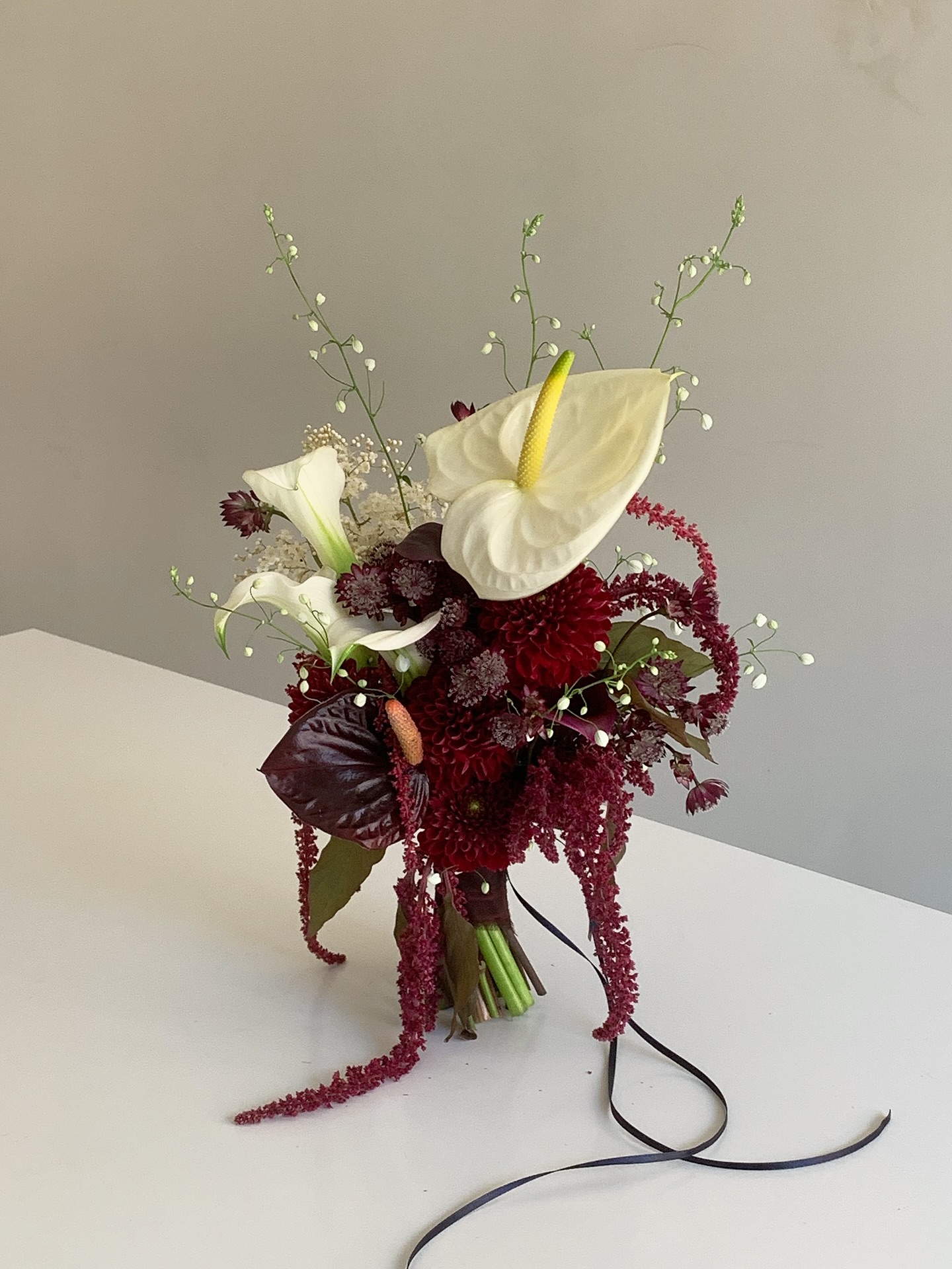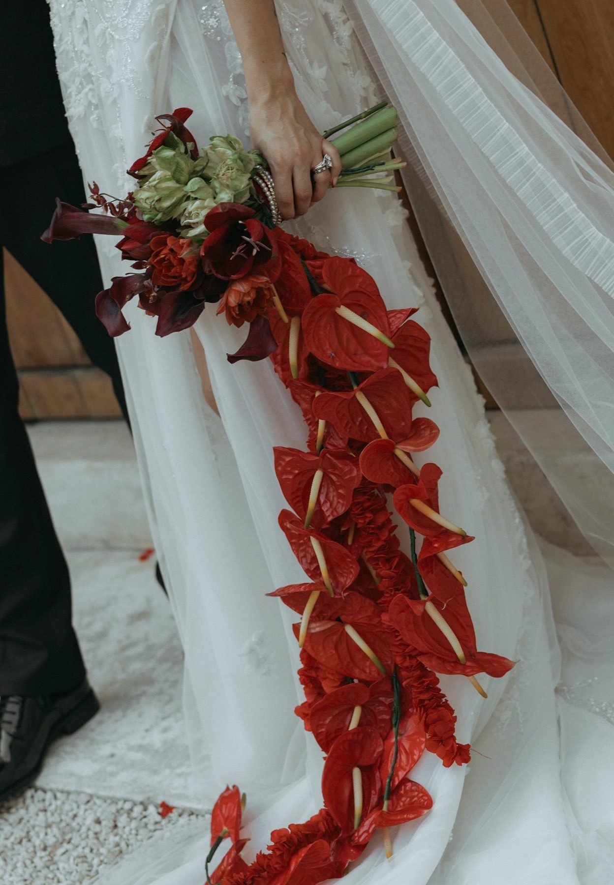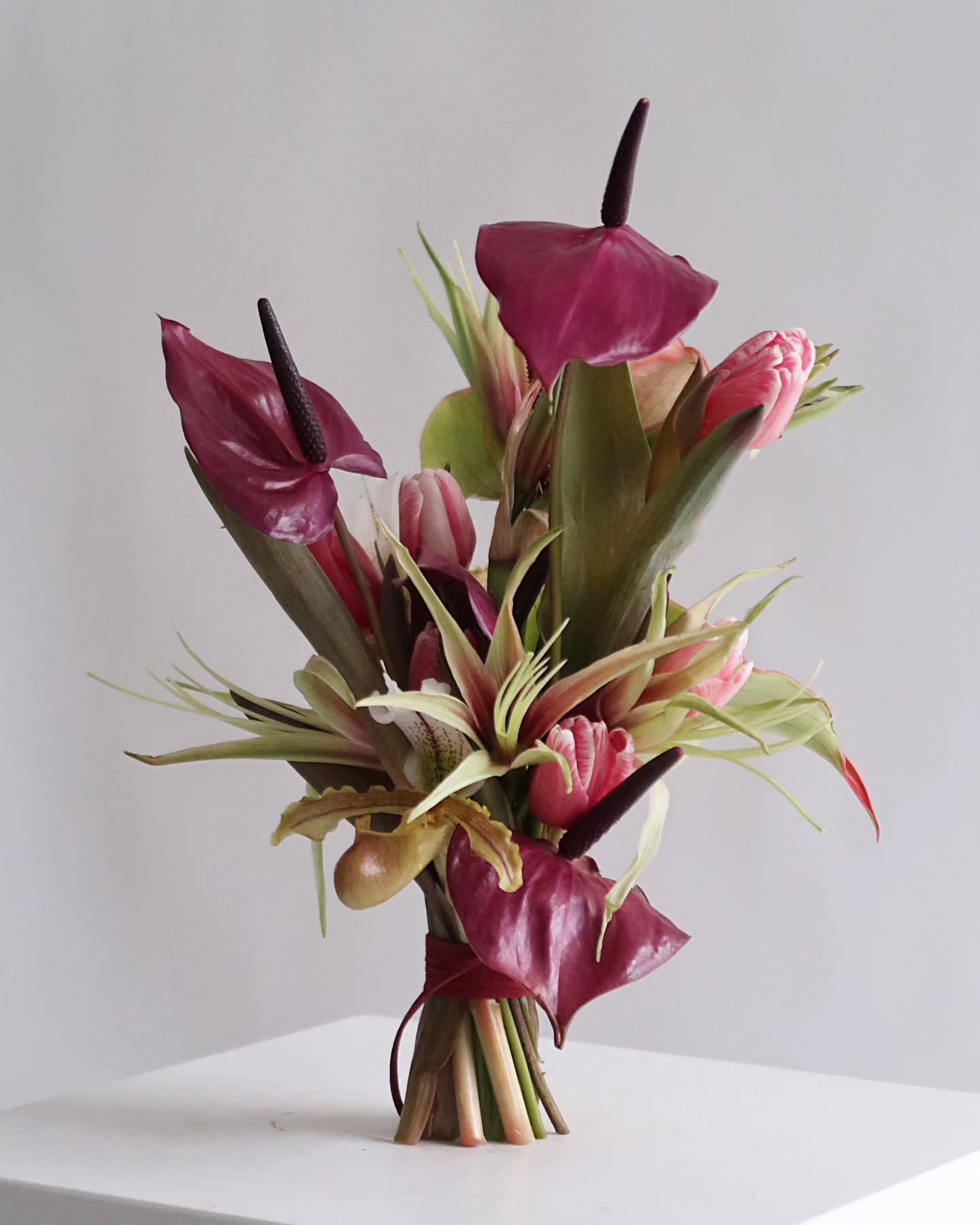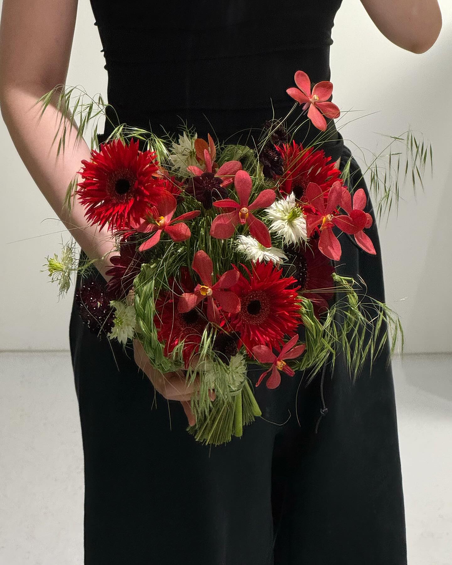 Букет в стиле бохо может быть объёмным и очень разнообразным по составу. Используй в нём протею, антуриум, плоды граната и сухоцветы. Подробнее про эстетику современного бохо в свадьбах читай в нашей статье.