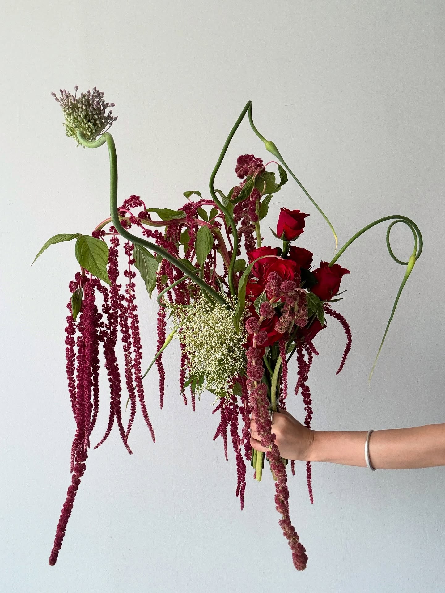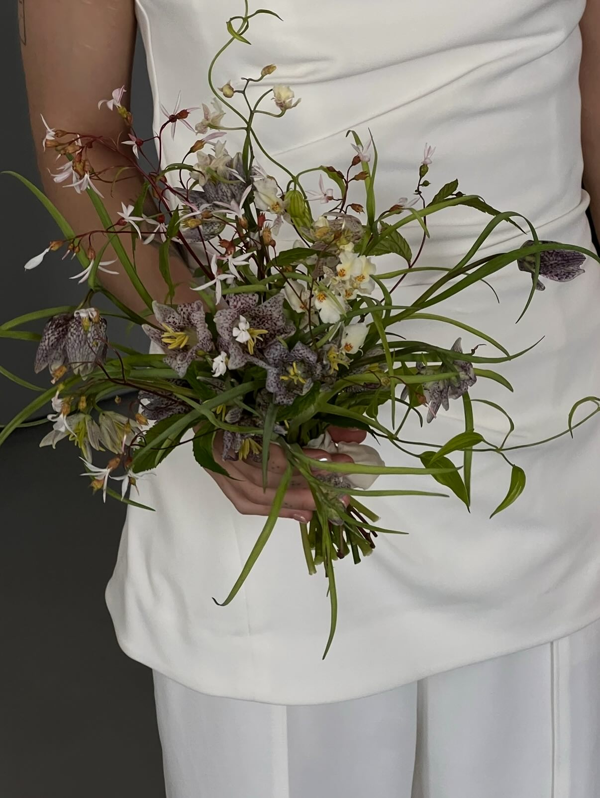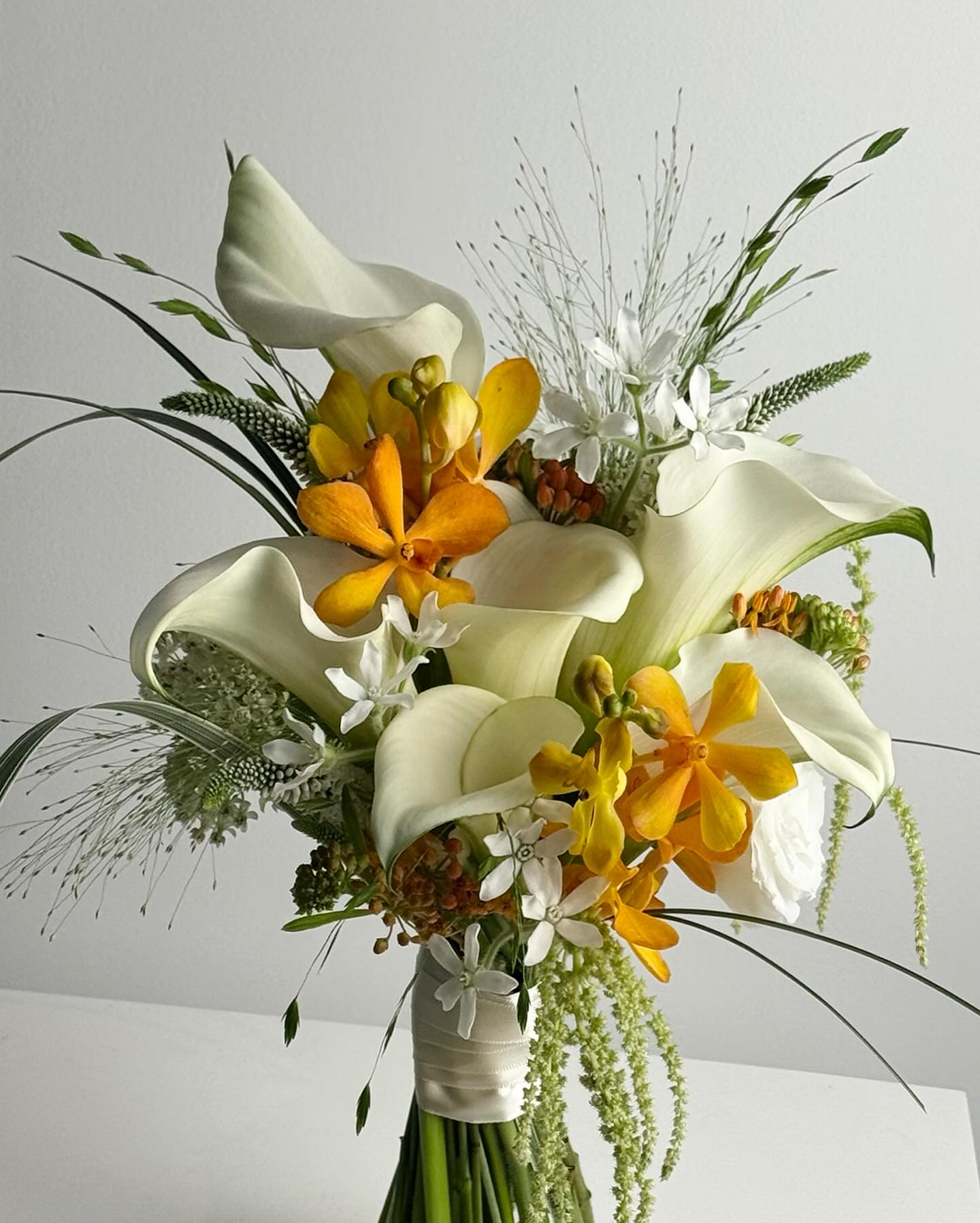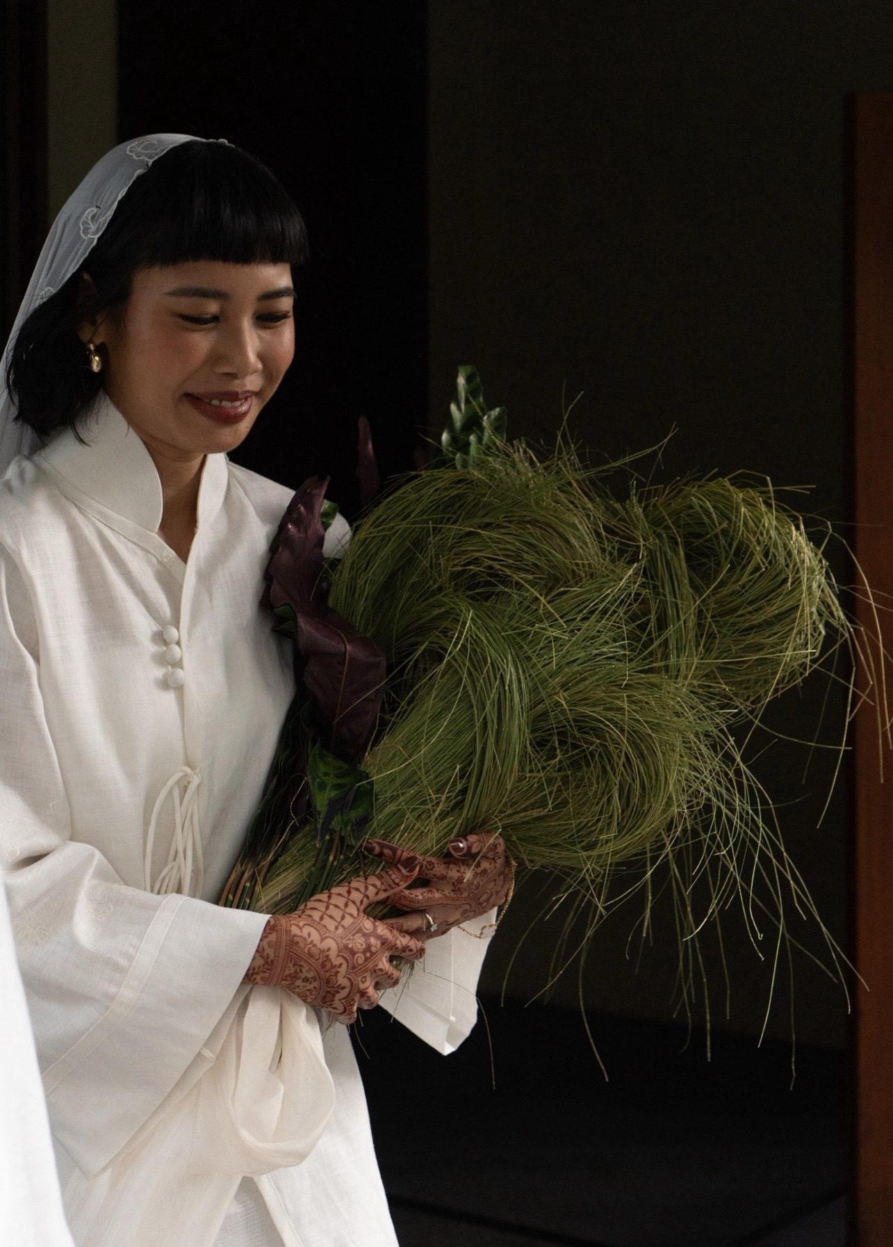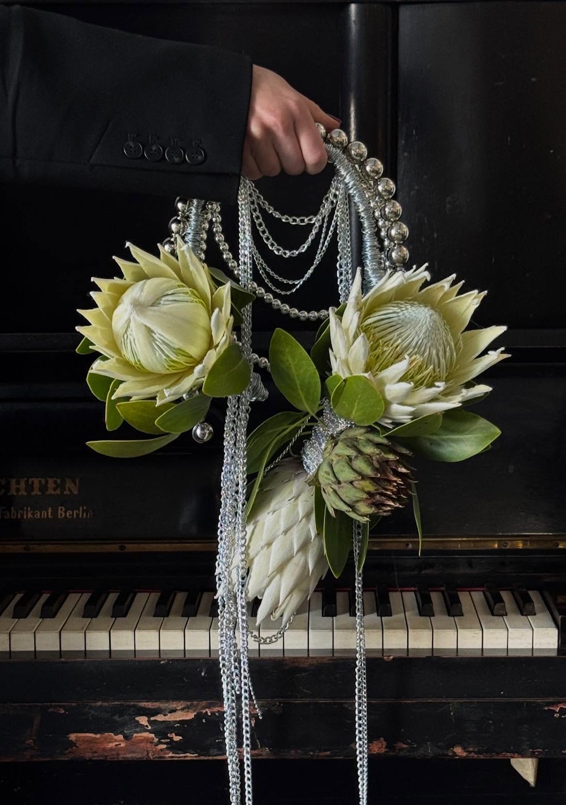 Букет в стиле бохо может быть объёмным и очень разнообразным по составу. Используй в нём протею, антуриум, плоды граната и сухоцветы. Подробнее про эстетику современного бохо в свадьбах читай в нашей статье.