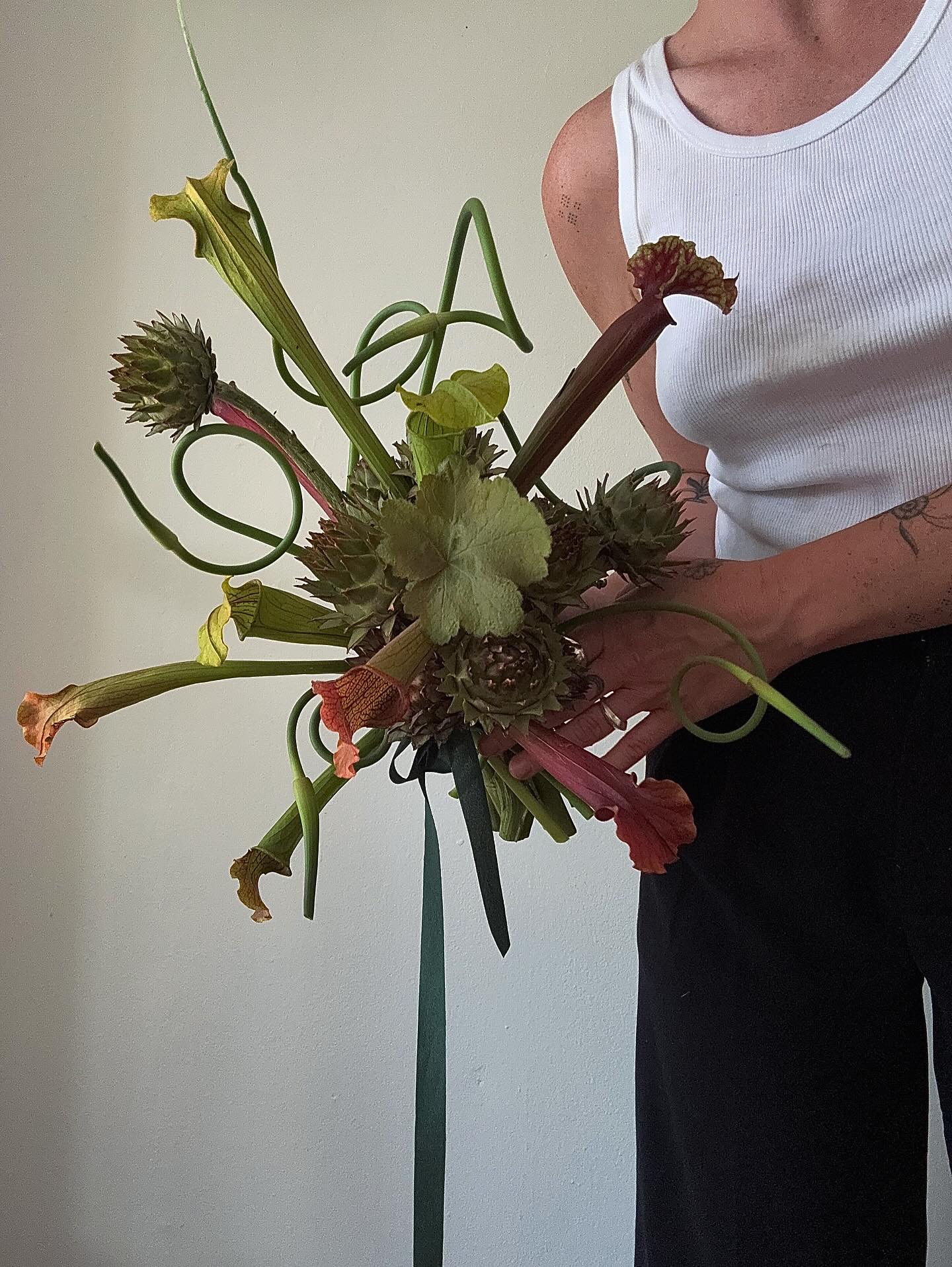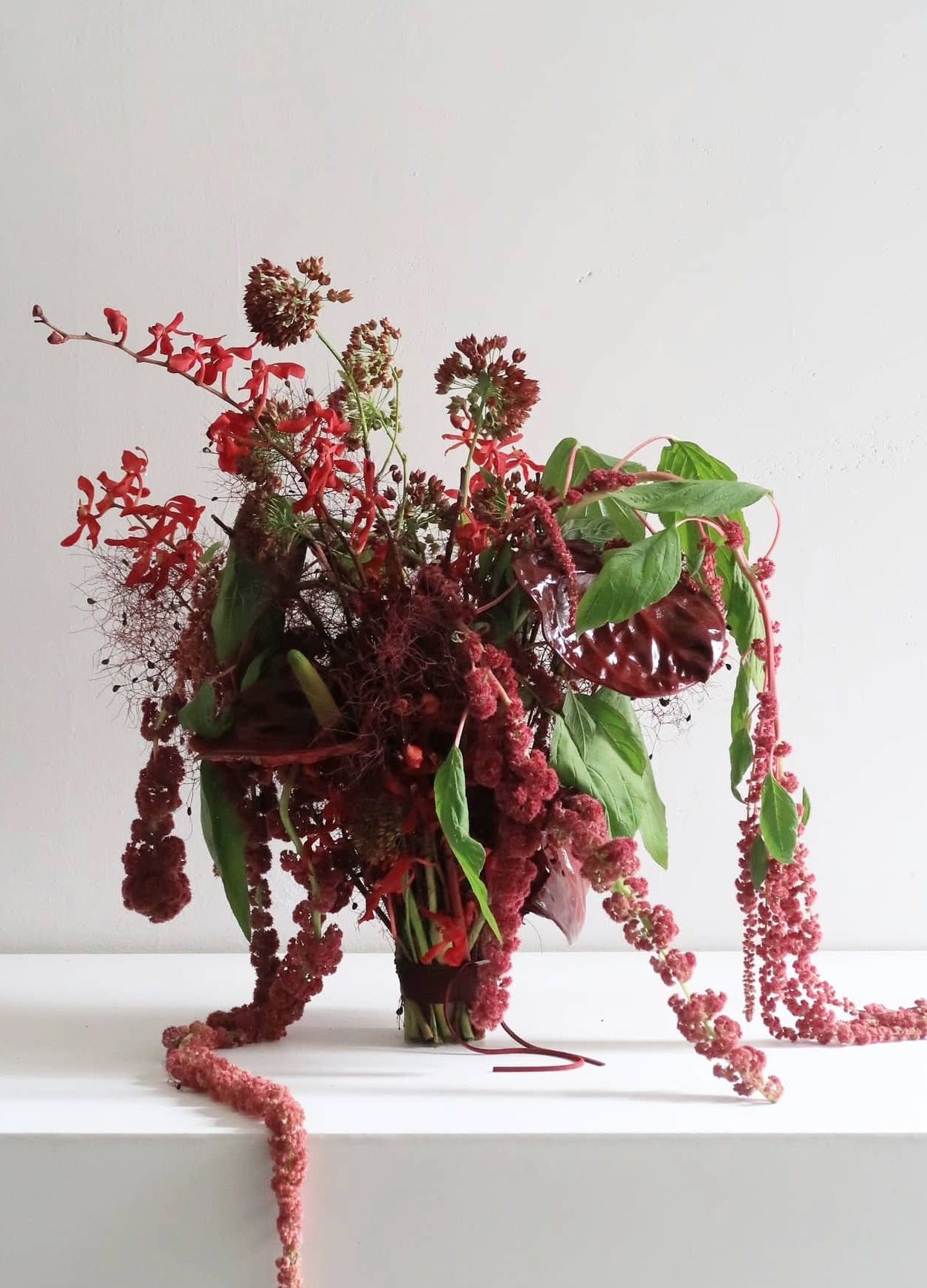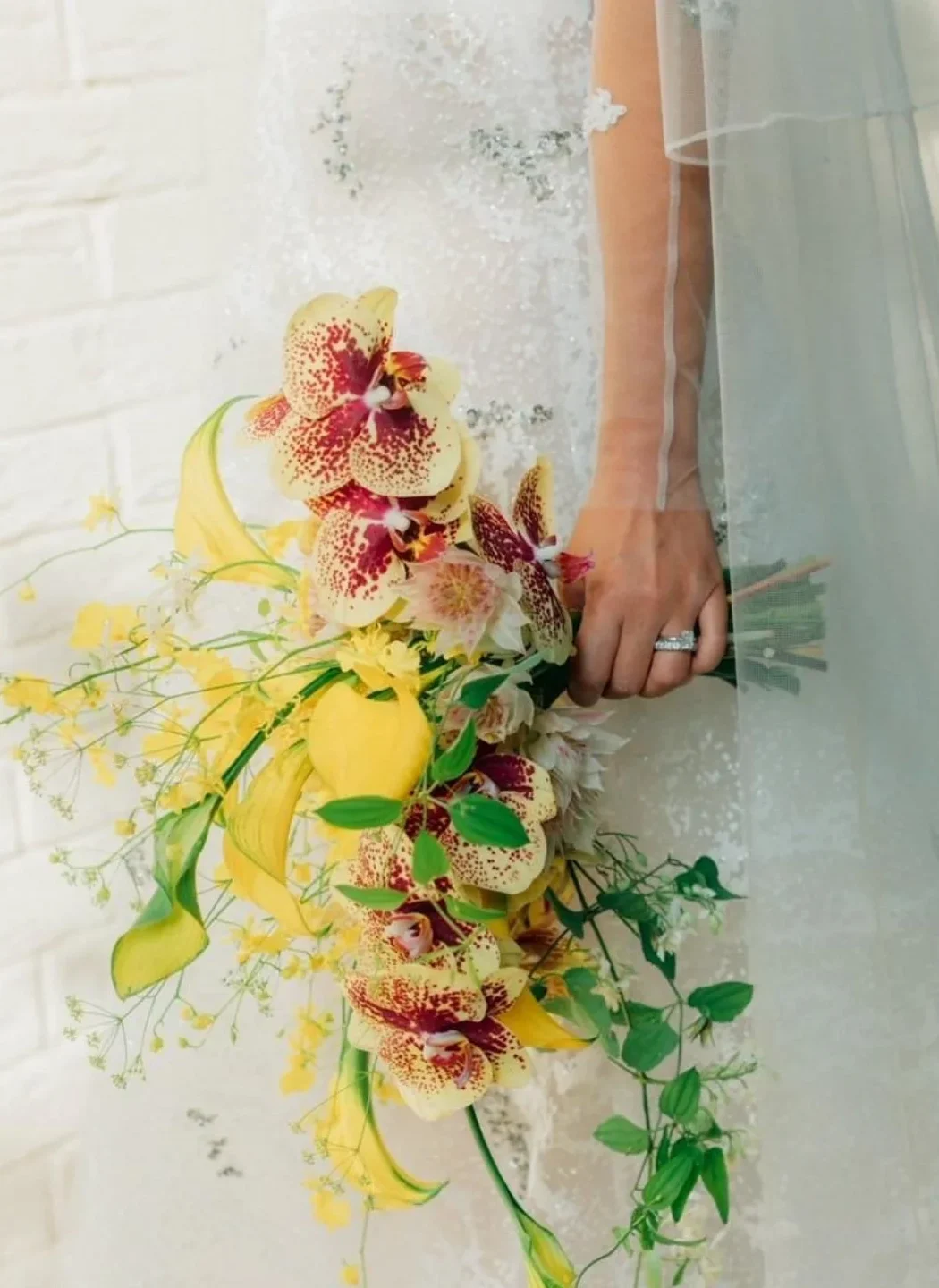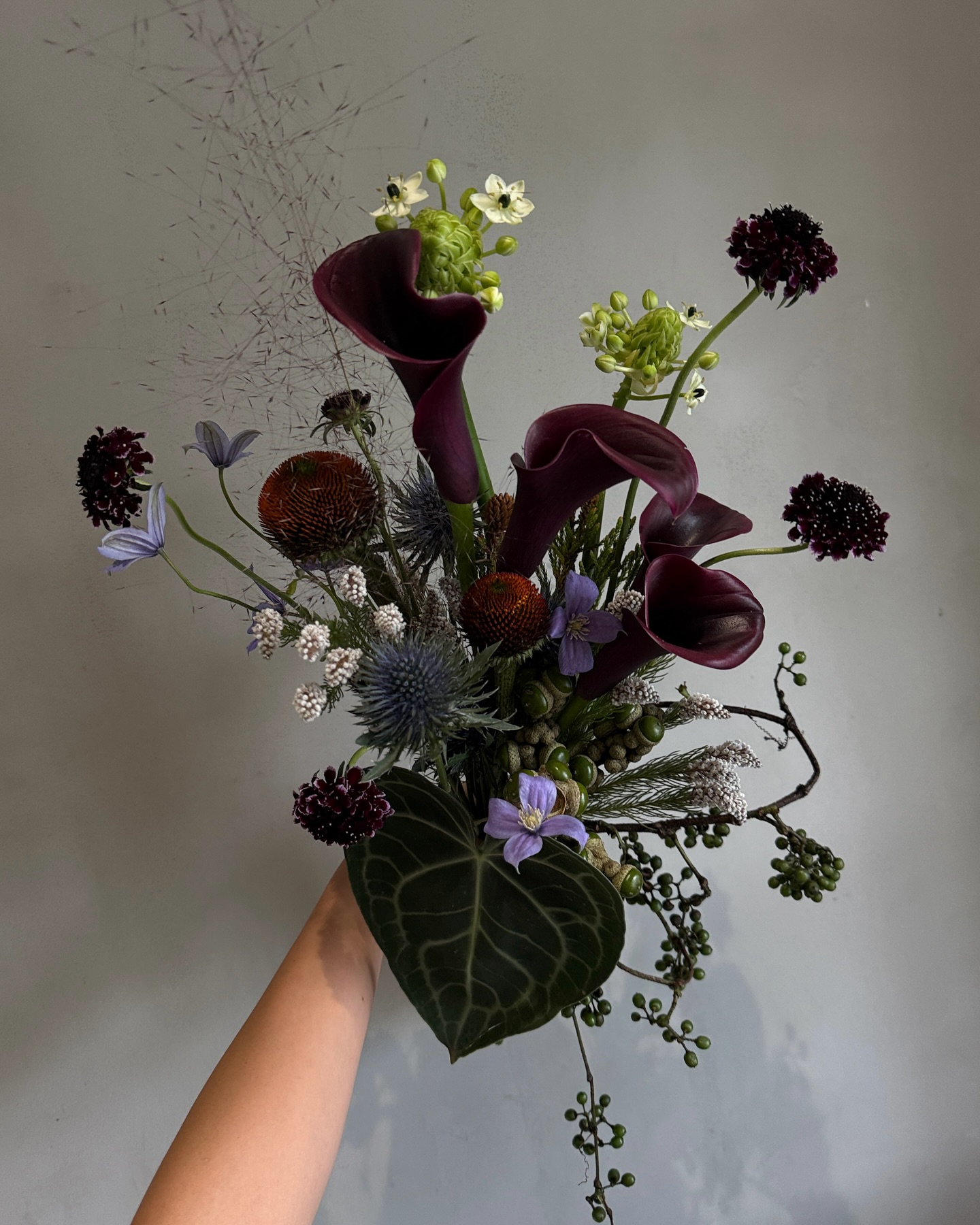 Букет в стиле бохо может быть объёмным и очень разнообразным по составу. Используй в нём протею, антуриум, плоды граната и сухоцветы. Подробнее про эстетику современного бохо в свадьбах читай в нашей статье.