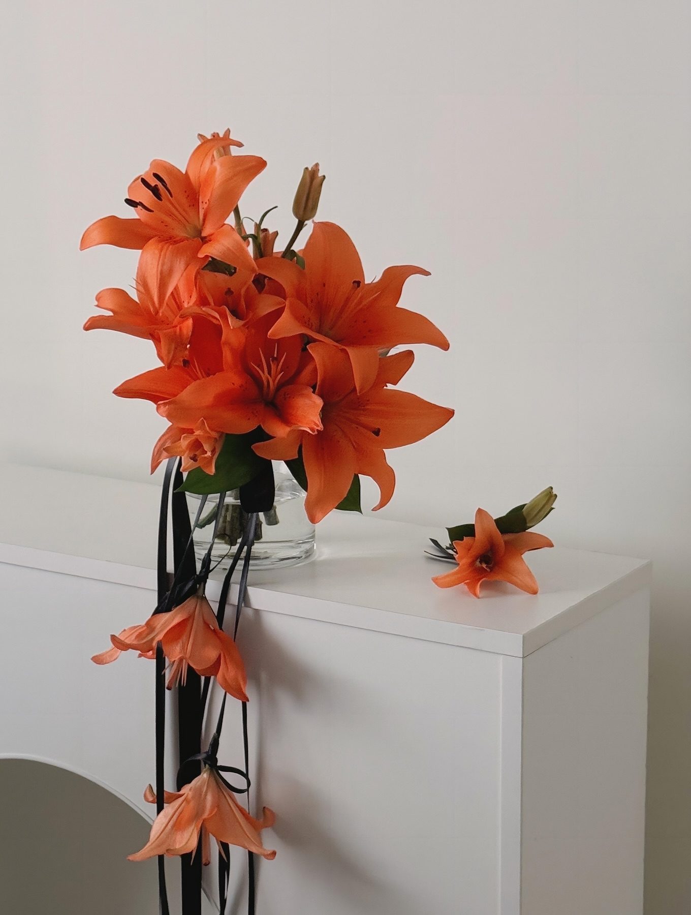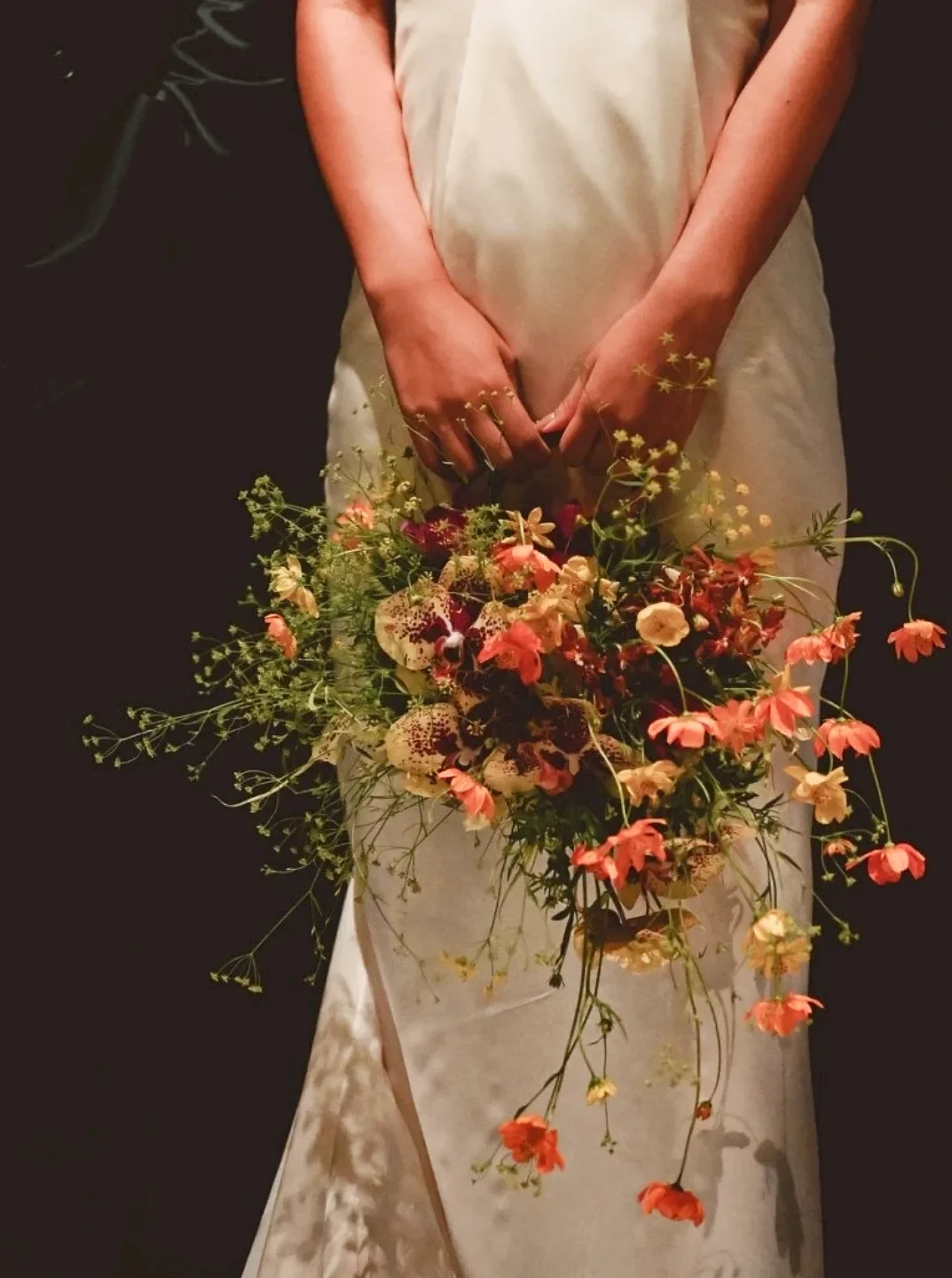 Для уютного осеннего букета невесты подойдут оттенки охры, яркие оранжевые тона или палитра кофе с молоком. Пусть букет будет небольшим и аккуратным, но не слишком строгим. Контрастные ленты, веточки рябины, шишки или даже фрукты вроде инжира сделают композицию особенно атмосферной.