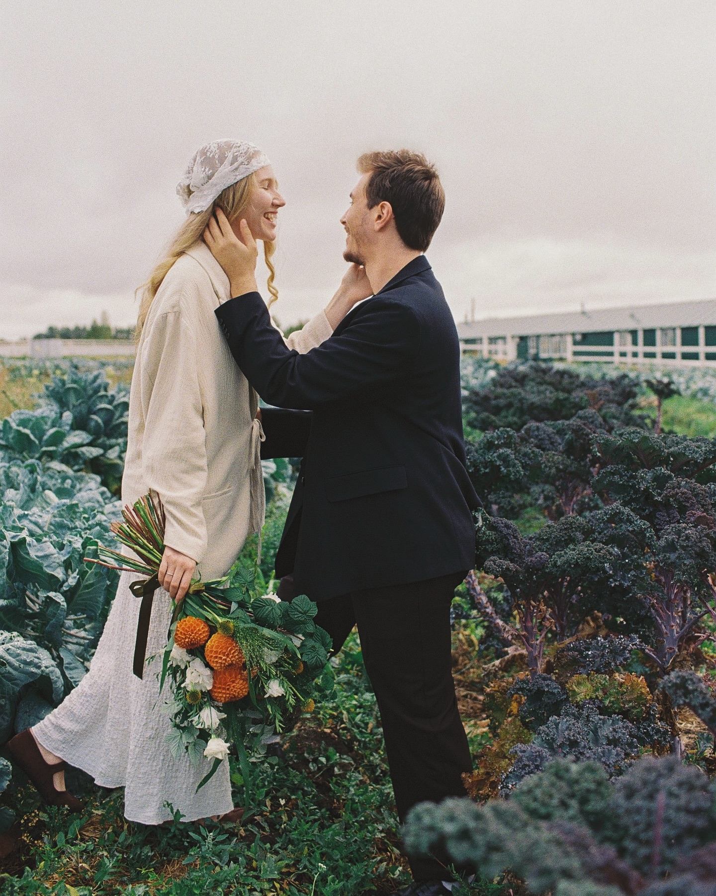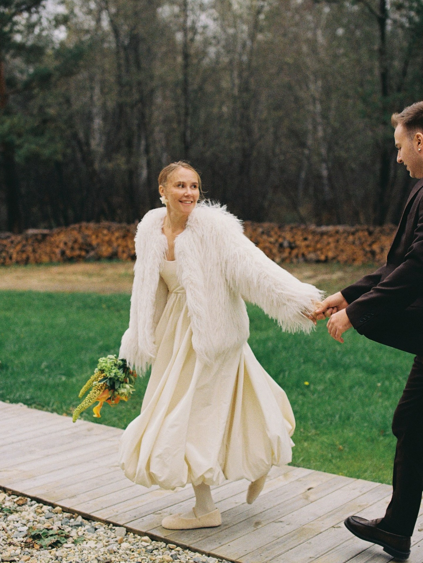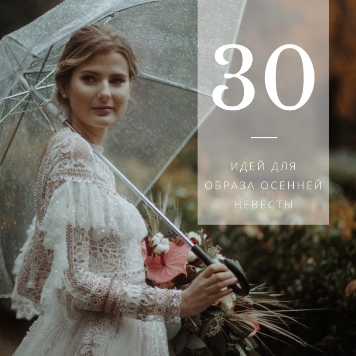 Осенью можно отойти от классики и позволить себе более неформальный образ. Например, выбрать платье в золотистом оттенке или цвете сливочного масла. А можно дополнить образ цветовыми акцентами — в украшениях, в обуви и в букете невесты.