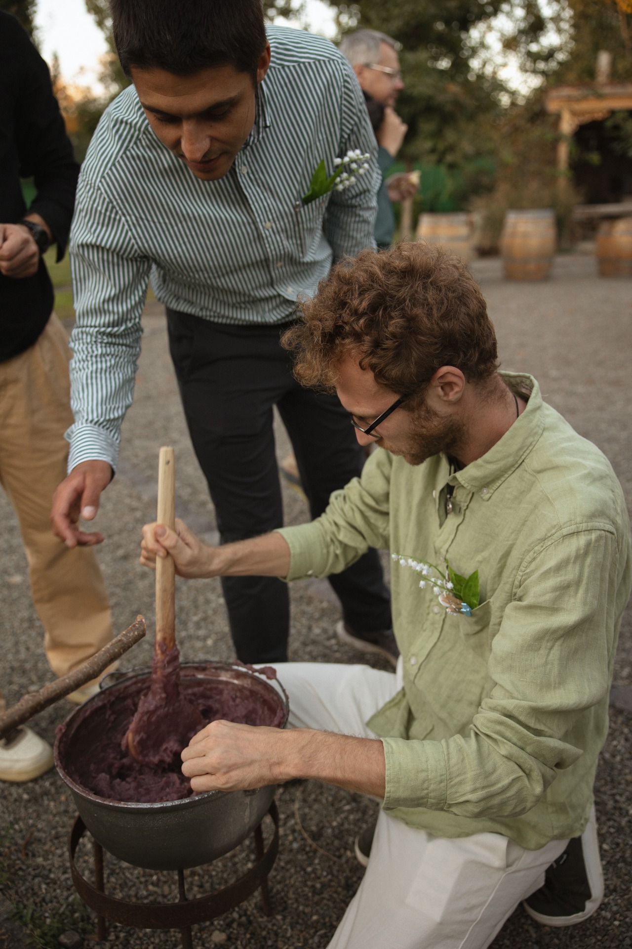 Пока мы фотографировались, для гостей провели экскурсию по винодельне, а также мастер-классы по изготовлению чурчхелы и грузинского хлеба шоти. Так как наша свадьба совпала с праздником урожая Тбилисоба, мы не могли упустить шанс — устроили настоящую традиционную давку винограда.