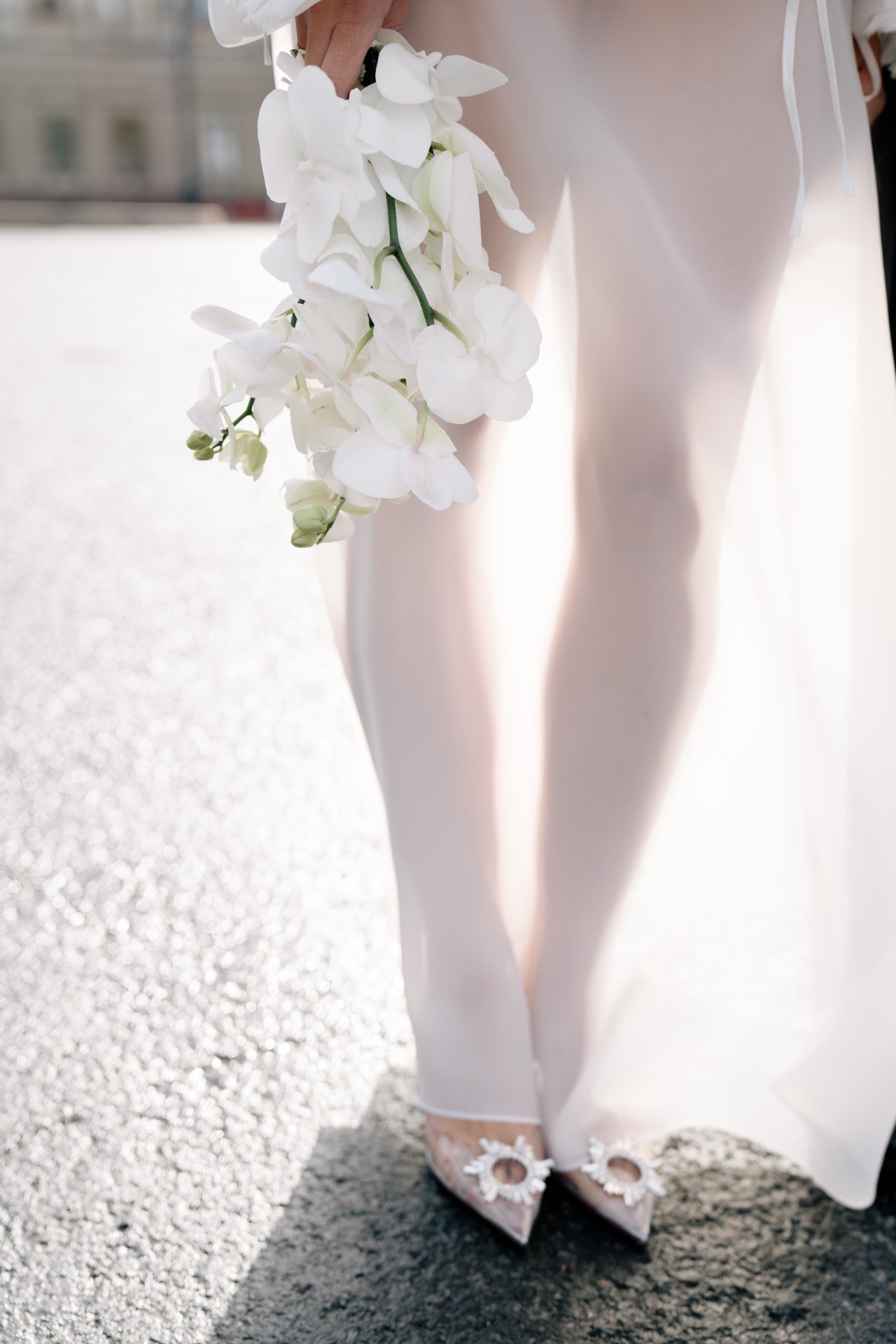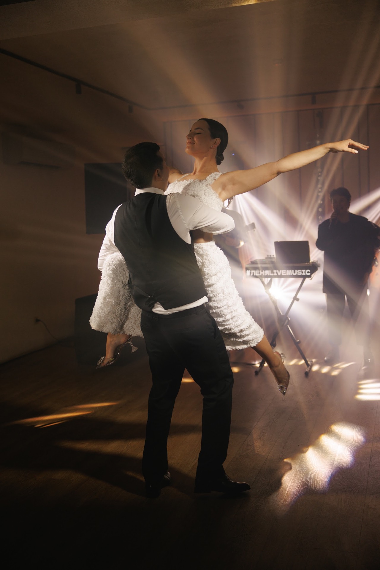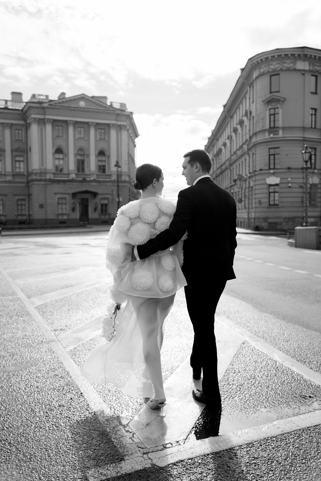 Второй наряд, от дизайнера Виктории Лабай, я выбрала спонтанно, когда поняла, что в первом платье мы не сможем сделать поддержку в танце. С нарядом для ЗАГСа всё было сложнее: одно платье пришлось сдать, потому что только за полтора месяца до свадьбы я случайно нашла наряд мечты в Екатеринбурге. Туфли пришлось заказывать из Европы, поскольку подходящей пары не было в наличии.
