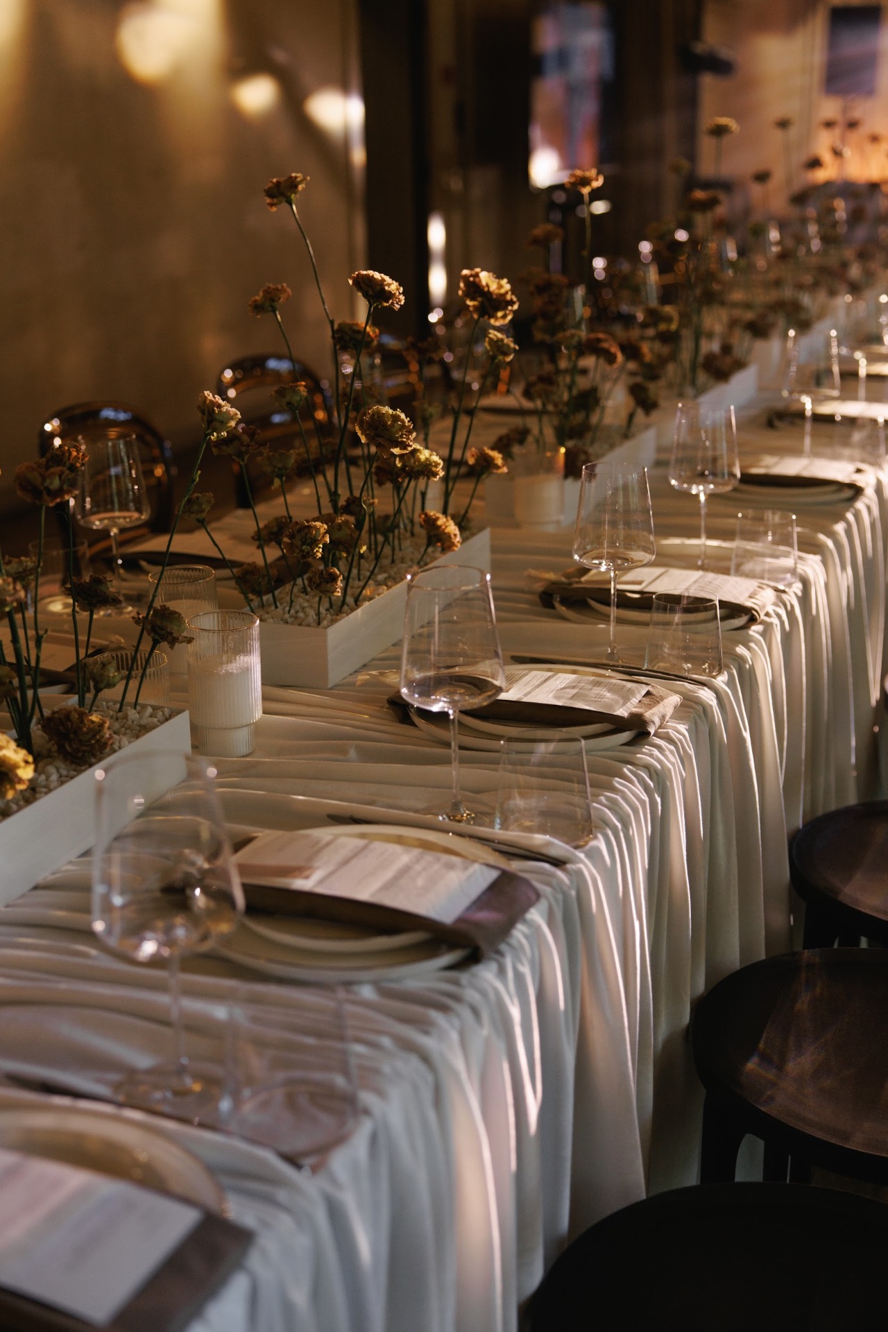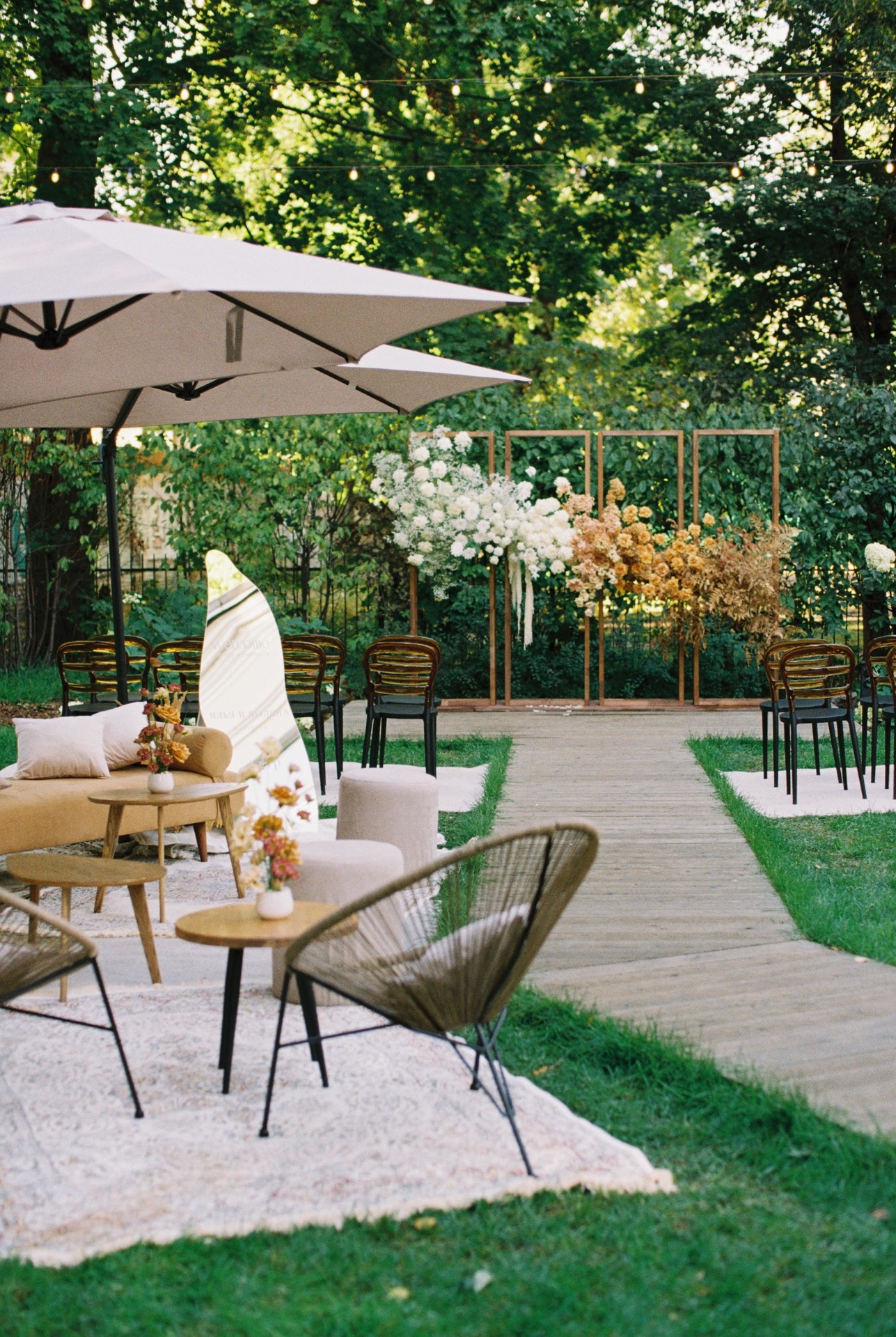Парящие облака цветов на потолке, о которых я мечтала, стали настоящей изюминкой декора. Палитра была осенняя: бежевые, коричневые и чёрные тона. Несмотря на сомнения, оформление получилось стильным, тёплым и торжественным.