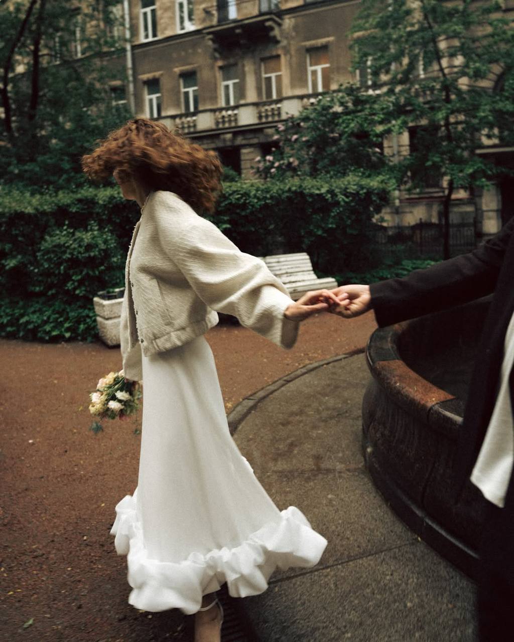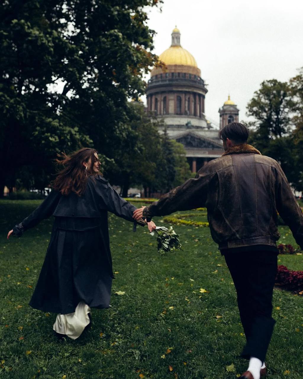 Осенняя погода непредсказуема, поэтому продумай образы заранее. Если это свадебная фотосессия, выбирай верхнюю одежду, сочетающуюся с платьем: кардиган, кейп, накидку. Для жениха подойдут пиджаки из плотных тканей, кашемировые пальто или жилеты. Также не забудь про сменную обувь.