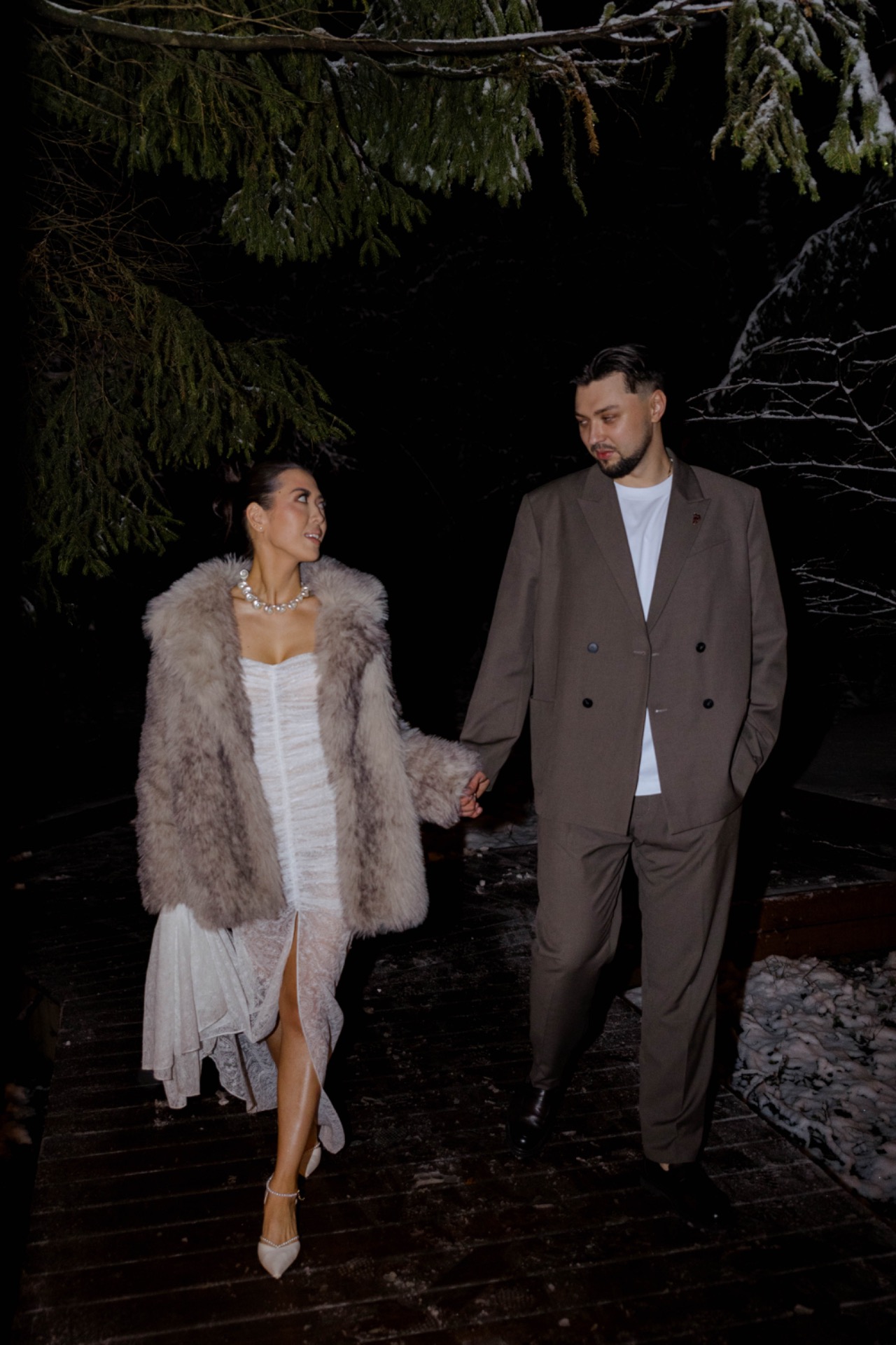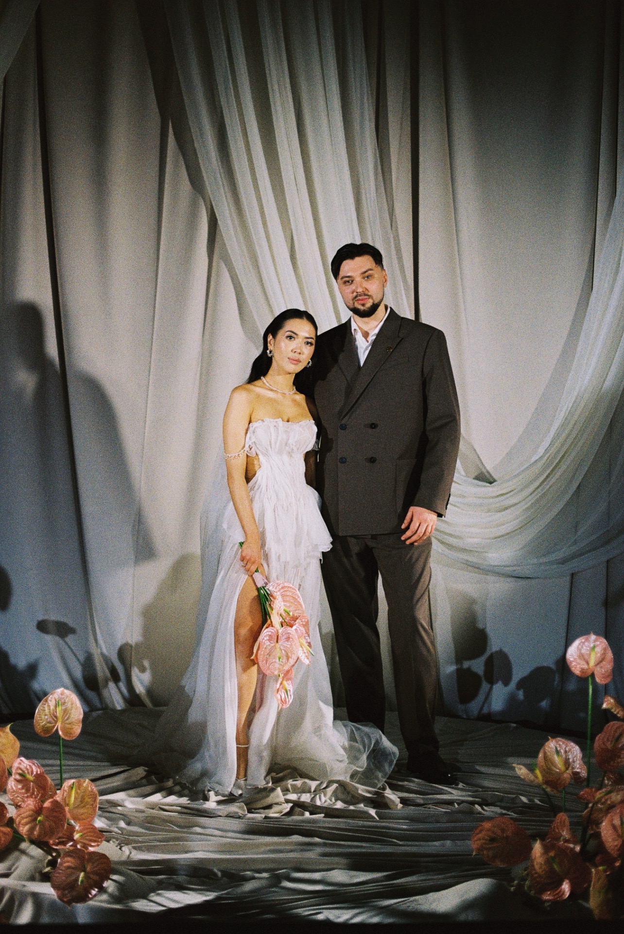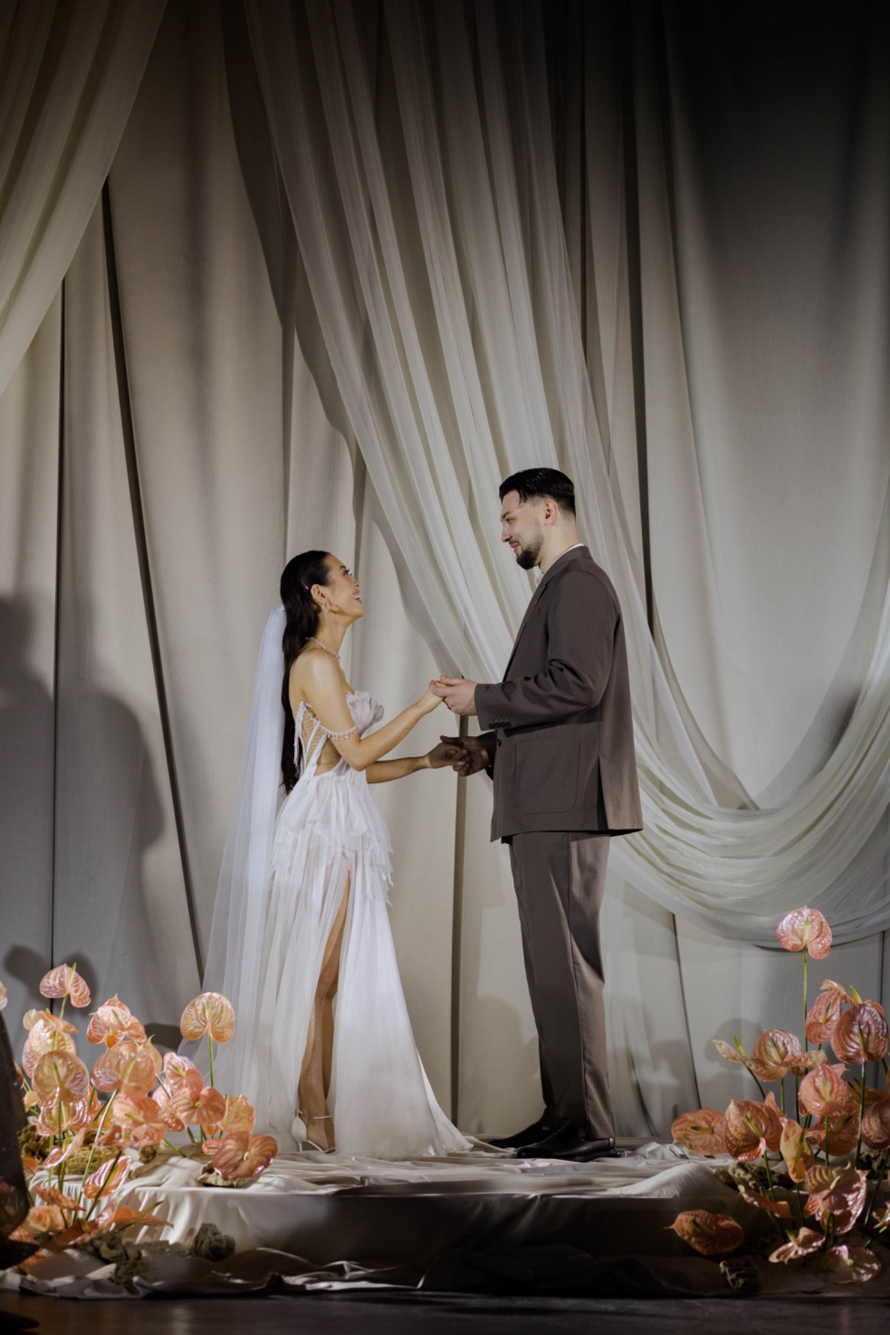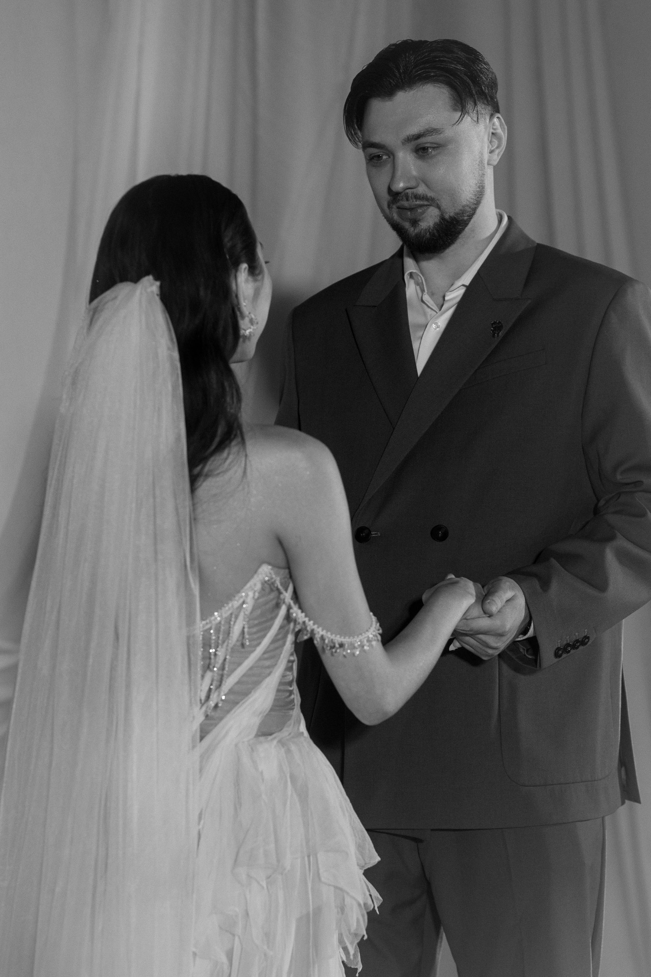 Платьем для церемонии стала модель Minerale из коллекции Ammonite салона «Кураж». Лёгкий шёлк, бисер, ручная вышивка: каждый стежок будто повторял движение воды.