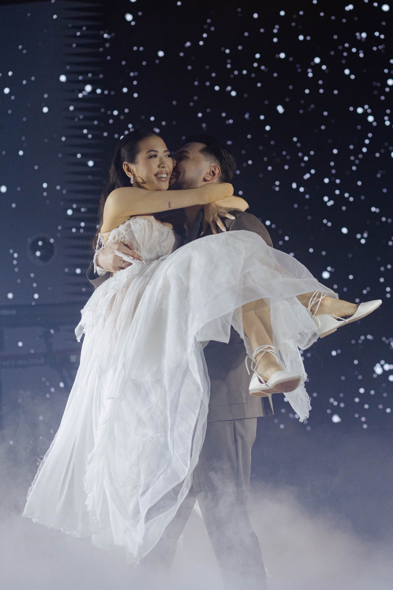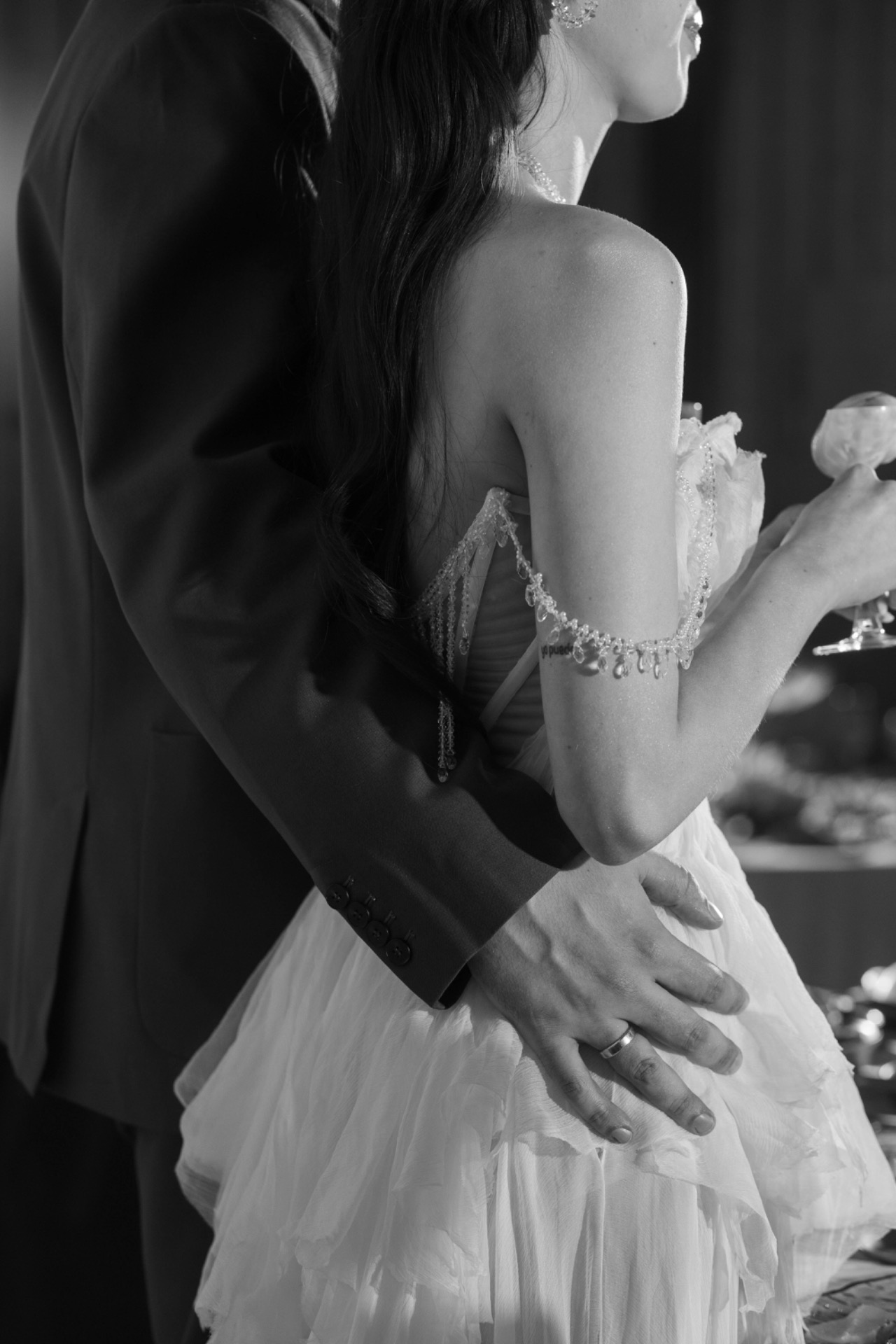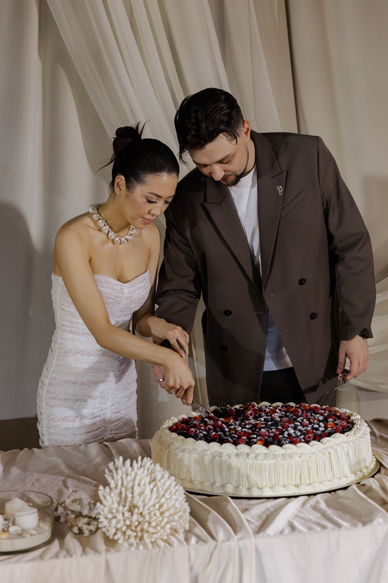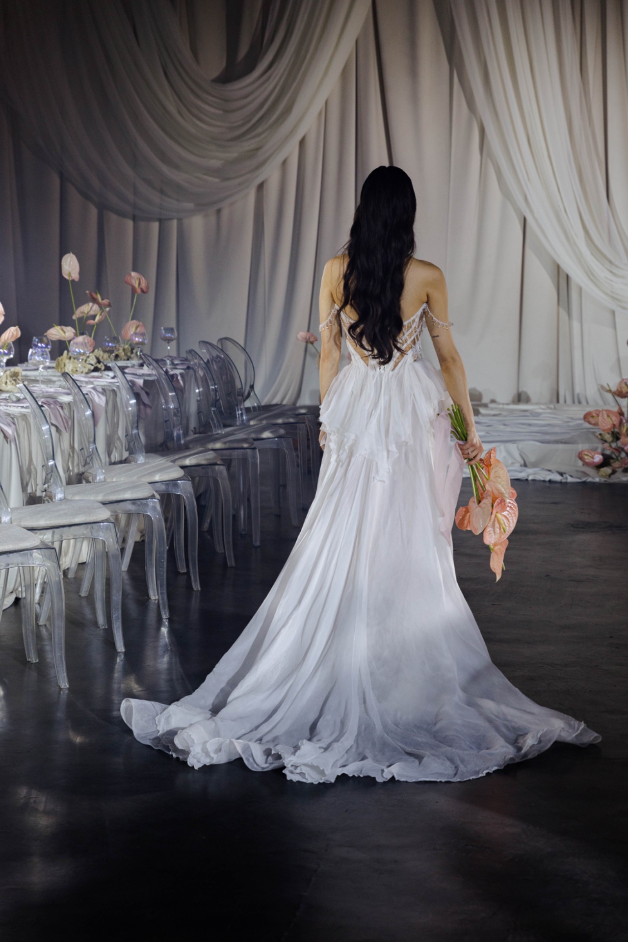Платьем для церемонии стала модель Minerale из коллекции Ammonite салона «Кураж». Лёгкий шёлк, бисер, ручная вышивка: каждый стежок будто повторял движение воды.