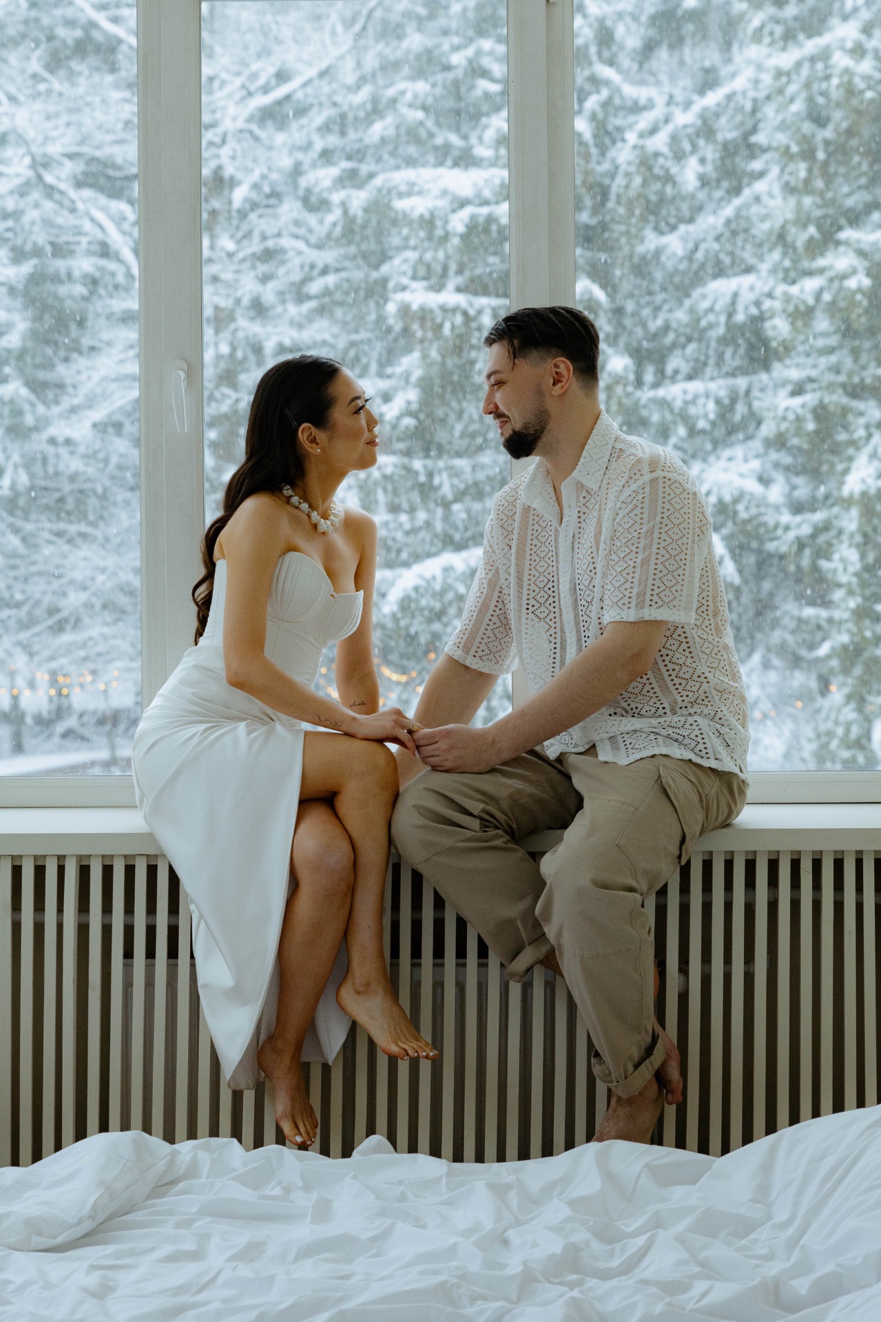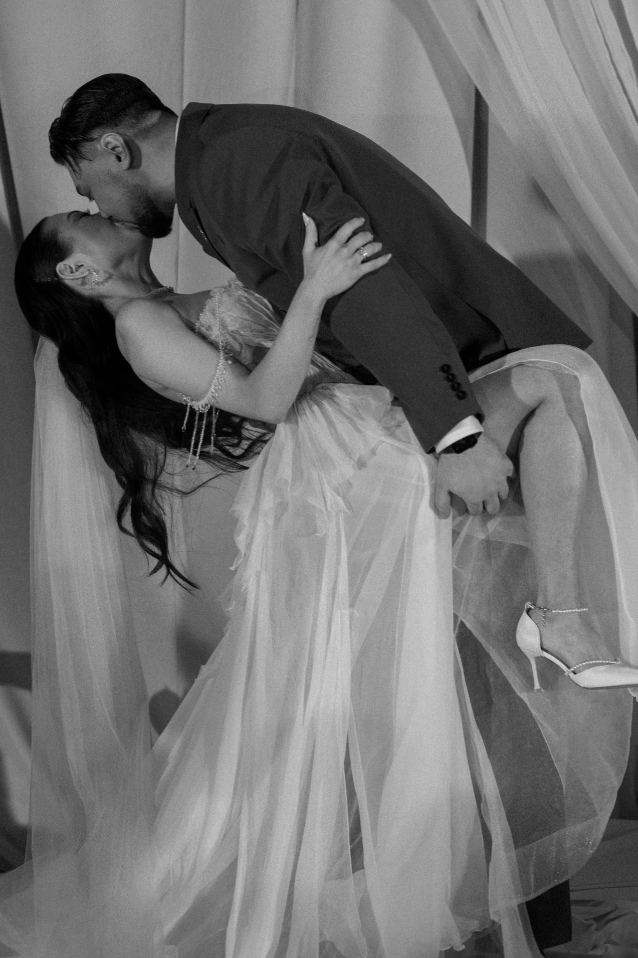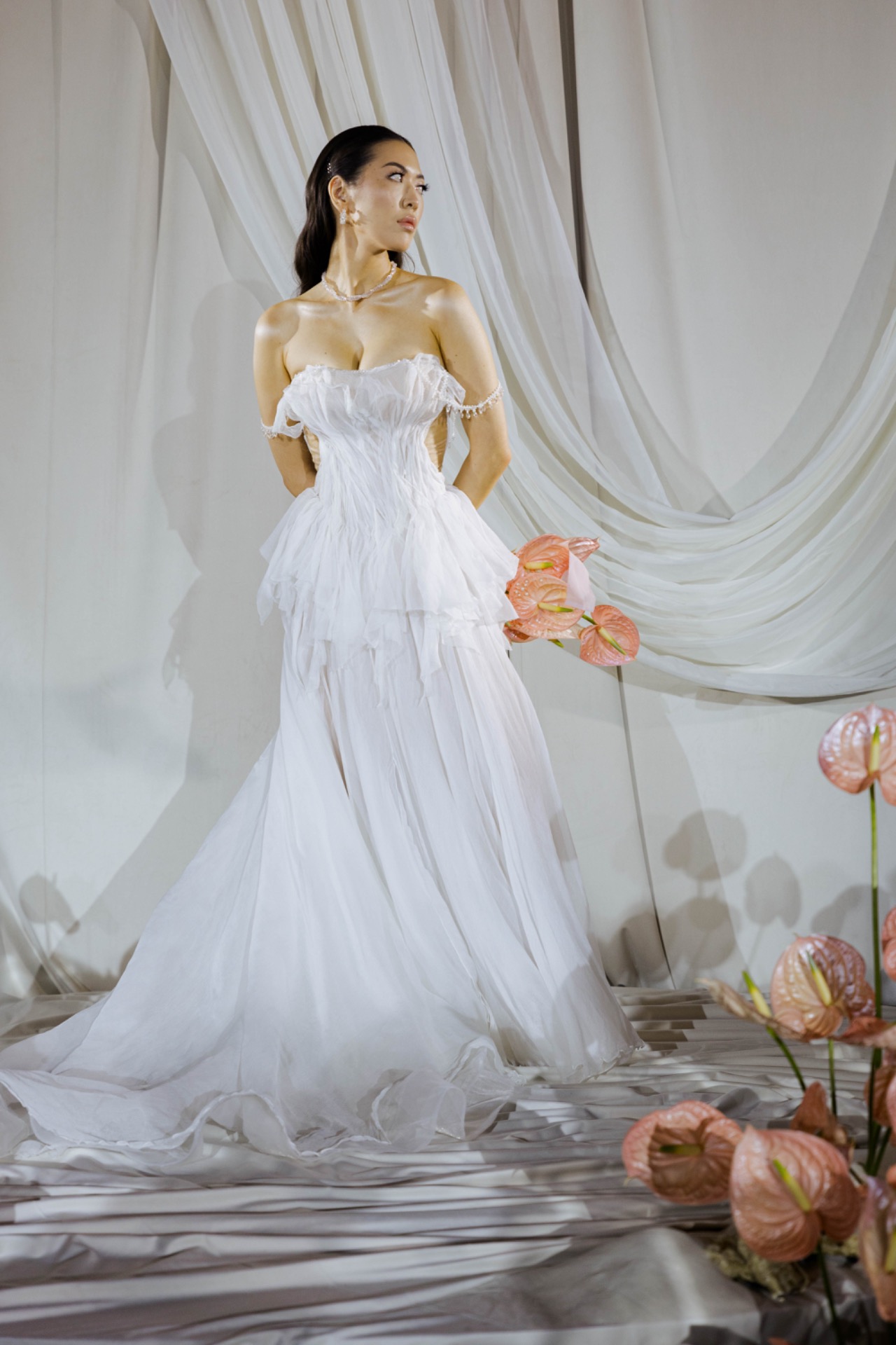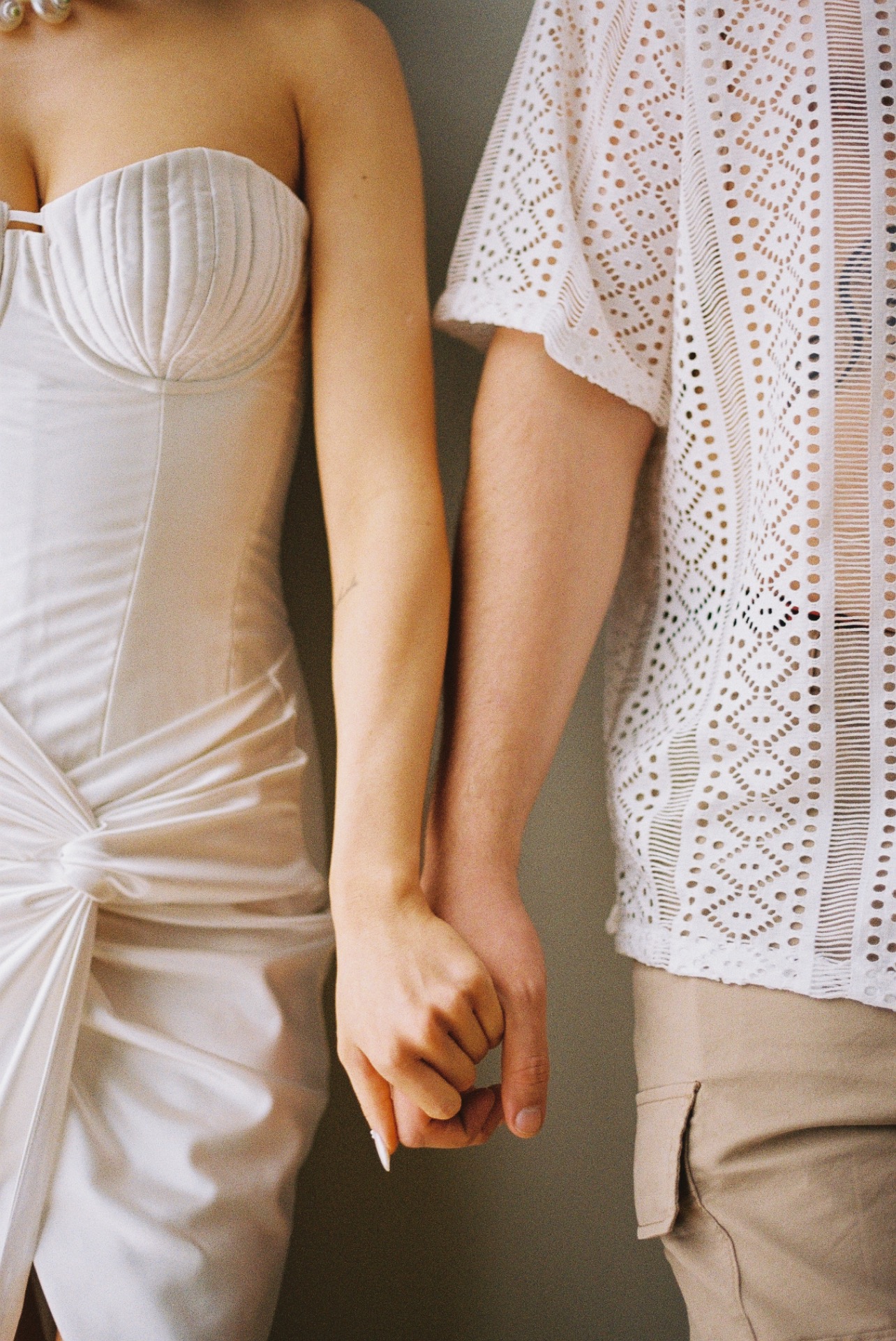Платьем для церемонии стала модель Minerale из коллекции Ammonite салона «Кураж». Лёгкий шёлк, бисер, ручная вышивка: каждый стежок будто повторял движение воды.