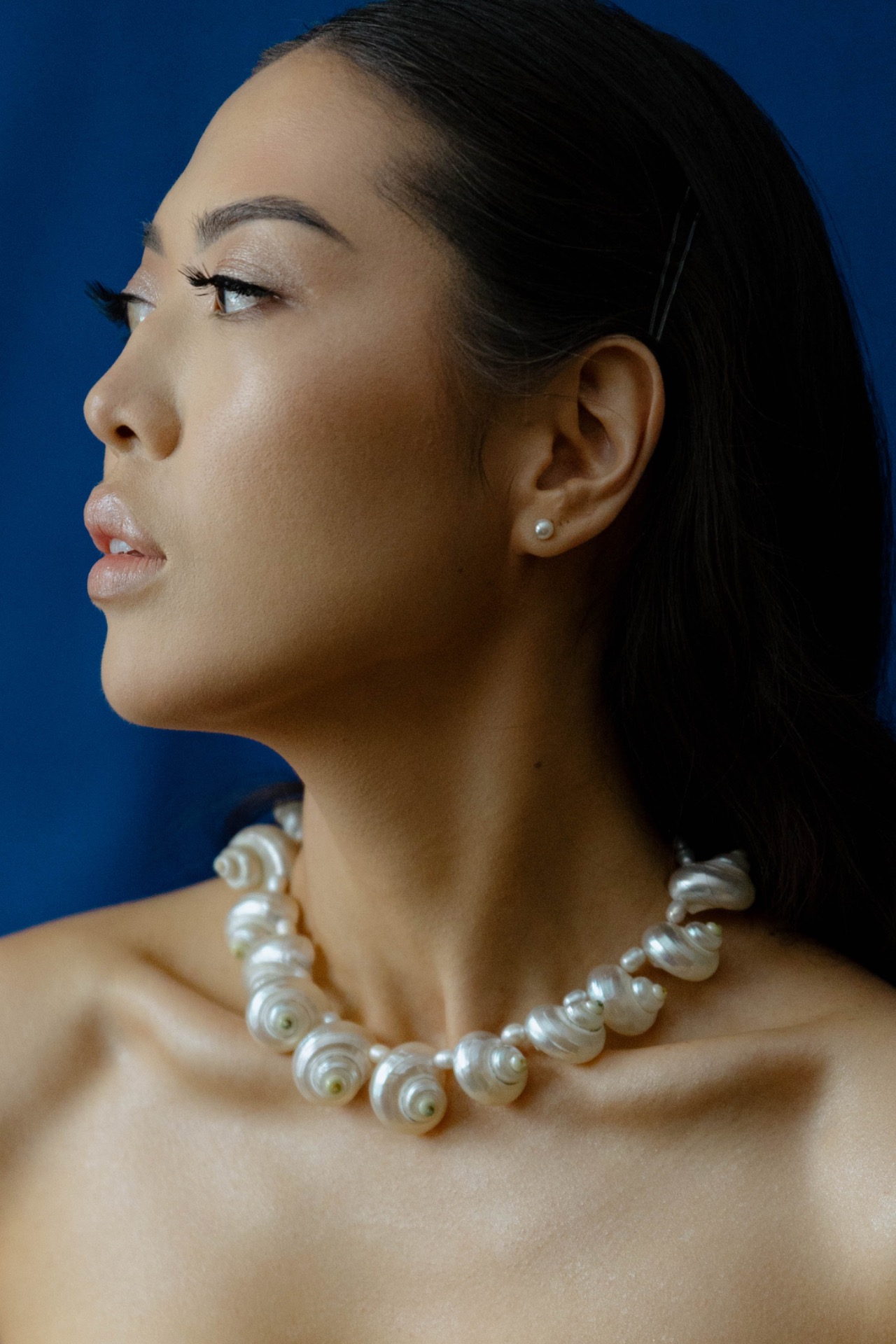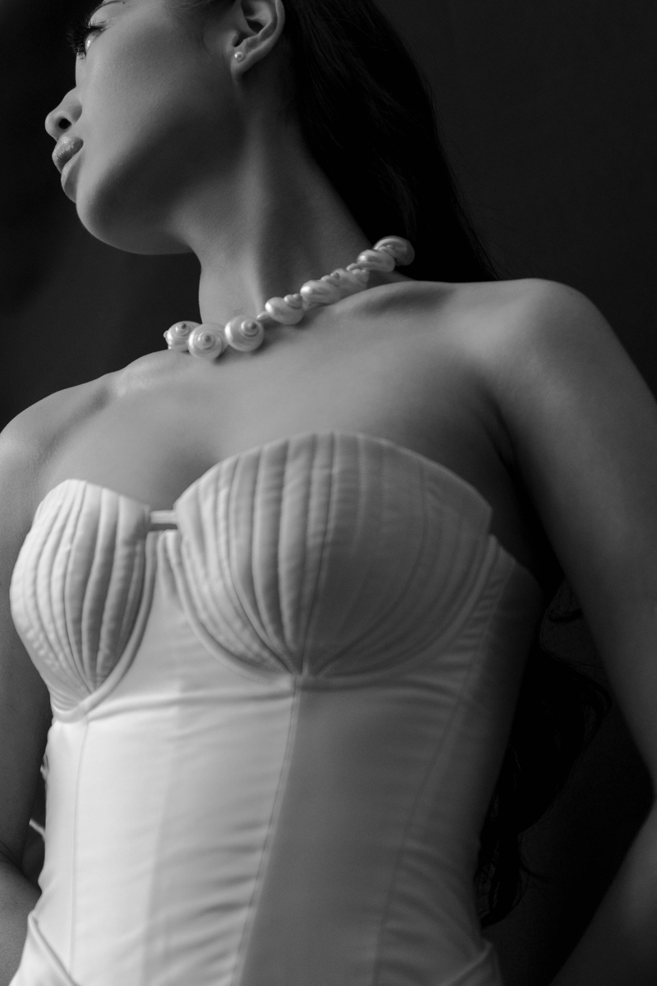 Мой первый образ напоминал fashion-съёмку: корсет и юбка от бренда MUNIQUE, украшения-ракушки, морские детали, синяя ткань цвета электрик и рыболовная сеть в качестве элементов декора.