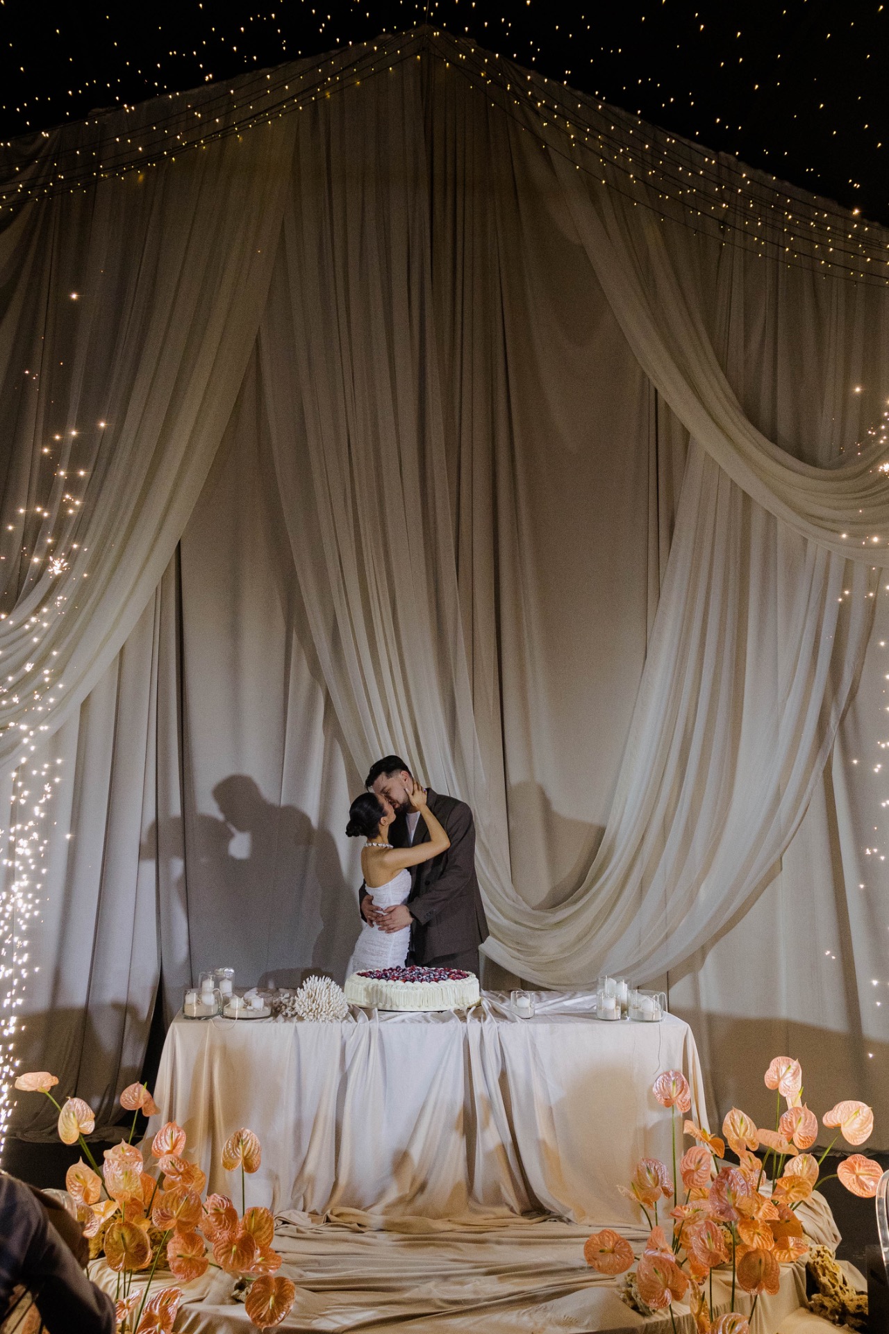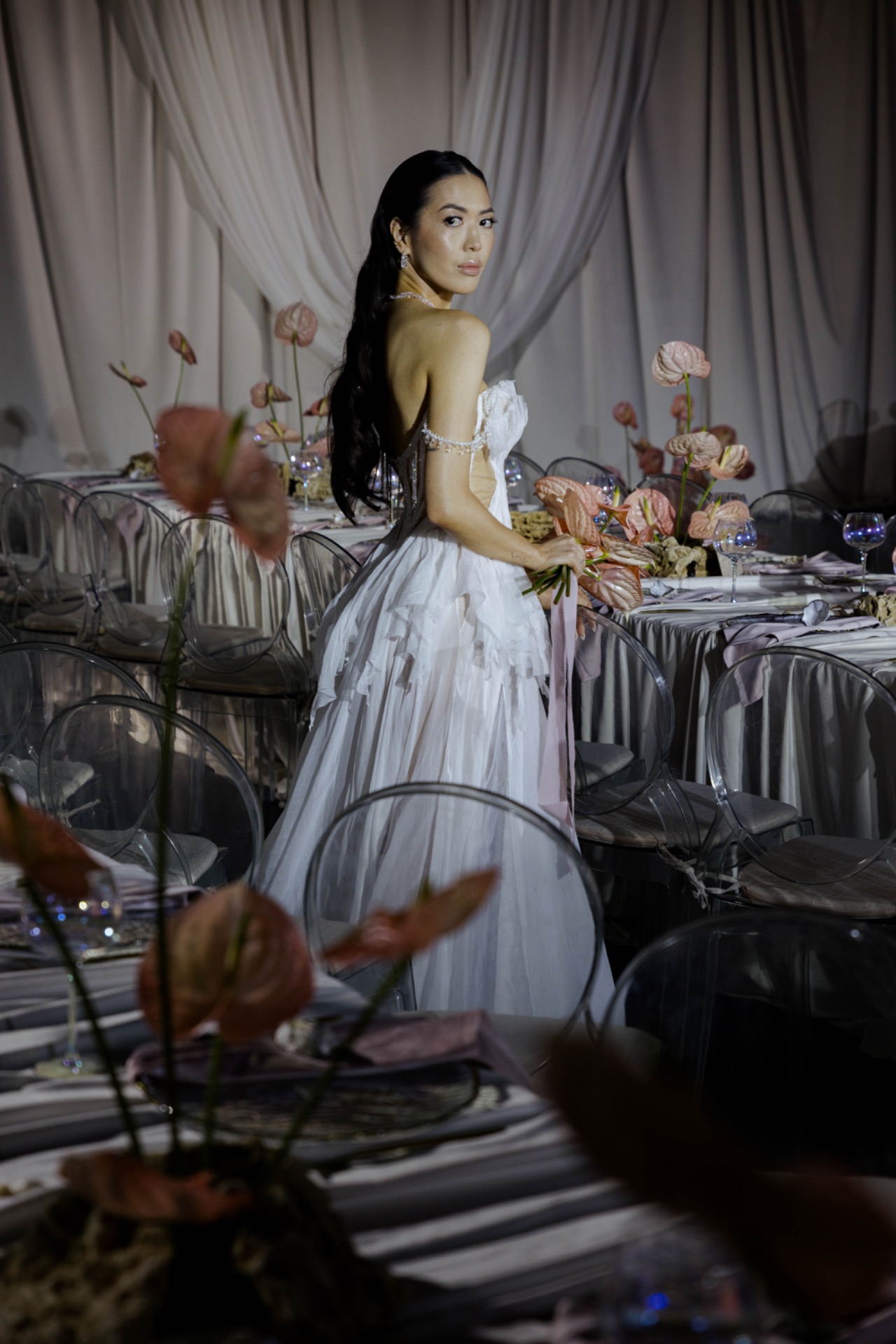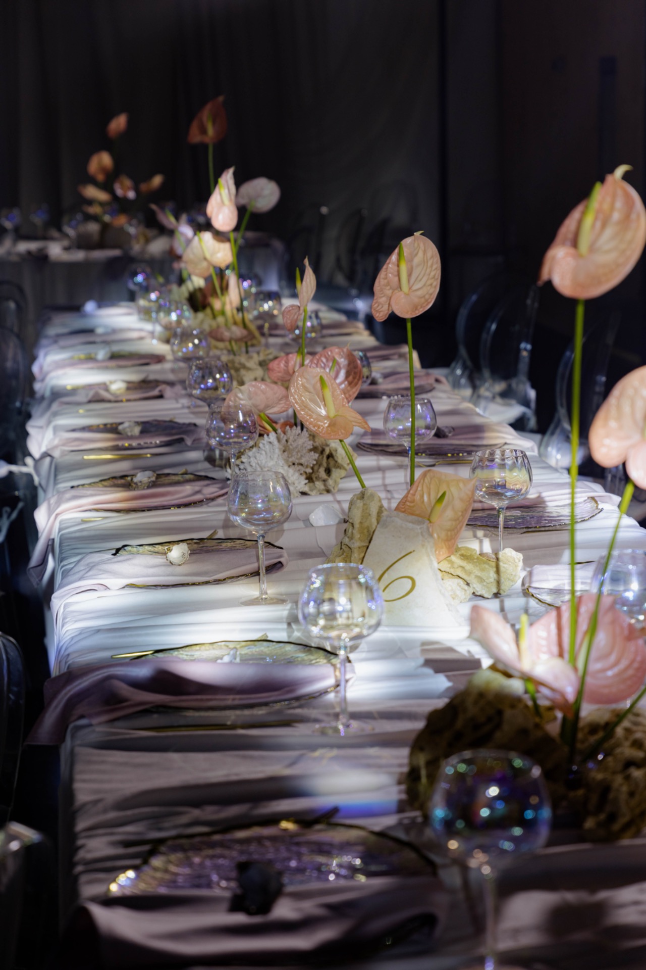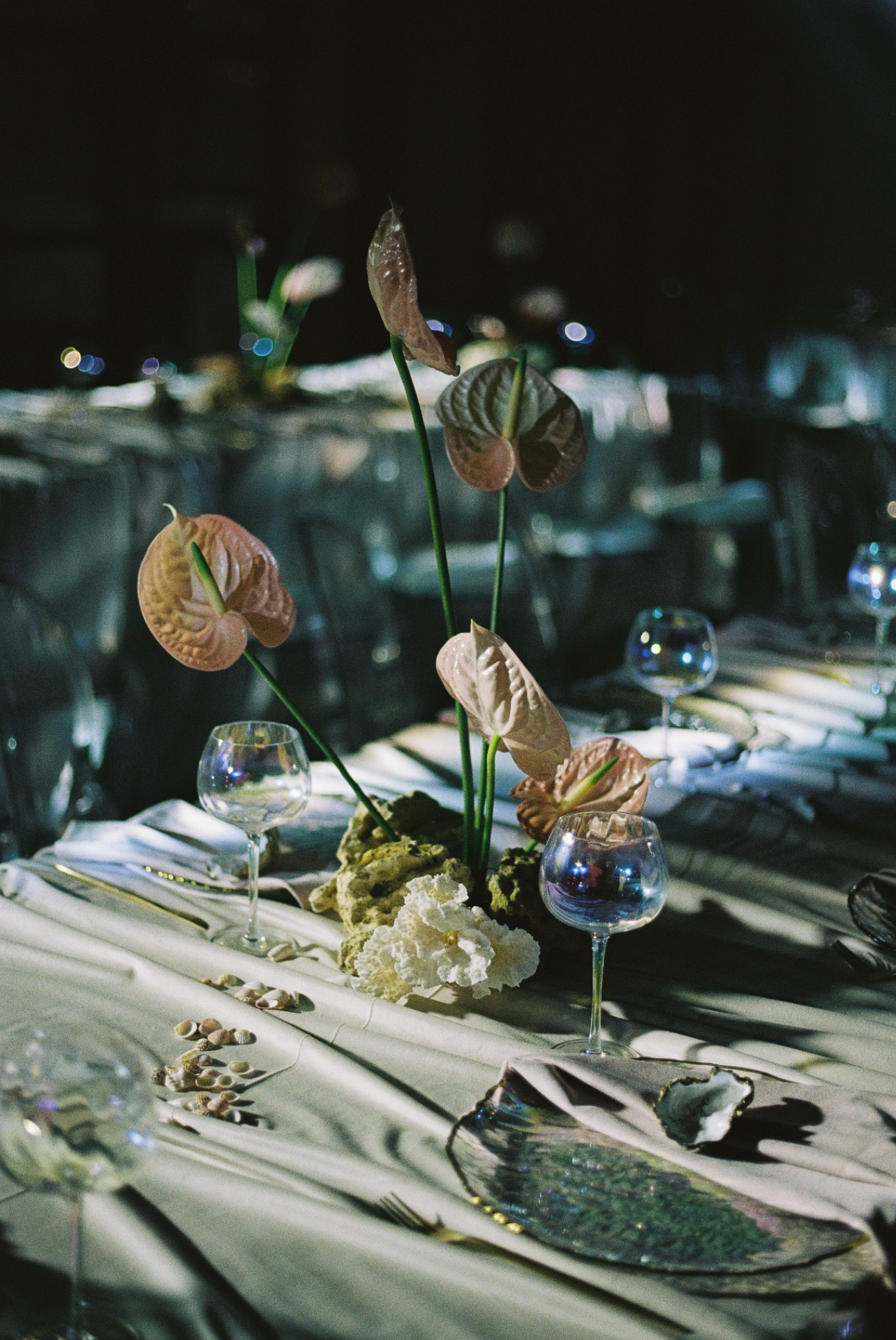 Флористика из перламутровых антуриумов, маленькие ракушки в композициях, стекло и мягкая игра света: всё выглядело как будто найденные на берегу сокровища. Свет стал главным элементом декора: рябь отражений походила на морские блики.