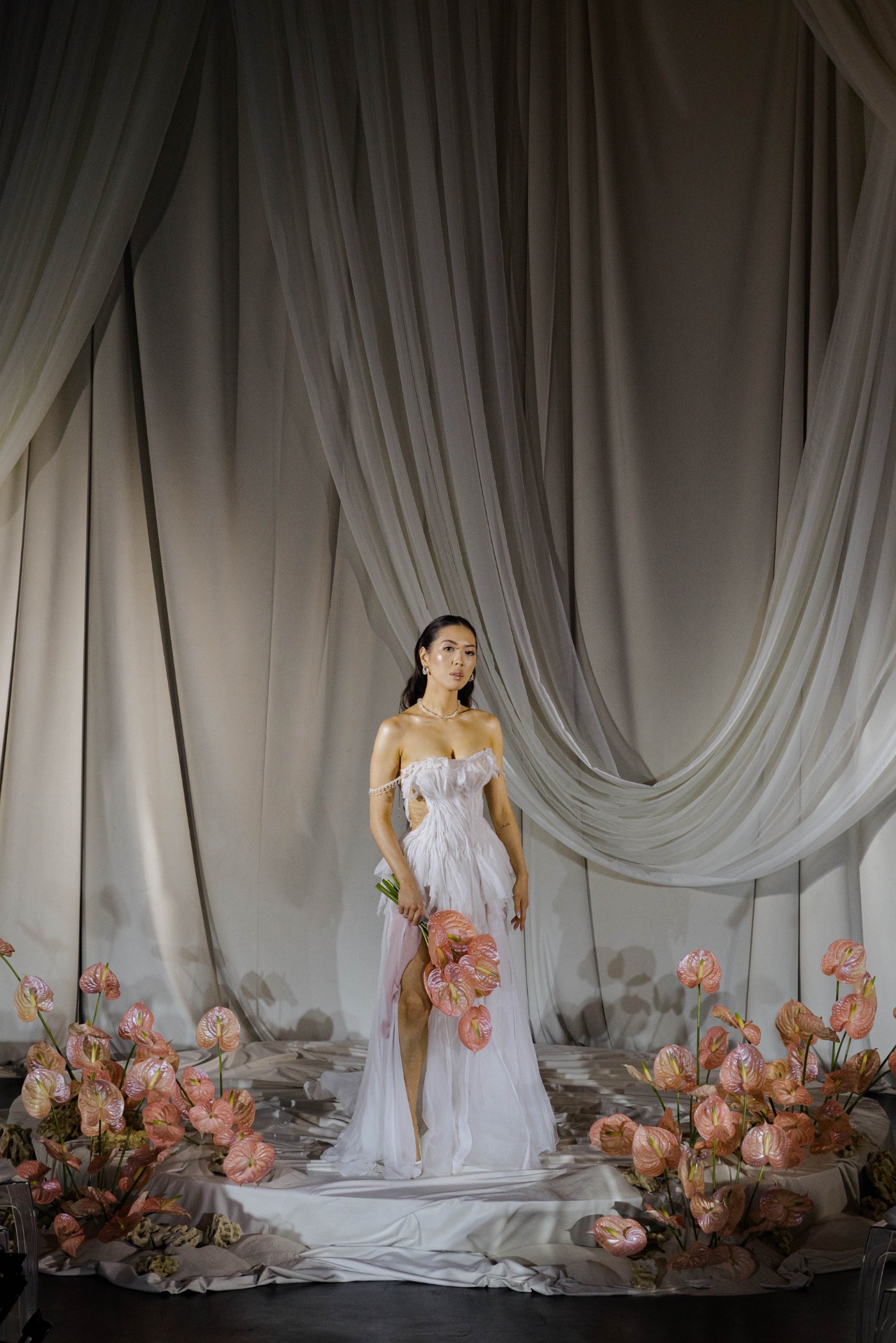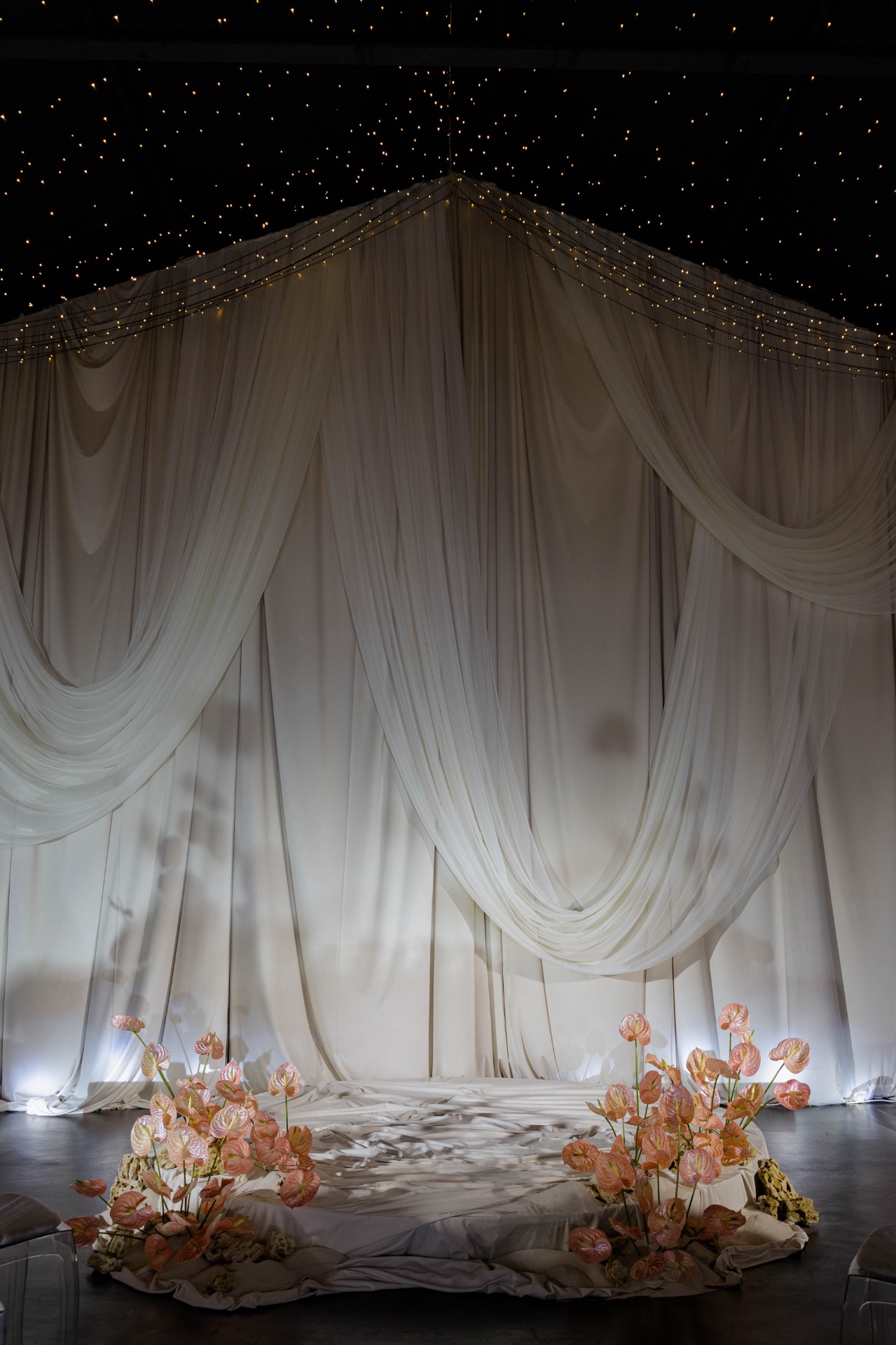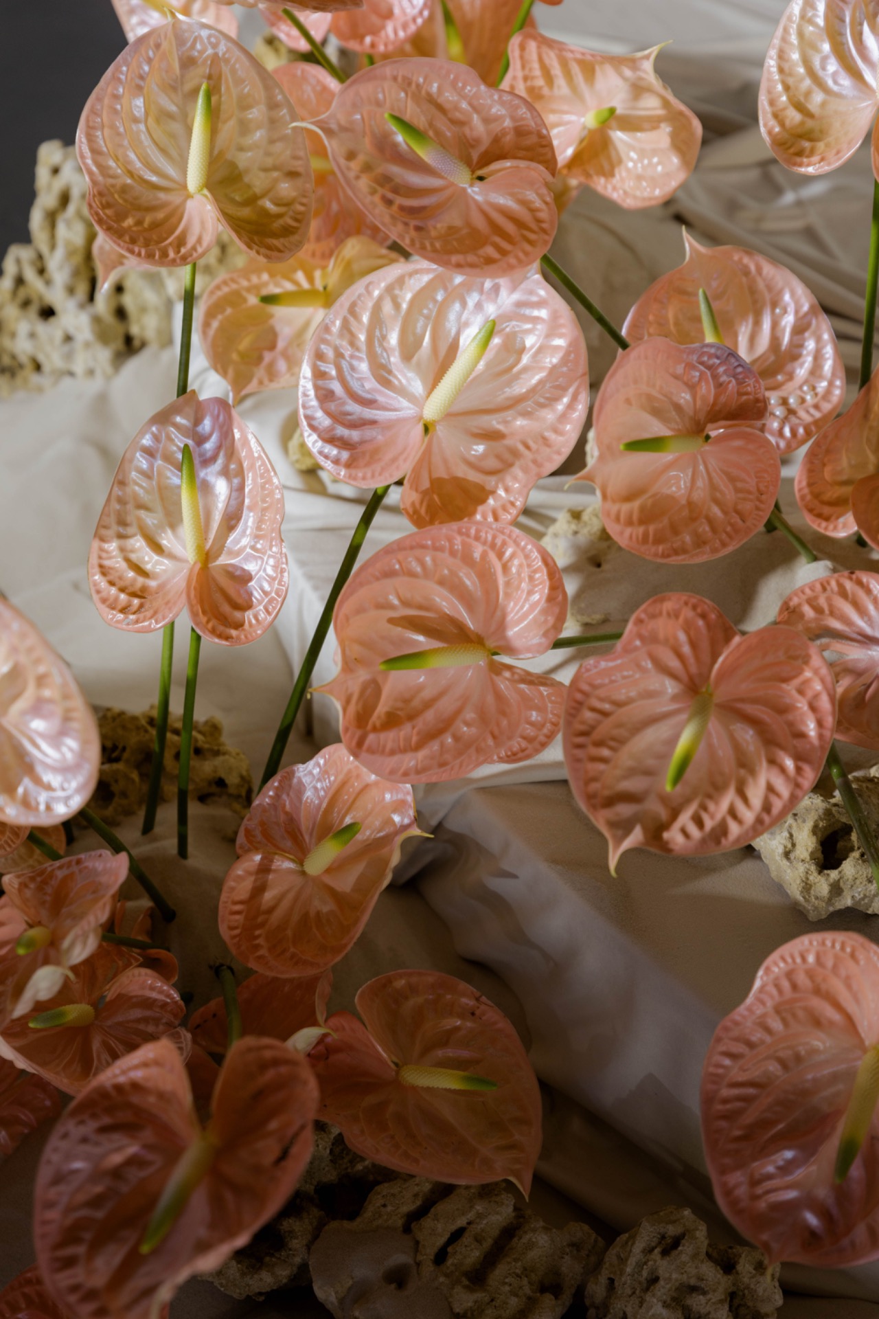 Флористика из перламутровых антуриумов, маленькие ракушки в композициях, стекло и мягкая игра света: всё выглядело как будто найденные на берегу сокровища. Свет стал главным элементом декора: рябь отражений походила на морские блики.