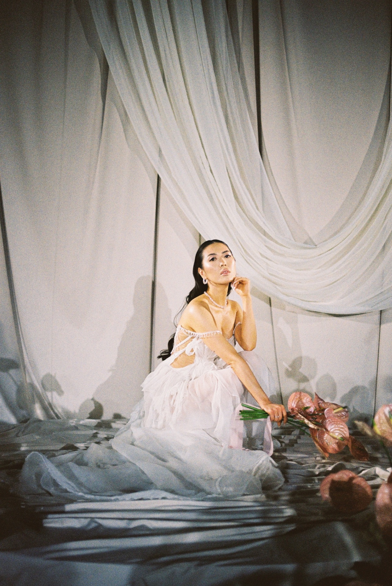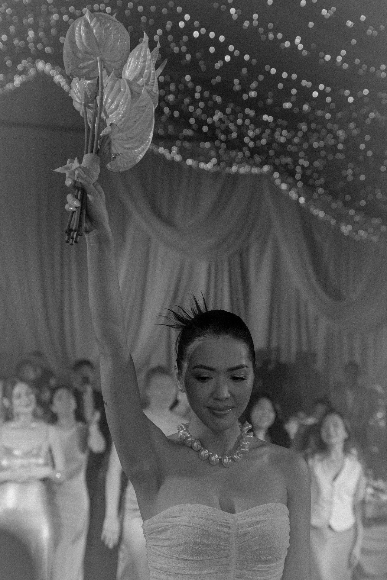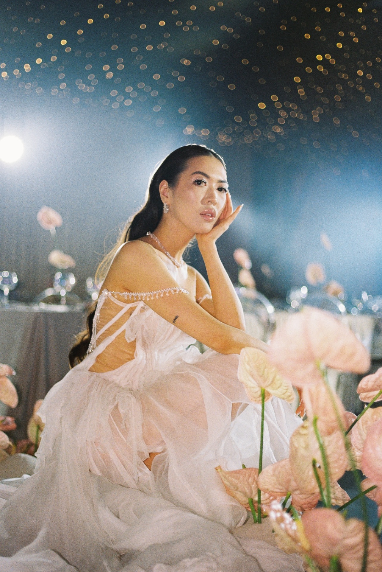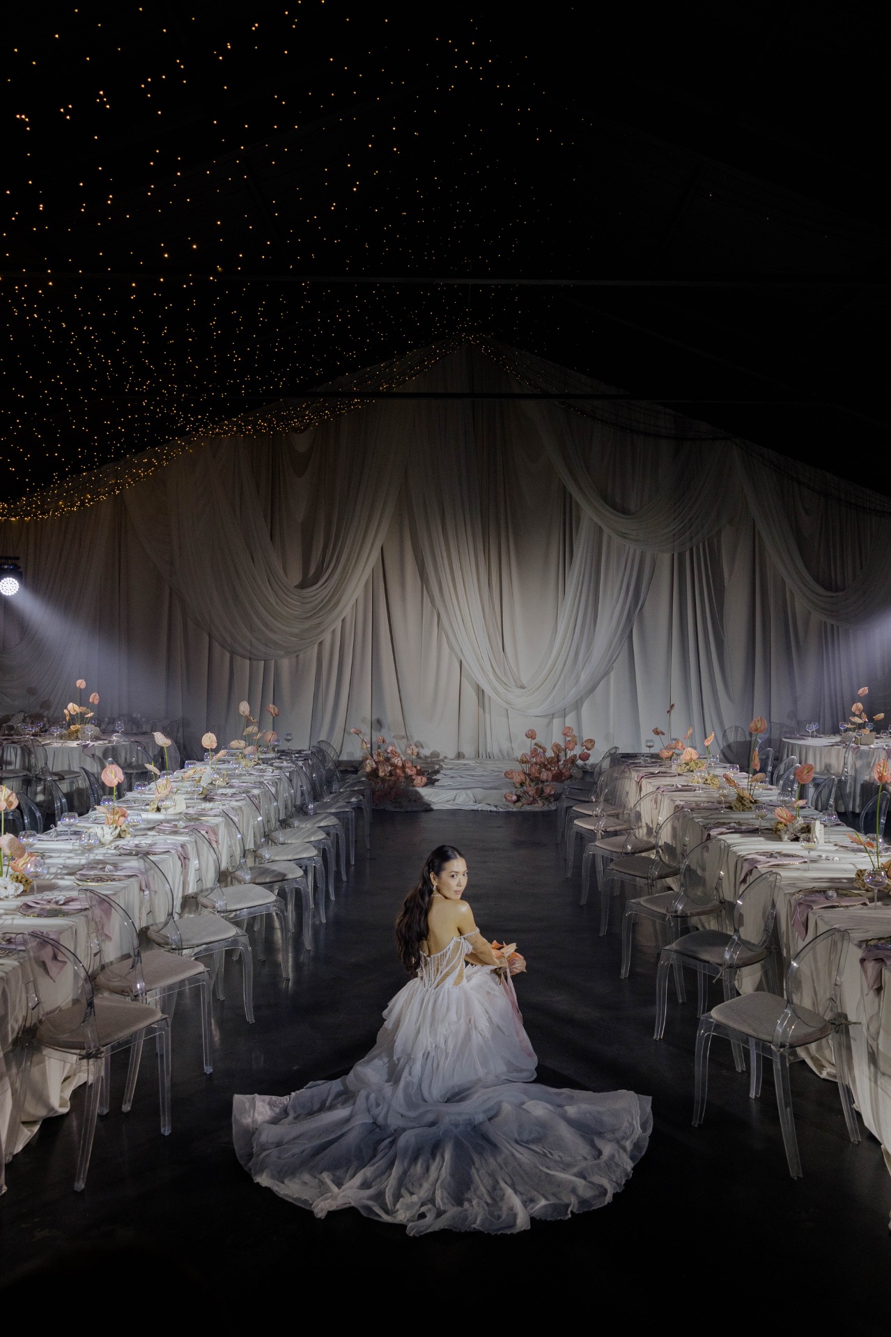 Флористика из перламутровых антуриумов, маленькие ракушки в композициях, стекло и мягкая игра света: всё выглядело как будто найденные на берегу сокровища. Свет стал главным элементом декора: рябь отражений походила на морские блики.
