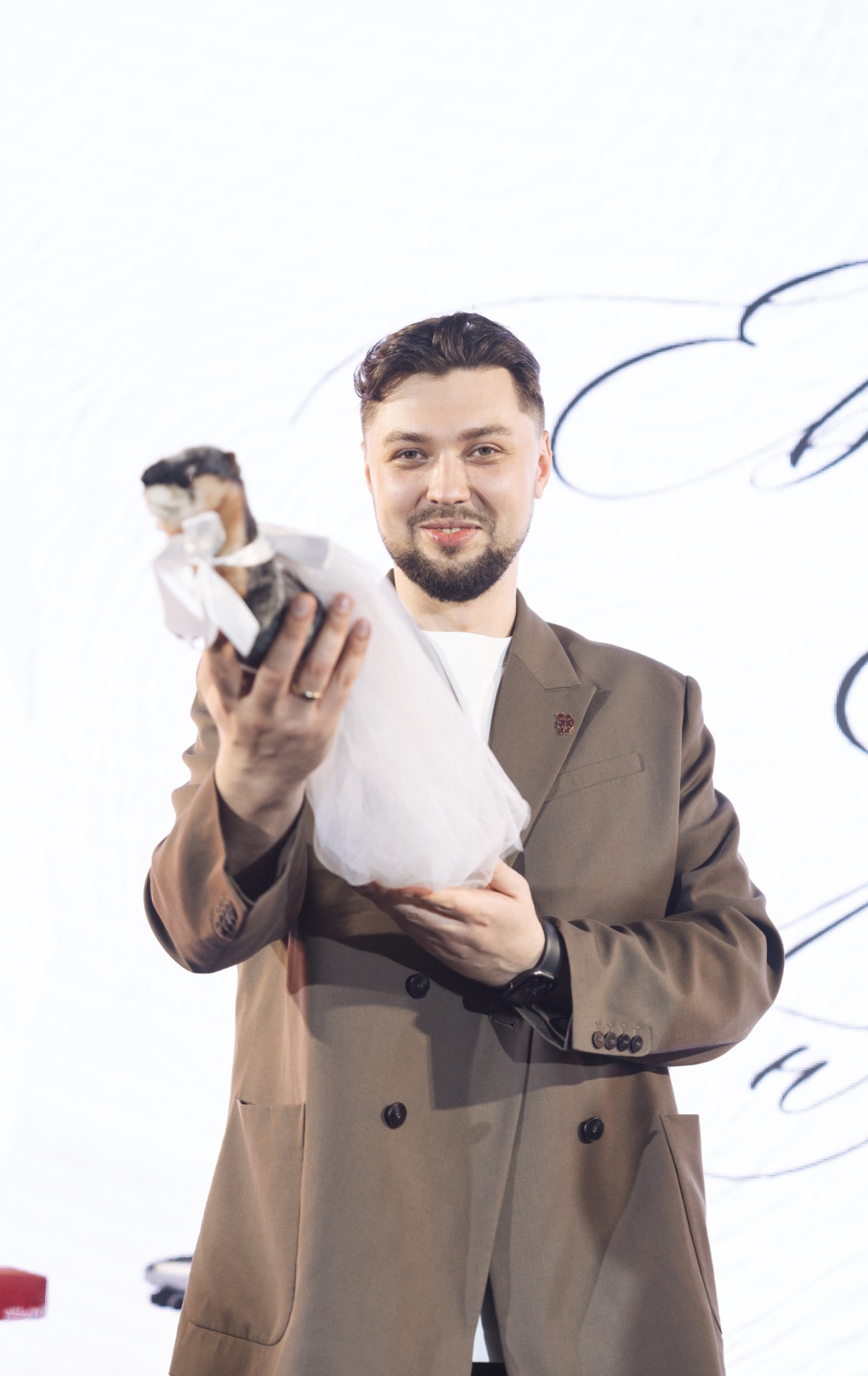 В качестве основного образа Женя выбрал классический костюм в коричневых тонах.