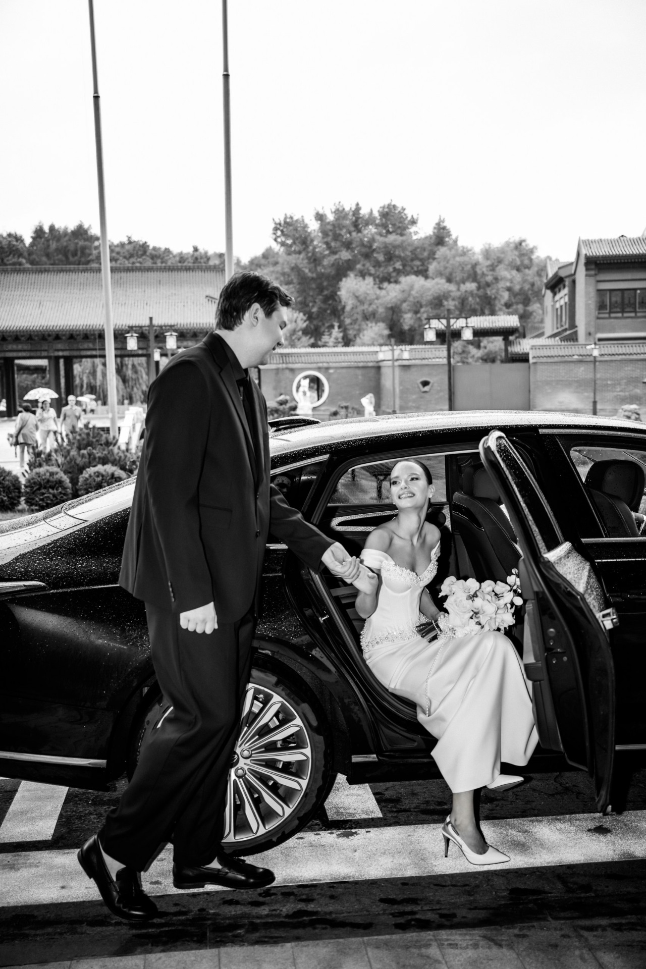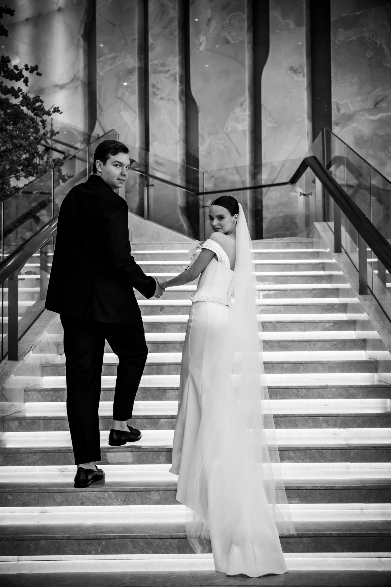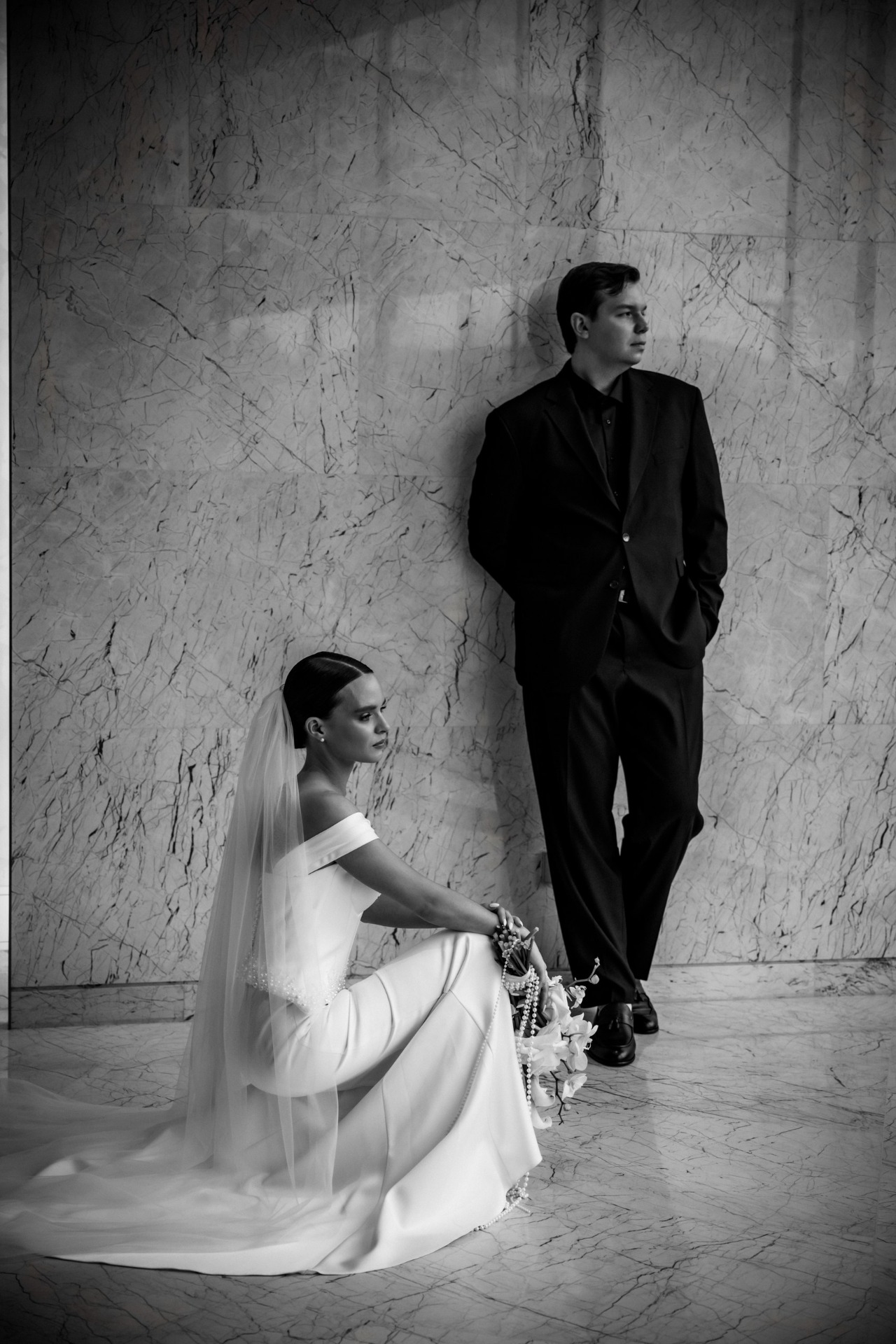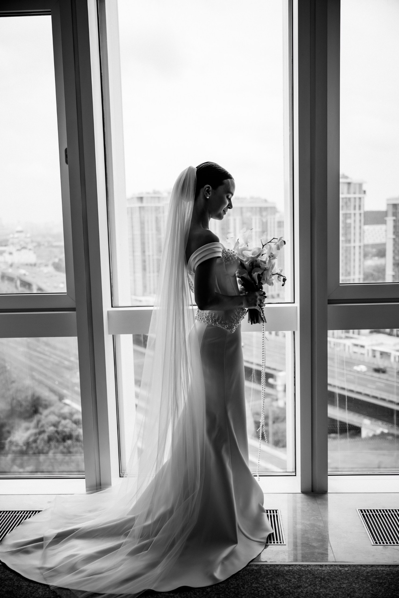 Так как концепция свадьбы была чёрно-белой, Егор был в чёрном классическом костюме с чёрной рубашкой, а я выбрала для себя белое свадебное платье в форме «рыбки» с корсетом и длинной белой фатой. Вдвоём мы смотрелись как инь и ян.