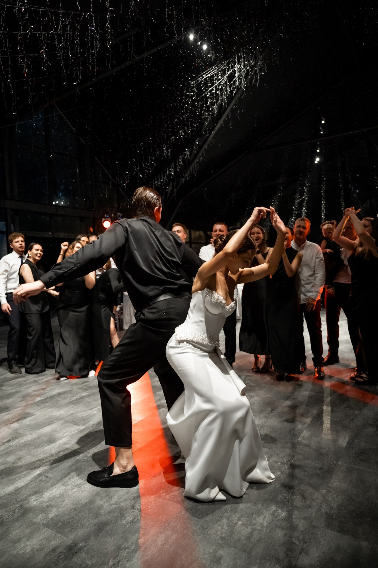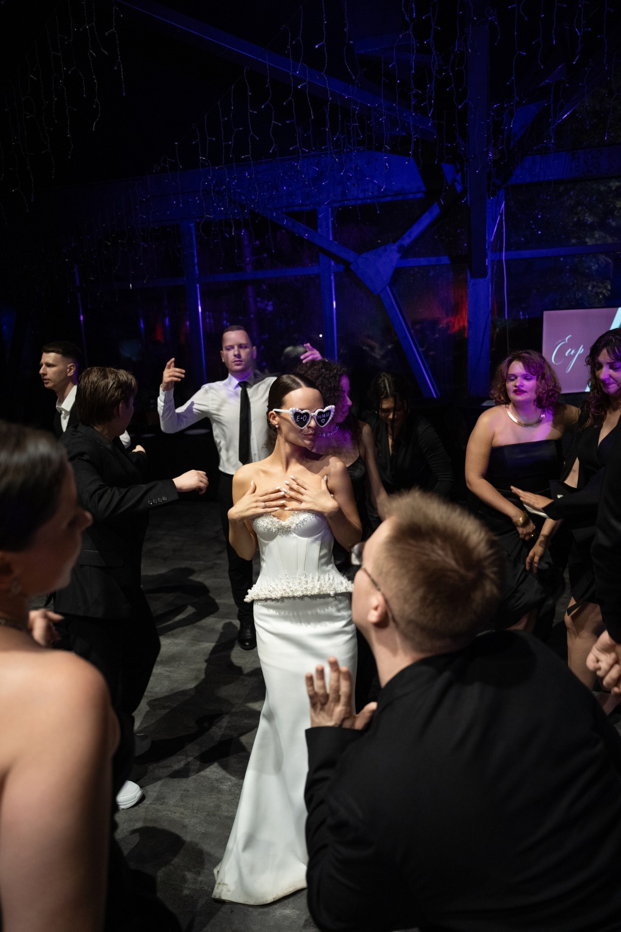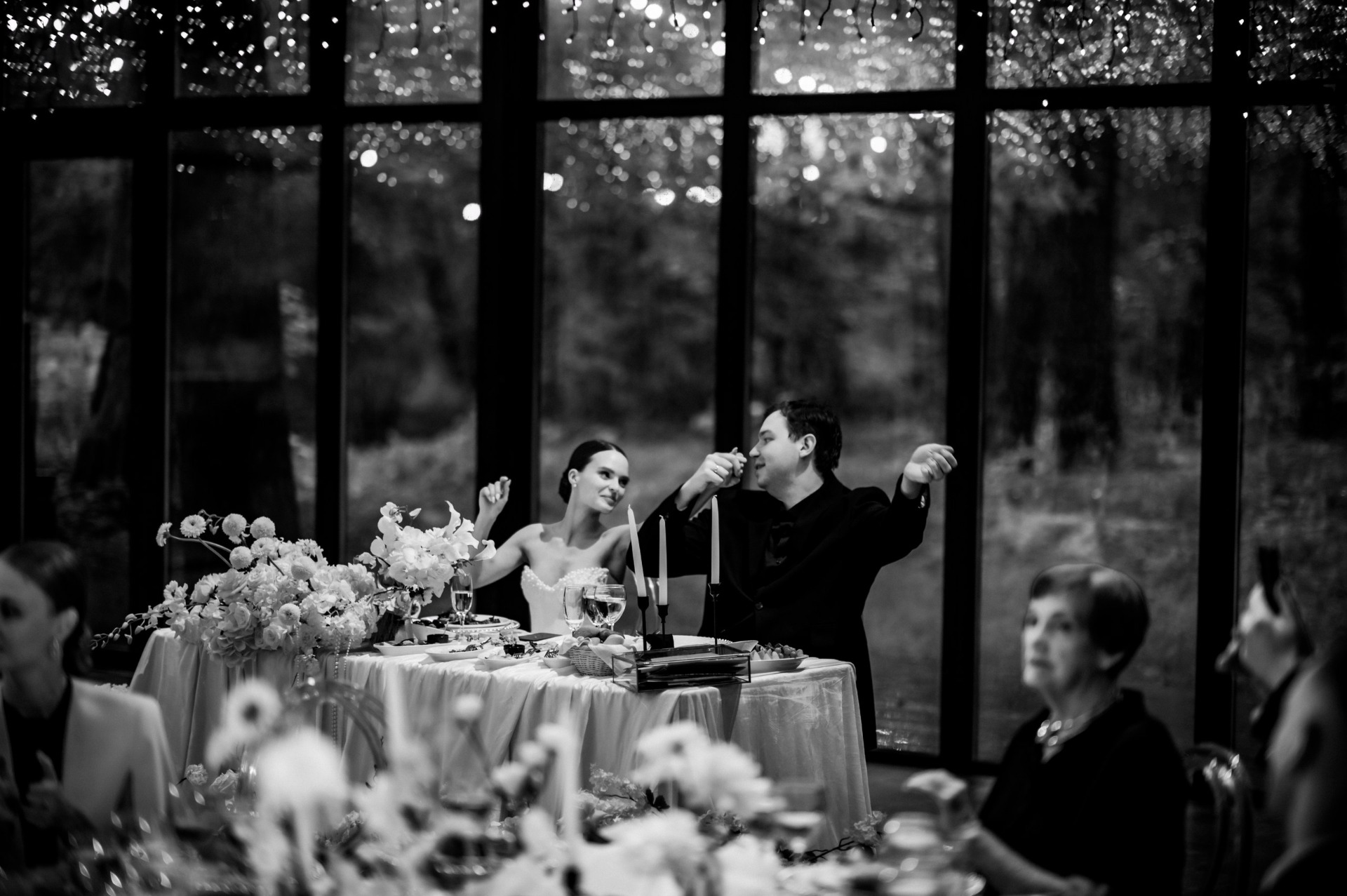 Сама свадьба была наполнена весёлыми и запоминающимися моментами. Ведущий отлично построил всю программу, в которой все приняли участие, и всем было весело и интересно. Вечер получился очень танцевальным. Из-за того что лил дождь и никто не выходил на улицу, танцпол был полон всегда, когда играла музыка. В завершение дня все были насквозь мокрые, но счастливые.