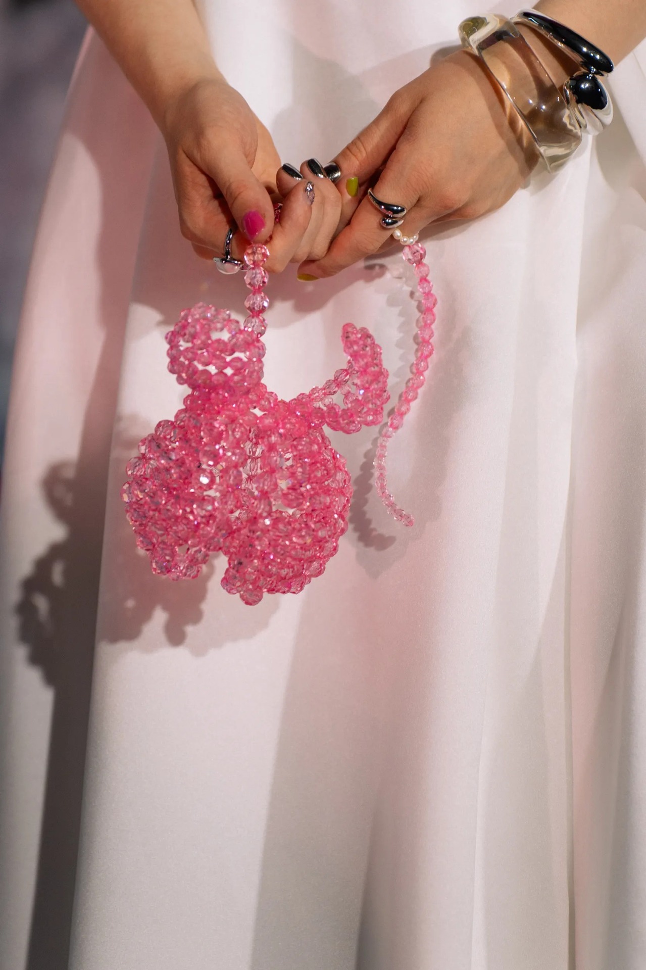 Я же хотела классическое длинное белое платье со шлейфом, но без лишней пышности. В свадебном салоне я нашла именно то, что искала. Образ я дополнила причёской с гладкой волной, заколками ручной работы, массивными украшениями, сумочкой цвета металлик и моим «букетом», собранным из розовых бусин вместо живых цветов. Живой букет я оставила только для весёлого розыгрыша в конце вечера.