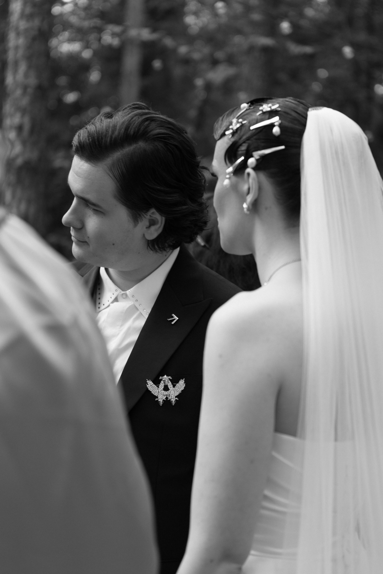 Для Лёши я искала костюм, который подчеркнул бы его индивидуальность и стал отсылкой к сюрреализму нашей свадьбы. Мы долго искали что-то с яркими принтами, почти в стиле Лас-Вегаса, и в итоге нашли идеальный вариант: чёрный костюм с интересным кроем, украшенный принтом с херувимами, белую рубашку со шипами на воротнике и брошь вместо бутоньерки. Образ дополняли кроссовки цвета металлик, а кудрявые волосы были стильно уложены — всё это делало его цельным, смелым и современным, идеально вписывающимся в концепцию свадьбы.