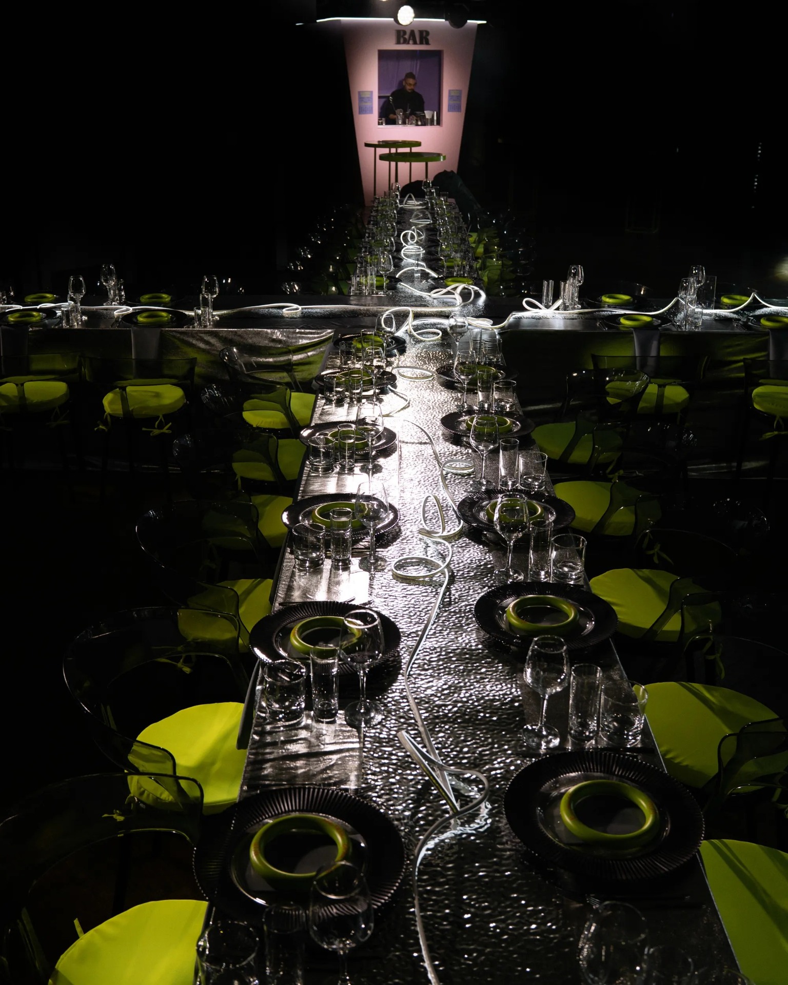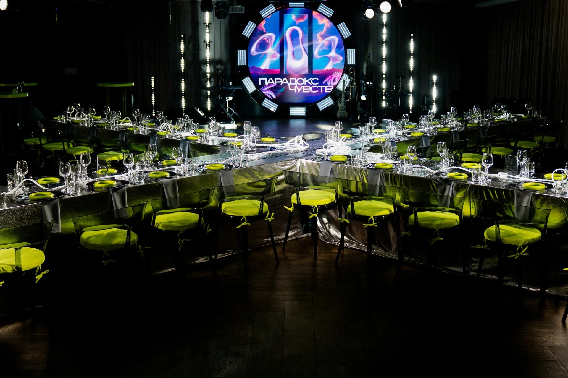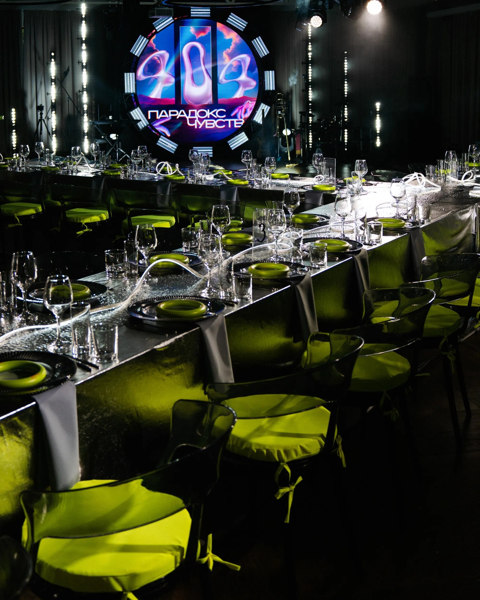 Мы полностью отказались от живых цветов, чтобы создать новый мир без привычных декоративных элементов. Весь зал был погружён в полный блэкаут, а пространство организовано так, что в разных его частях словно существовали свои мини-вселенные.