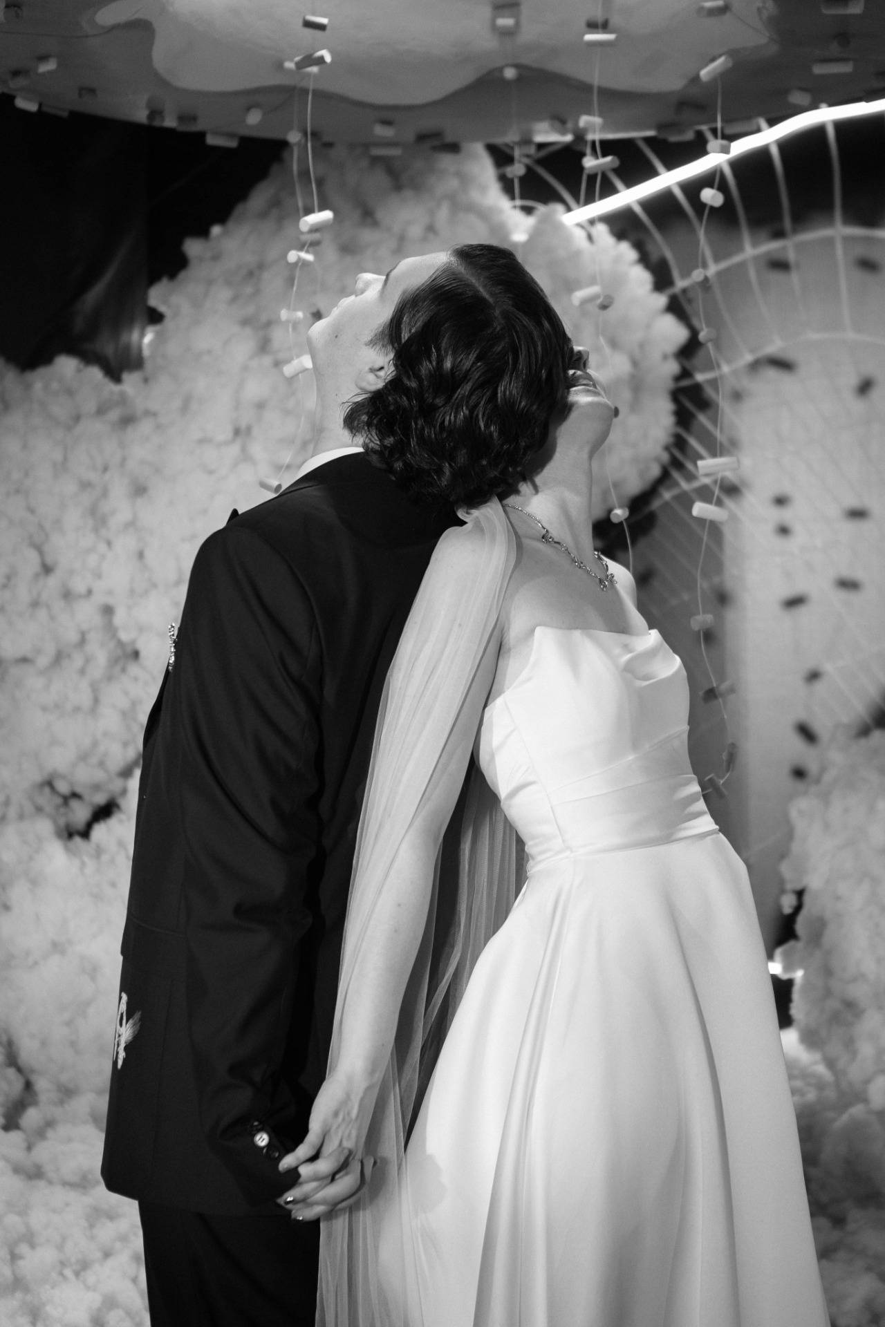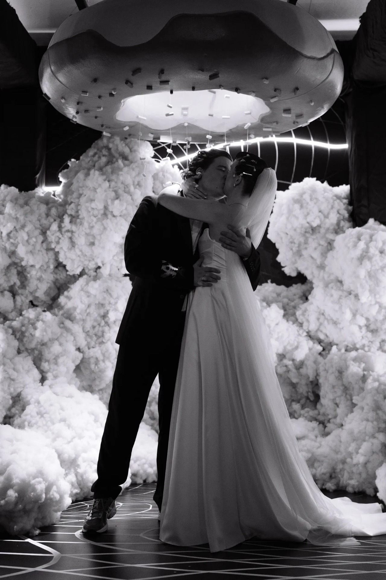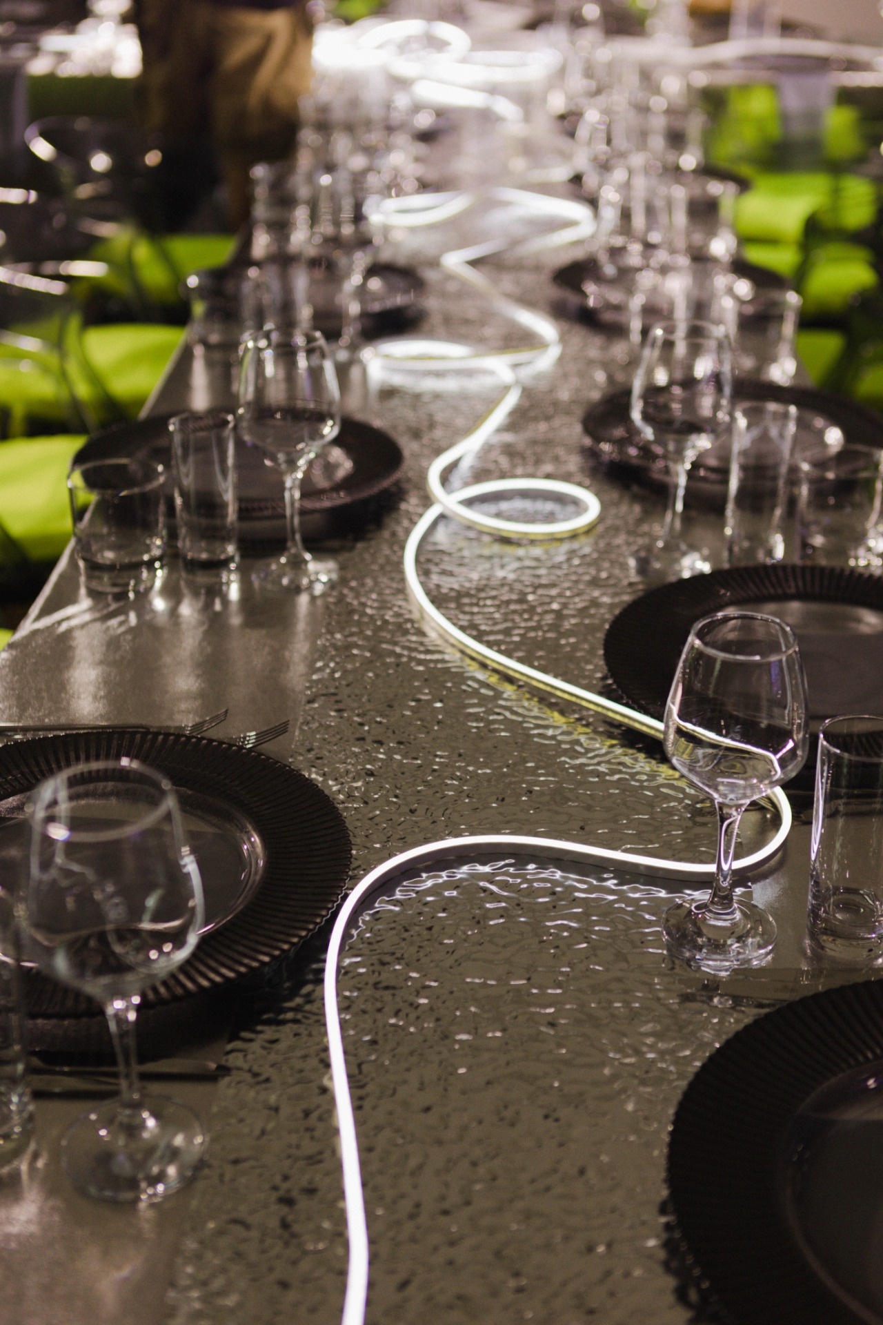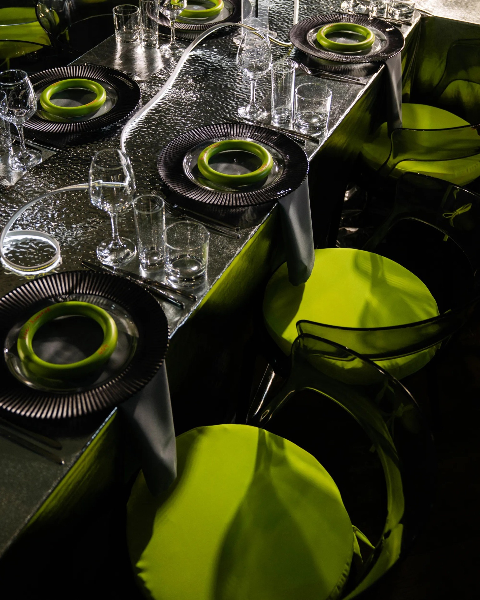 Мы полностью отказались от живых цветов, чтобы создать новый мир без привычных декоративных элементов. Весь зал был погружён в полный блэкаут, а пространство организовано так, что в разных его частях словно существовали свои мини-вселенные.