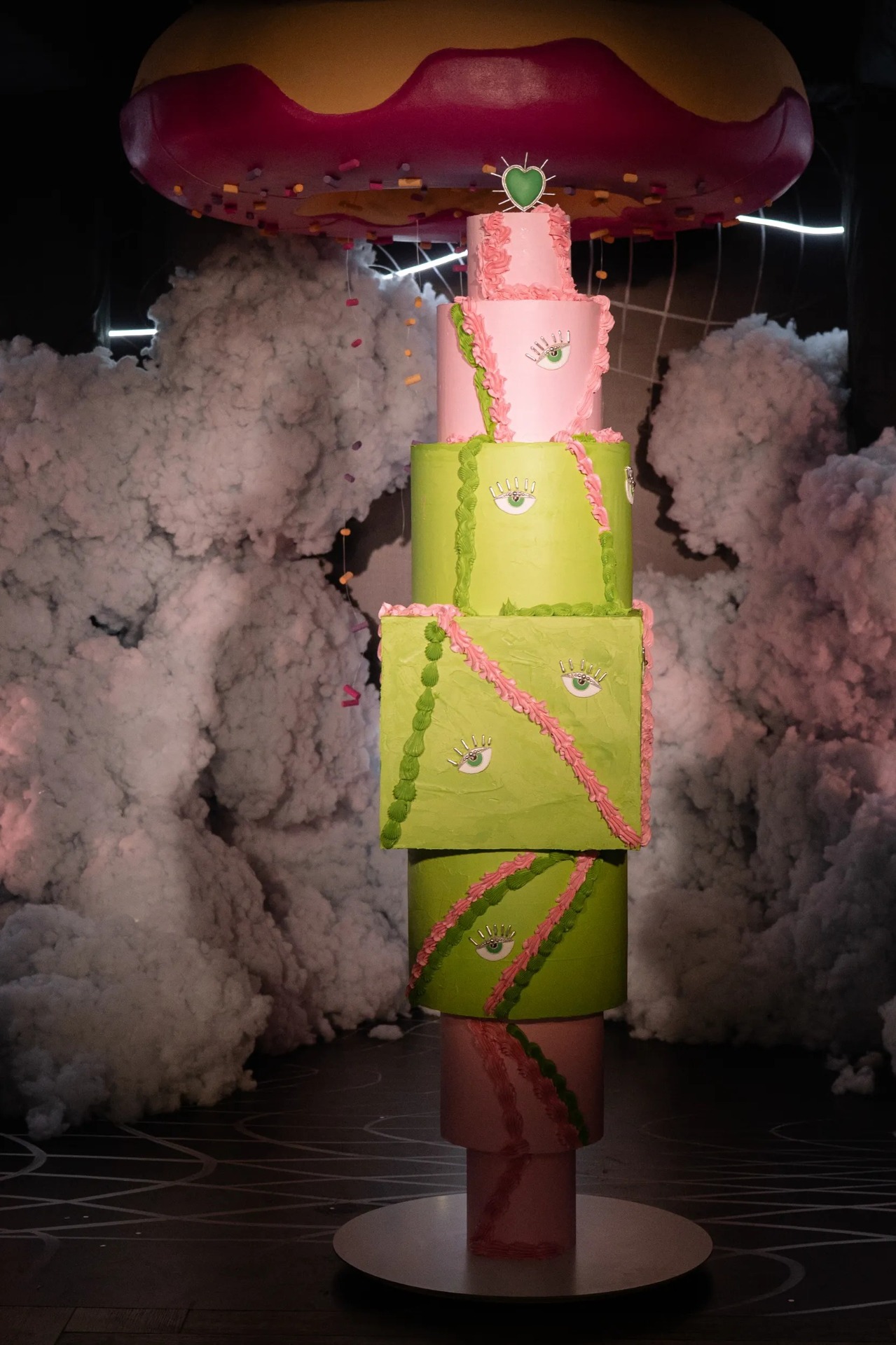Одним из ключевых символов стал огромный розовый пончик, из которого бил яркий луч, зависший над зоной церемонии и ставший точкой притяжения всего визуального стиля.