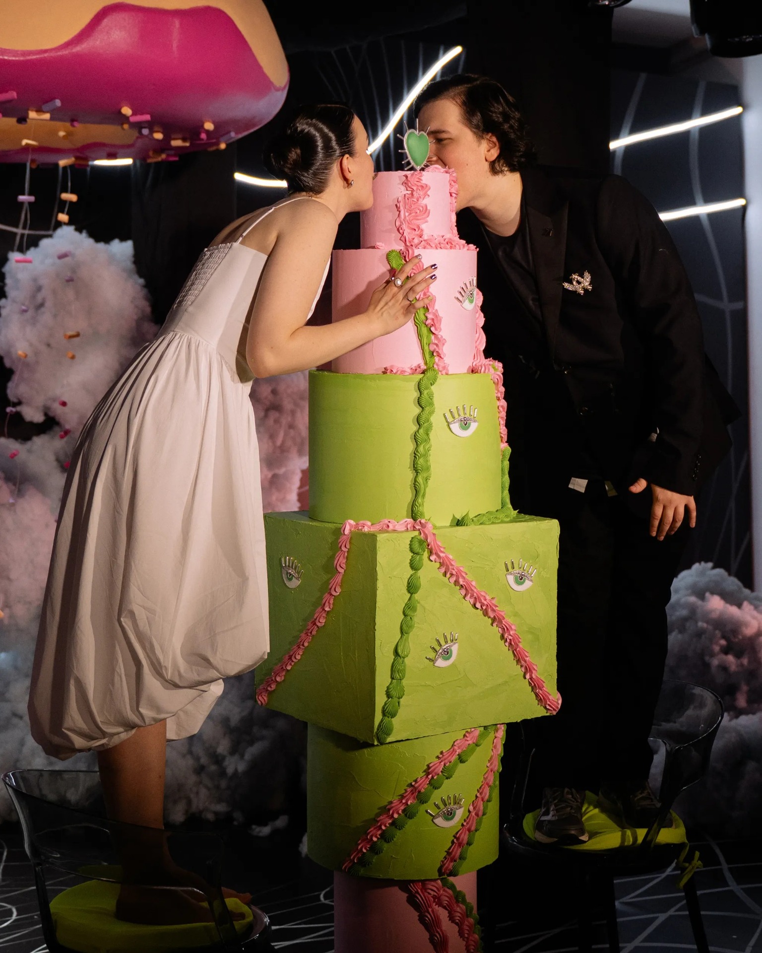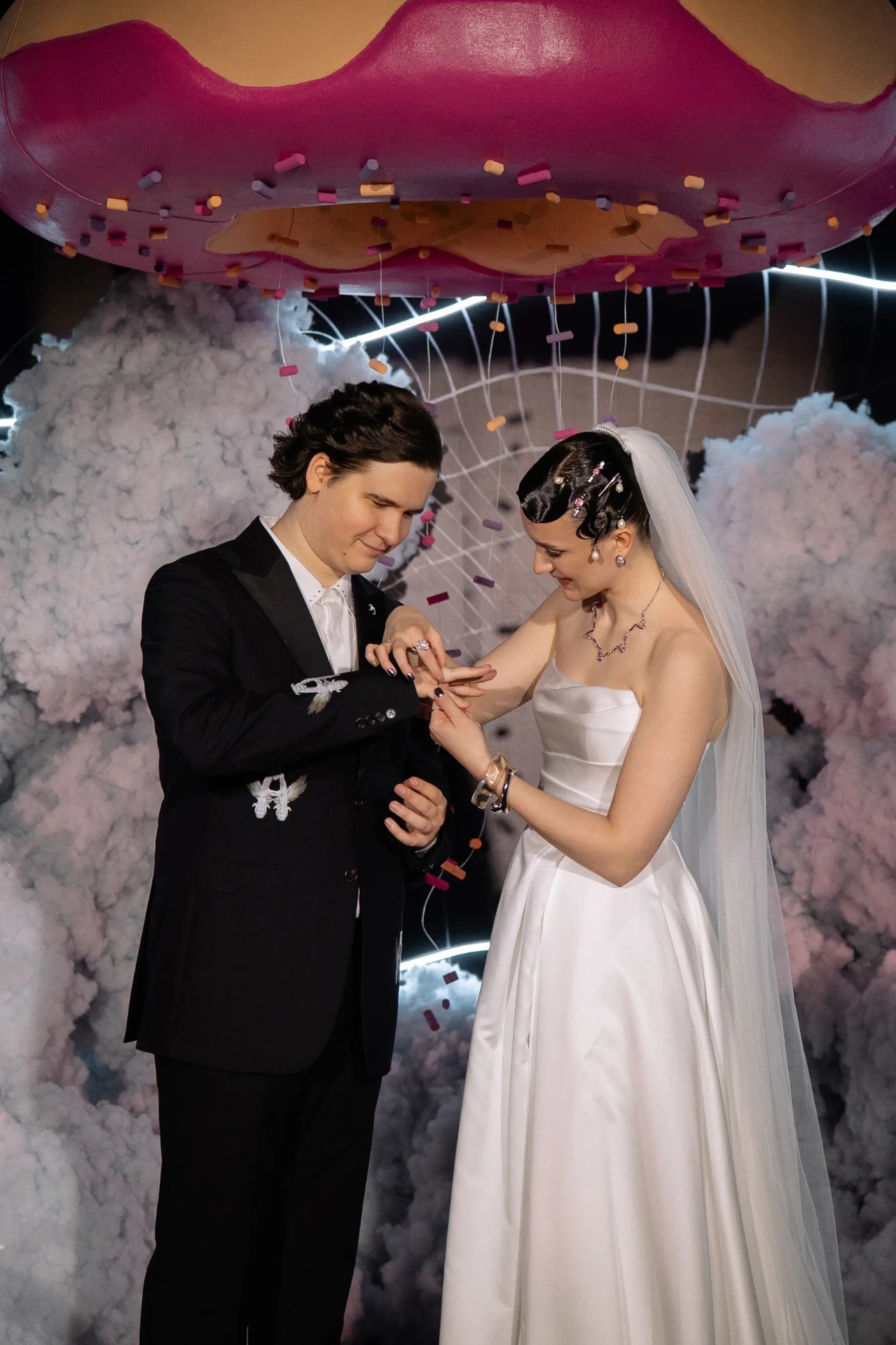 Церемония проходила под лучом огромного розового пончика, среди ваты-облаков и оптических иллюзий. После церемонии мы создали «коктейль вечера», доступный всем приглашённым.