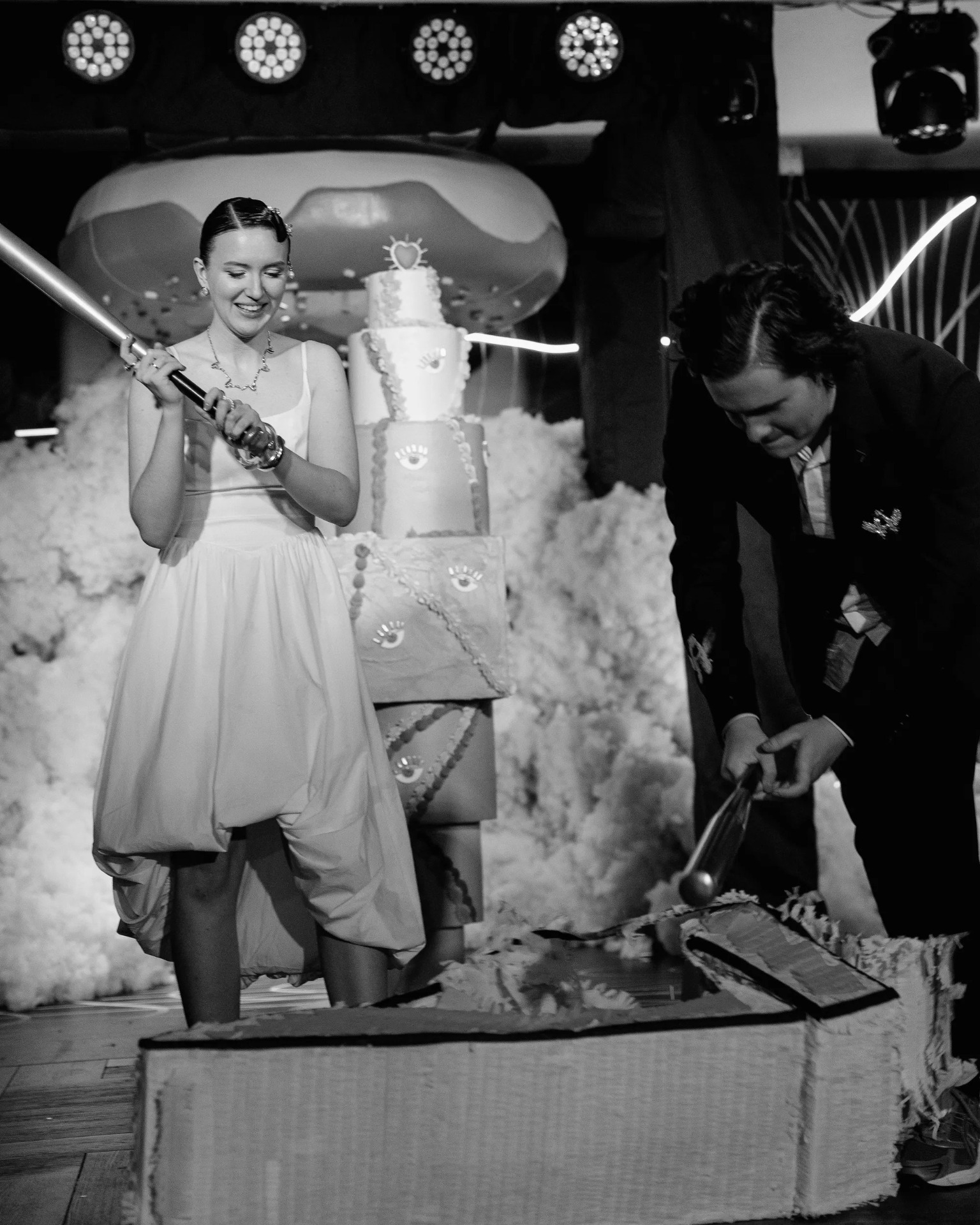 Финалом праздника стали двухметровый торт и стрелка-пиньята: мы разбили торт битами, а затем вместе с гостями — стрелку с подарками. Это был взрыв радости и абсурда.