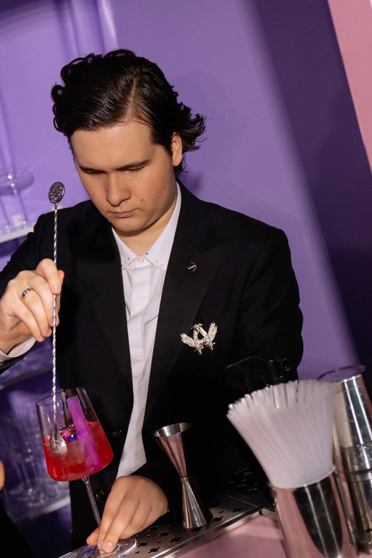 После фуршета всех облачили в мантии и раздали повязки — впереди был иммерсивный вход. В холле звучал интригующий текст, лёгкий дым создавал эффект другого мира, а печать на руке служила пропуском в альтернативный бар. Когда двери открылись, гости увидели сюрреалистический зал и испытали полный «вау»-эффект. Голограмма объявила правила пребывания в этом пространстве.