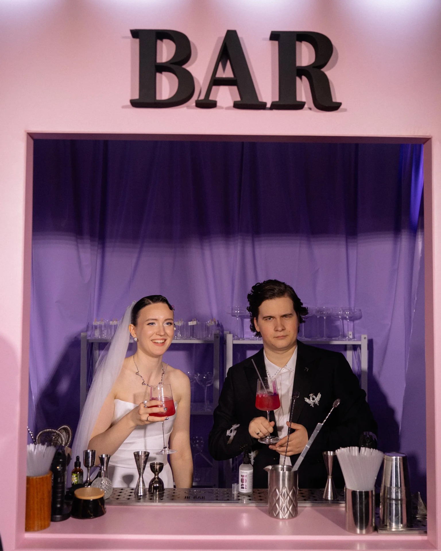 Мы готовились около полугода. С самого начала мы знали: нам хотелось не «бежевой» свадьбы, а чего-то яркого, необычного, может быть, даже немного абсурдного — того, что отражало бы нас на 100%. Организаторы сразу уловили наше настроение и предложили концепцию, от которой у нас буквально загорелись глаза: футуристично-сюрреалистичный бар-путешествие, где всё идёт не по плану, время будто зависает, а реальность меняется прямо у тебя под ногами.