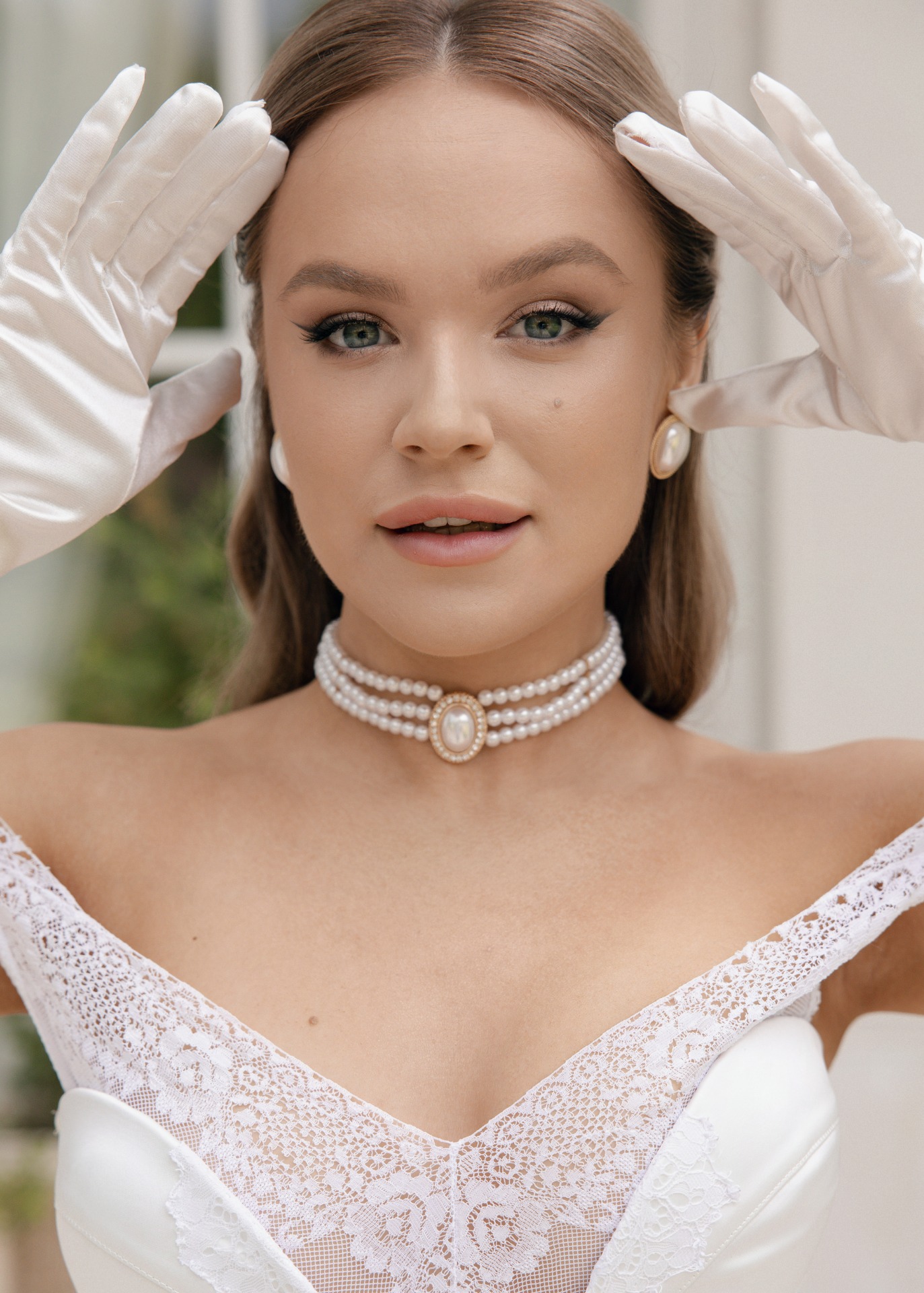 Первый — для утра невесты: корсет в стиле XVIII–XIX веков, нити жемчуга, винтажные украшения и перчатки.