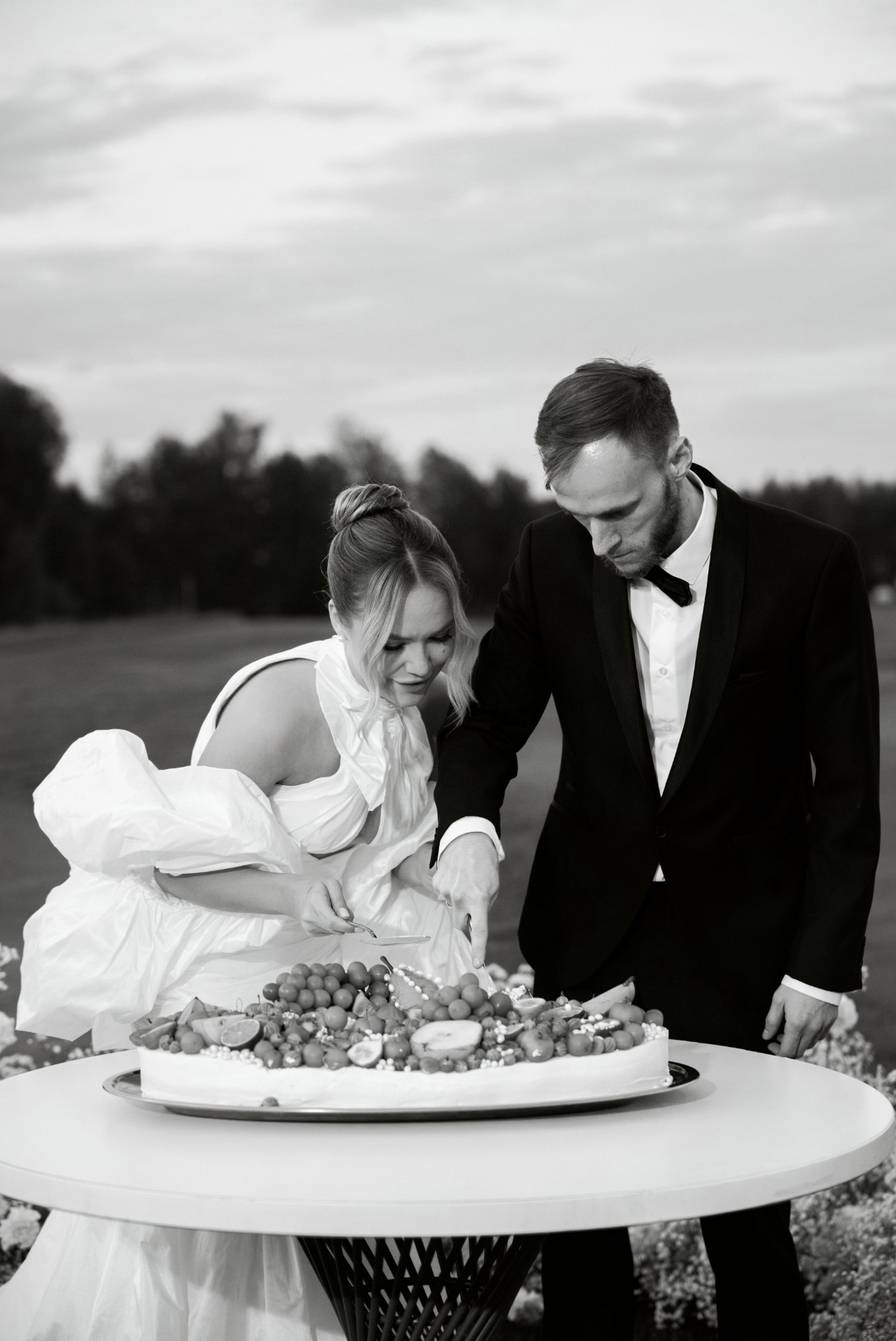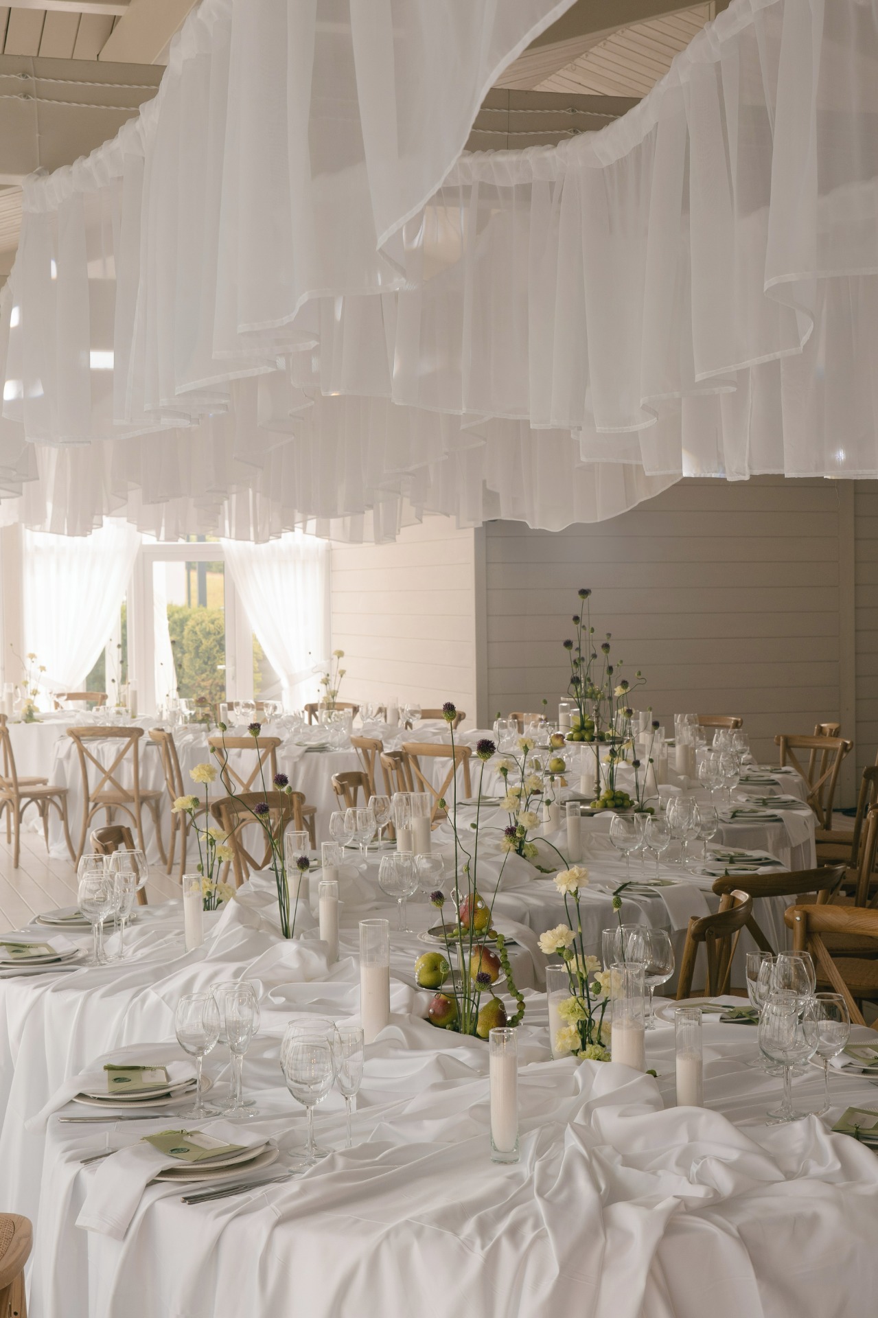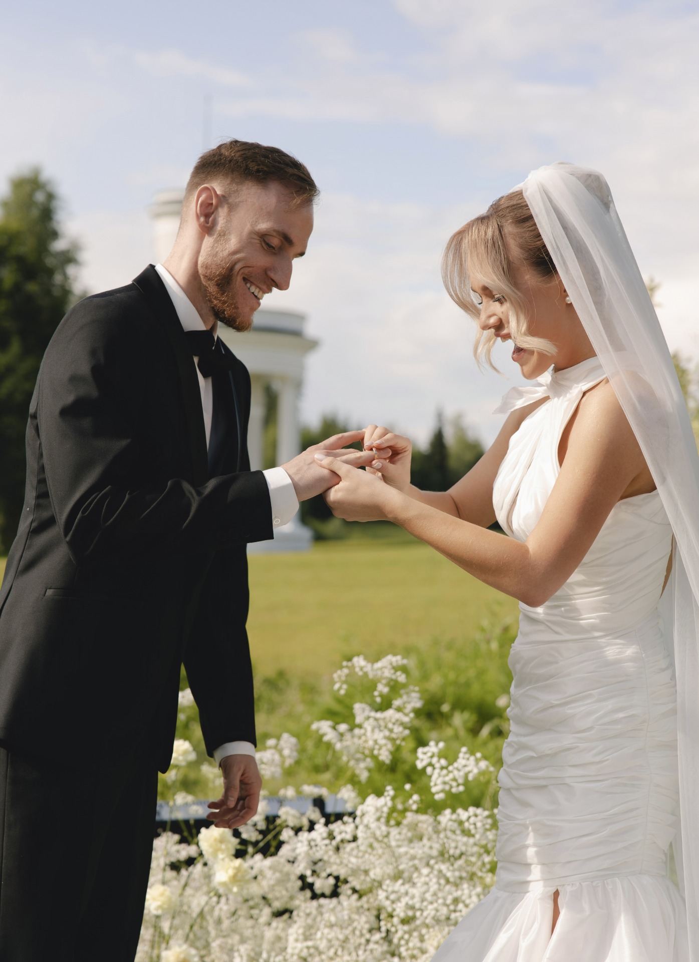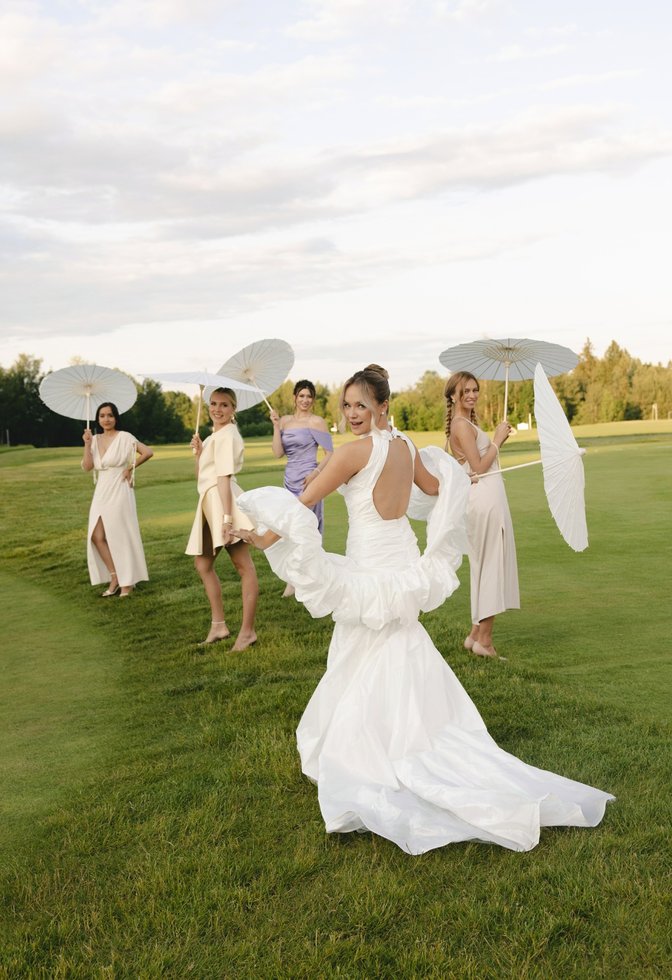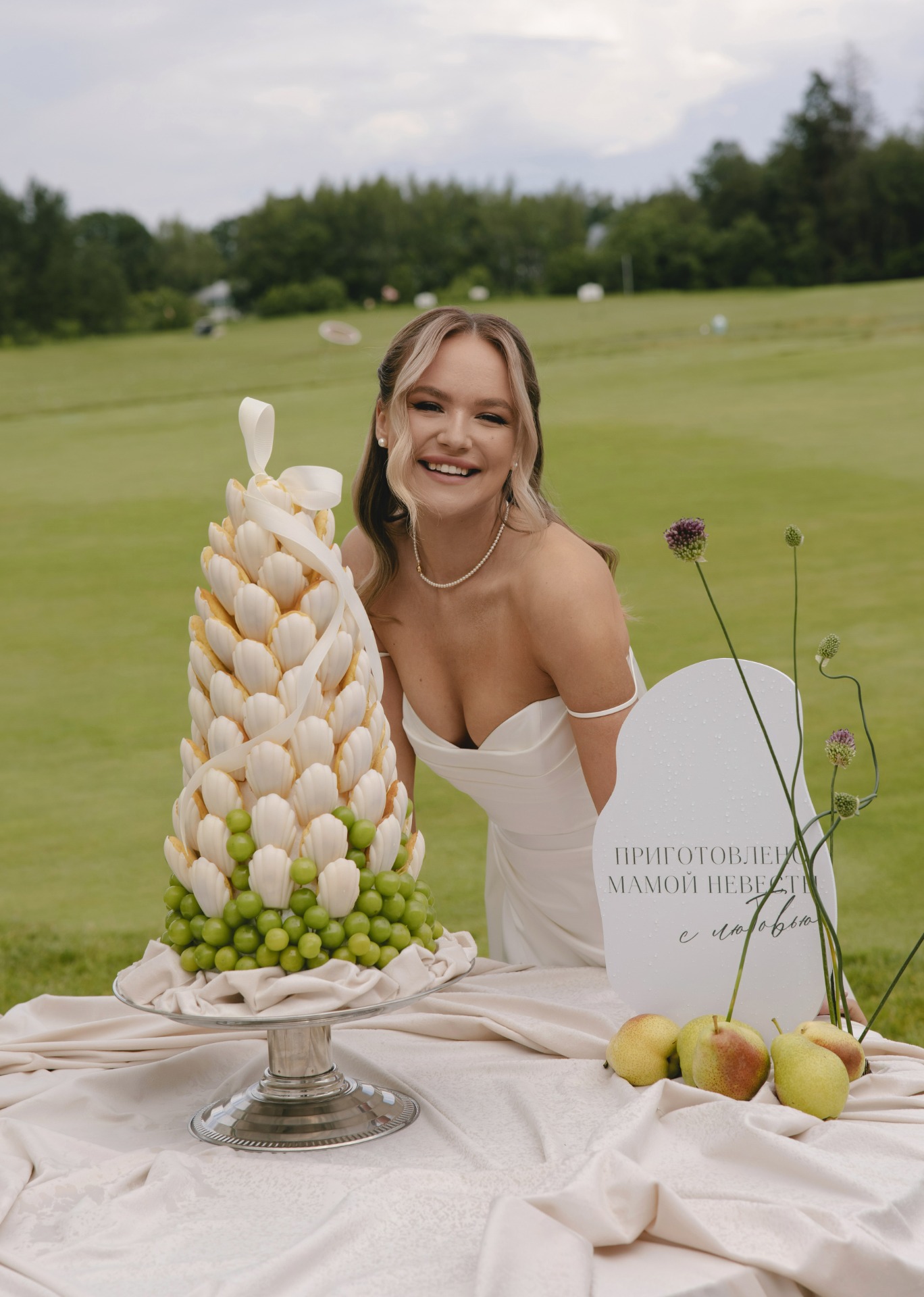 Я точно знала, что хочу свадьбу в стиле old money, которая отражала бы нашу историю. Мы с Владом часто заключаем пари и спорим. Например, однажды у нас был спор, кто сможет за один месяц научиться стоять в планке на протяжении 7 минут. И я выиграла. Так на свет появилась концепция «Пари на всю жизнь». Также в качестве изюминки нашей свадьбы мы выбрали небольшие соревнования между командами жениха и невесты. Проигравшая команда должна была исполнить мечту победителя. Основной активностью для наших гостей стал гольф: мы поделились на команды и соревновались с азартом, как дети. Играли все, даже бабушки.