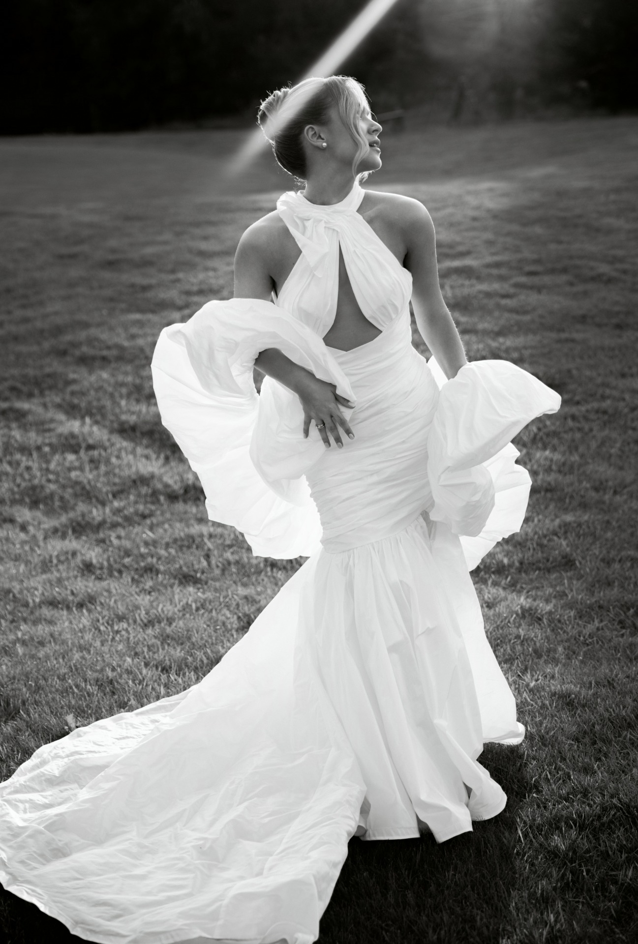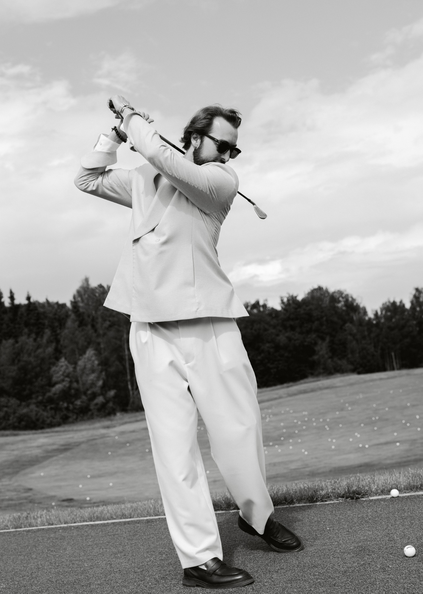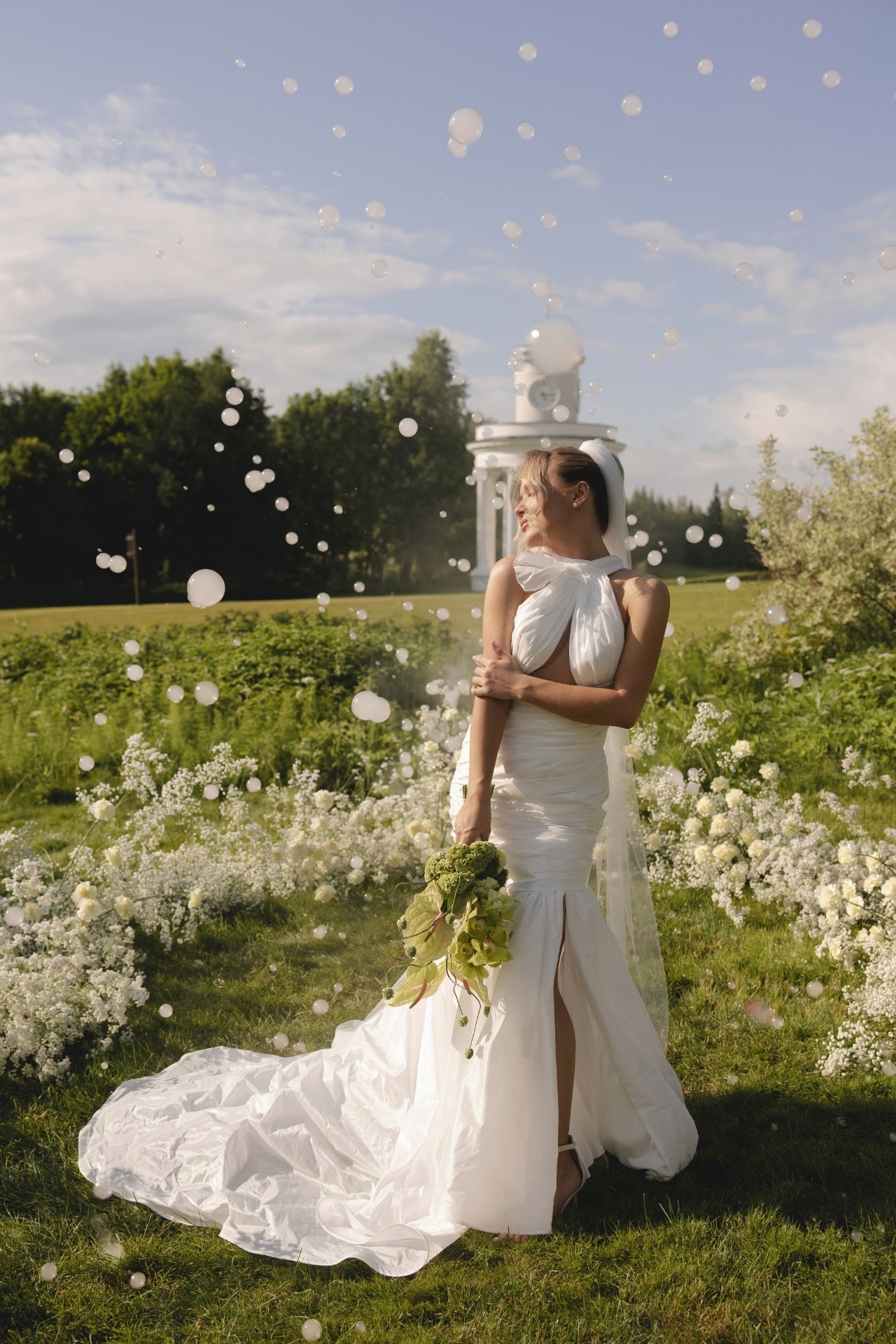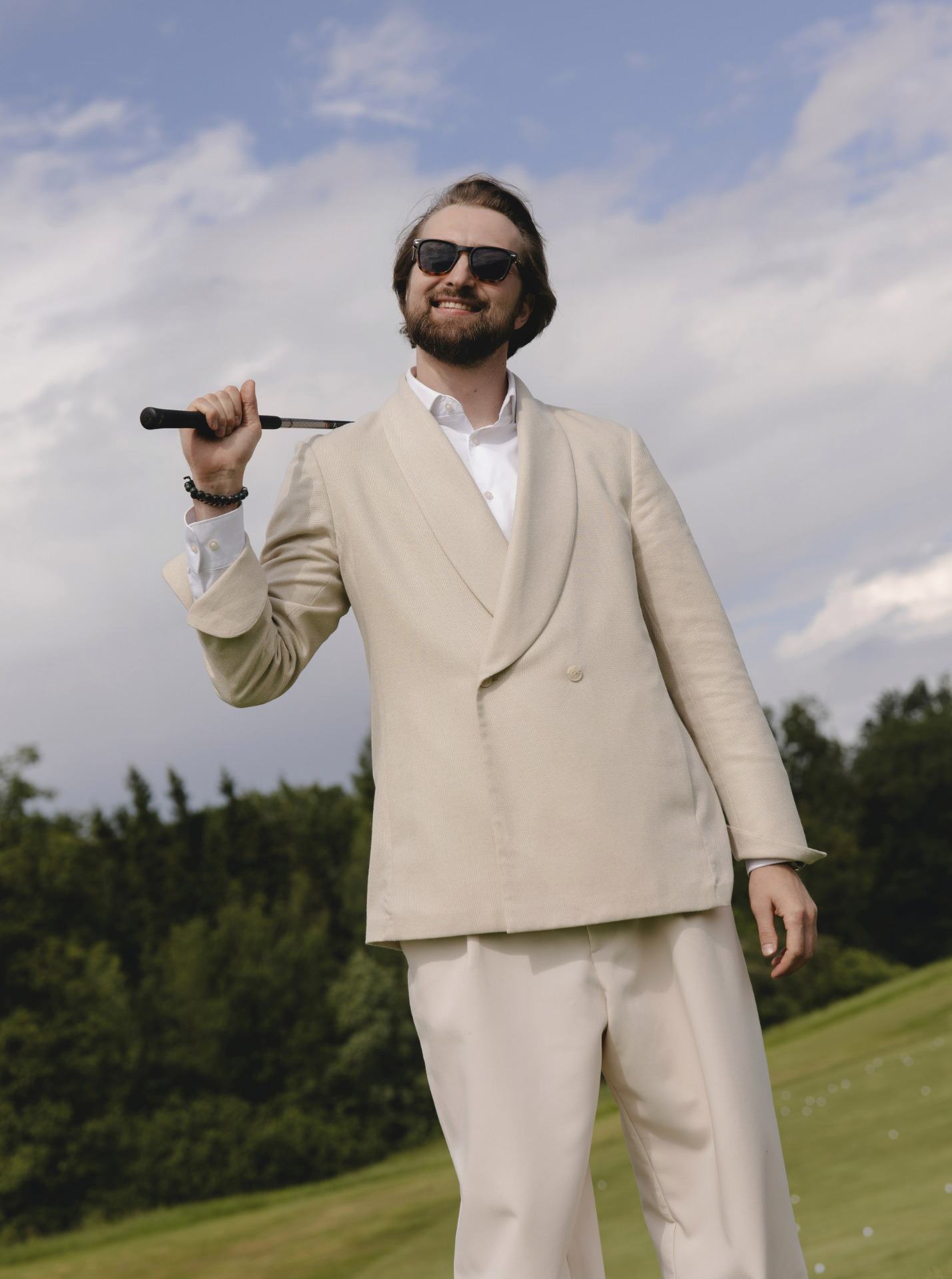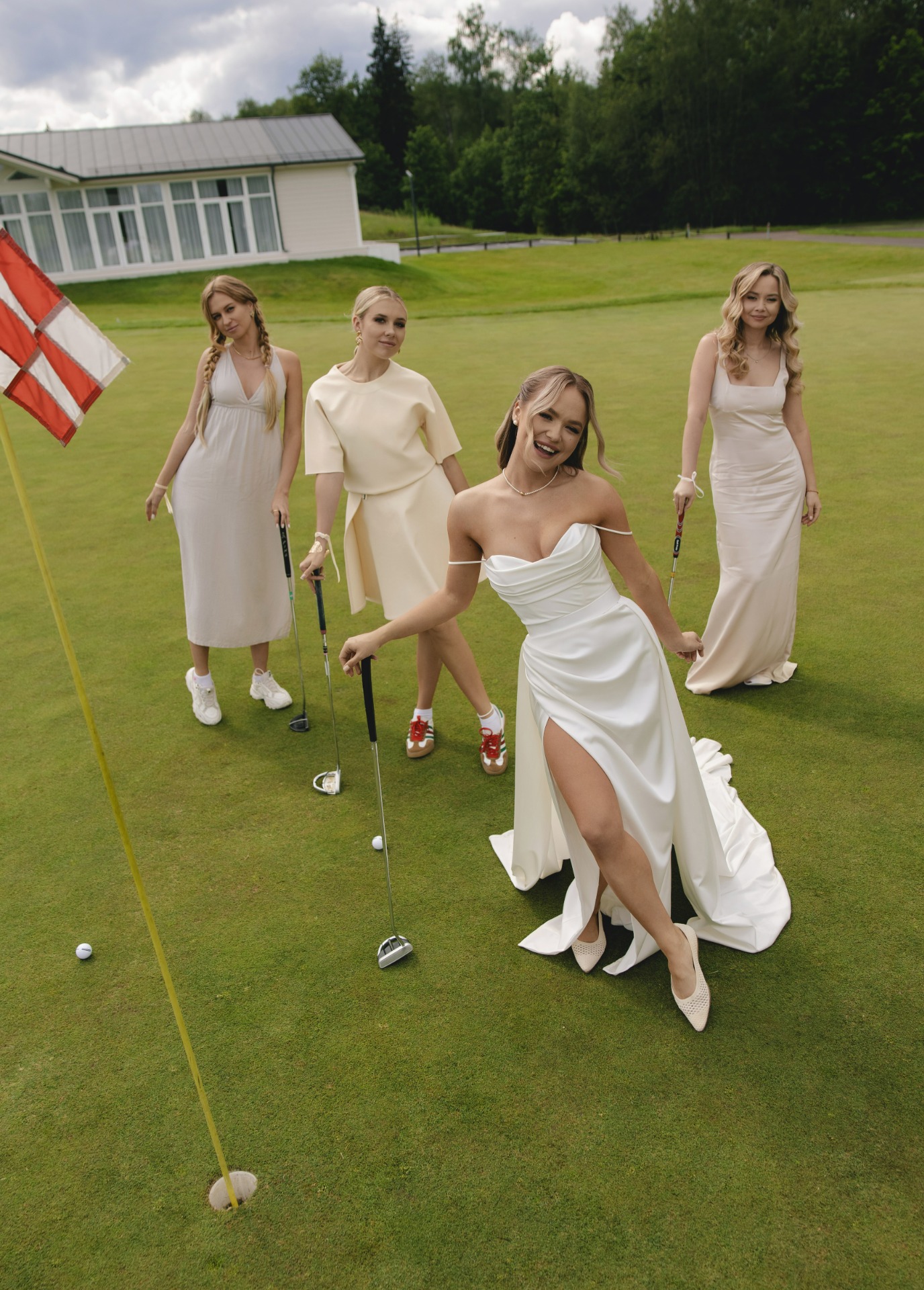 На велком я выбрала корсетное платье со съёмной юбкой-шлейфом. Аксессуары подбирала в стиле old money: перчатки и жемчуг — так, чтобы играть в гольф было и удобно, и красиво.
