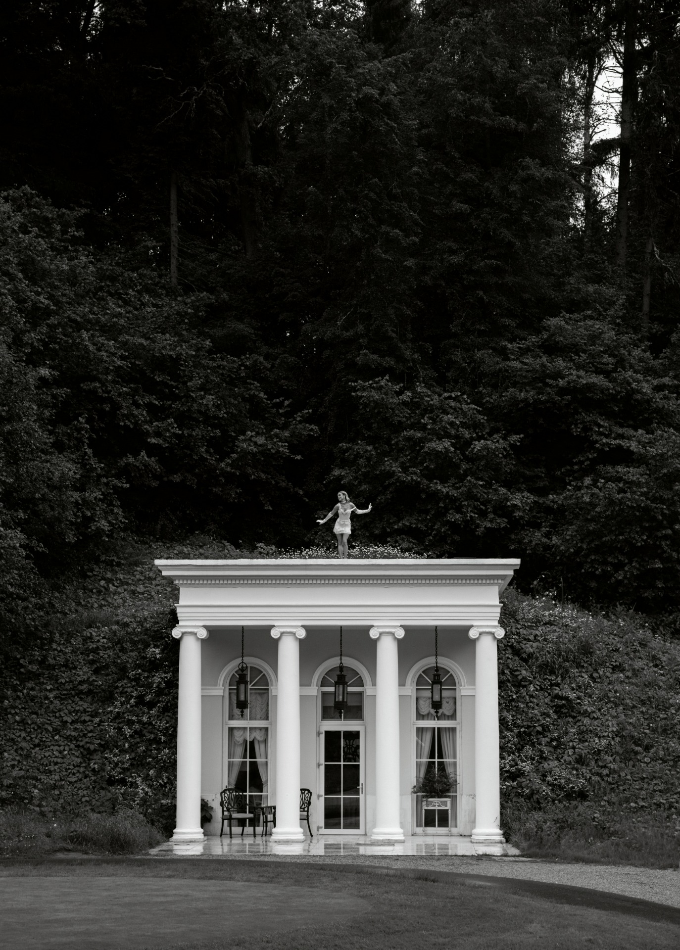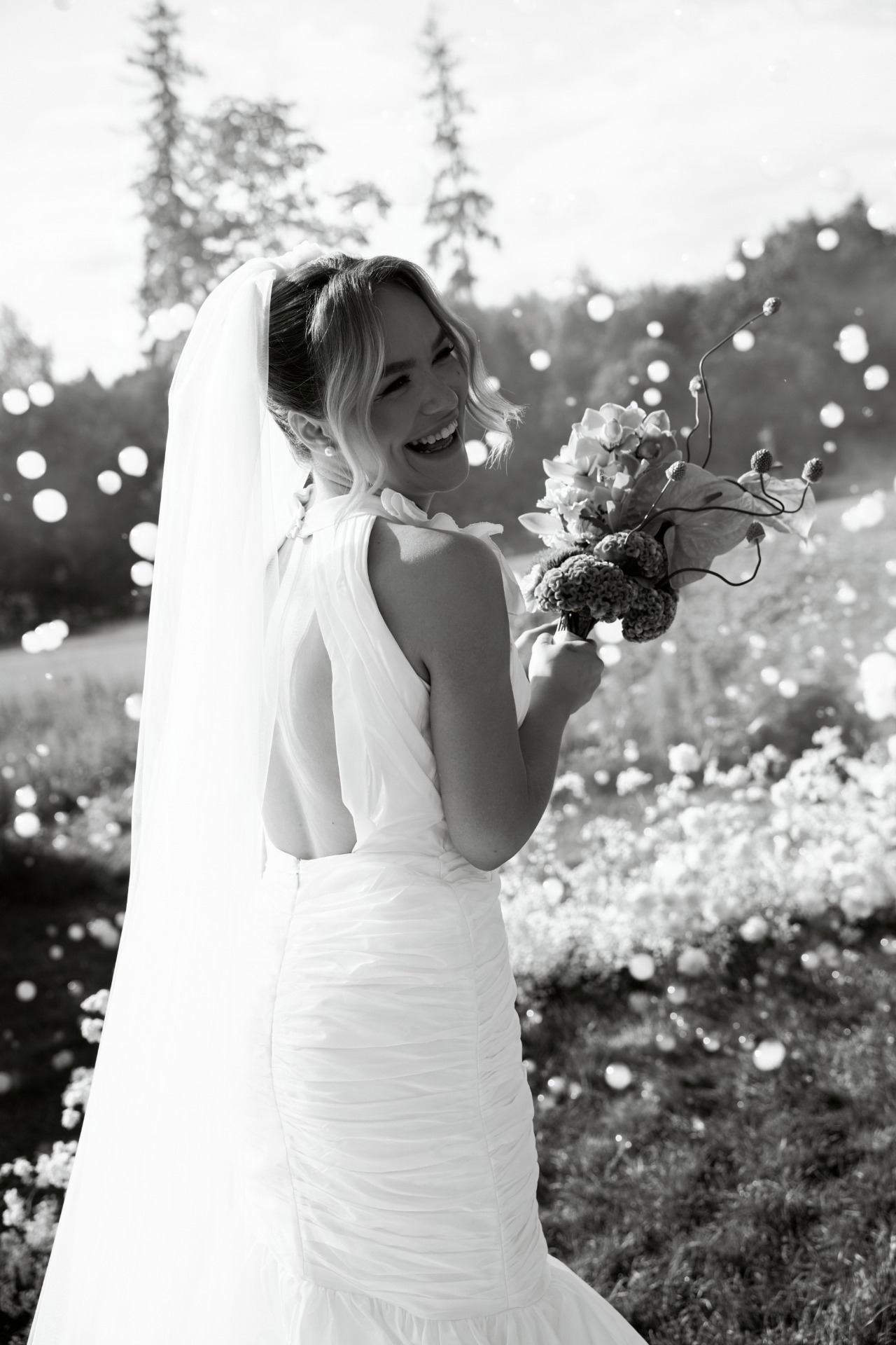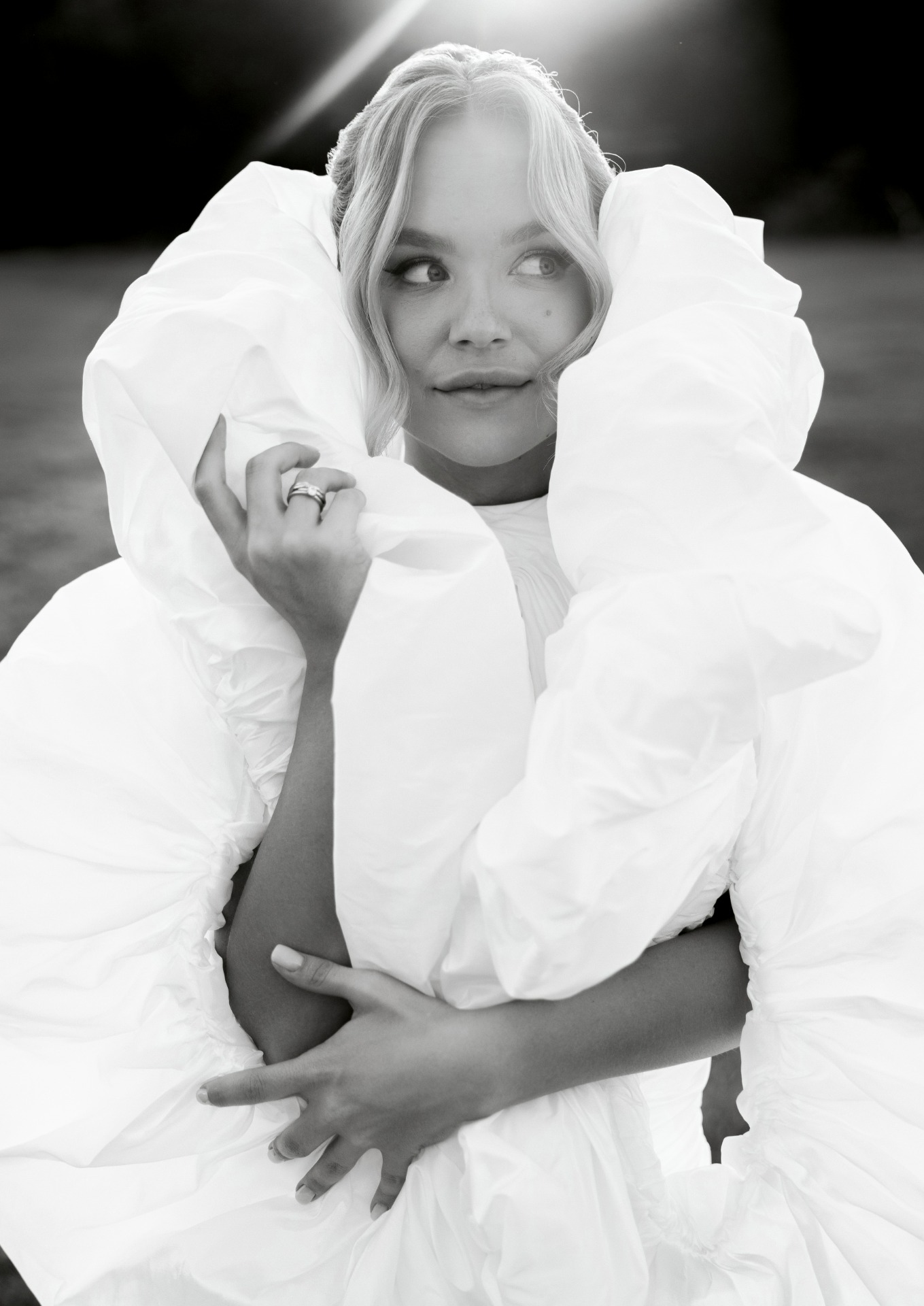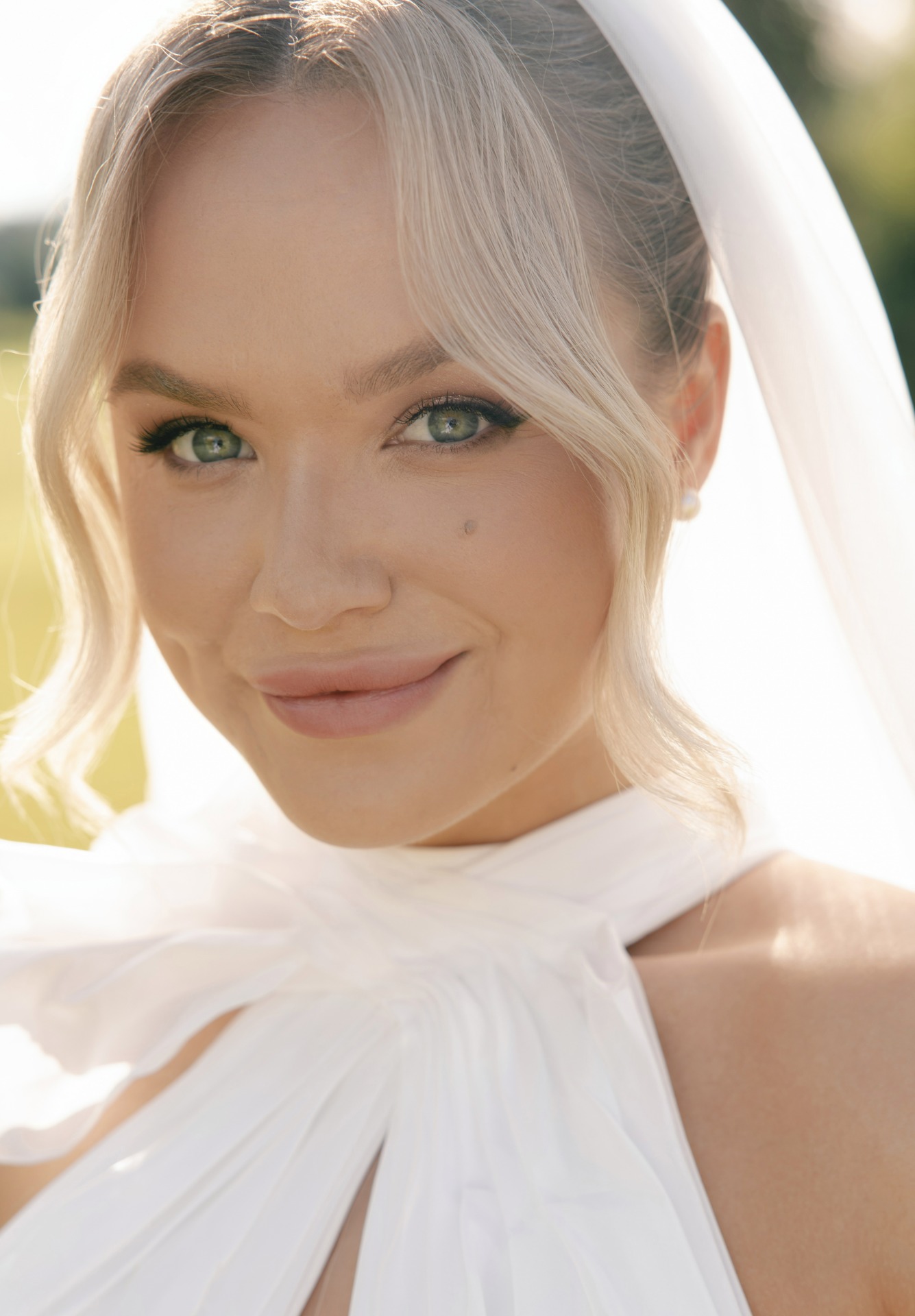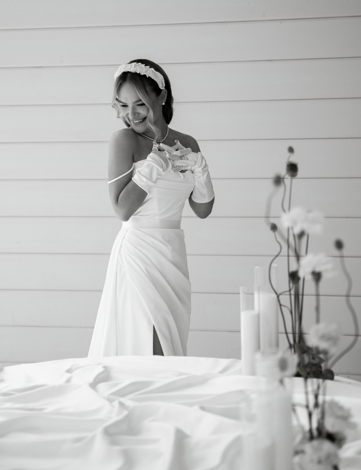 На велком я выбрала корсетное платье со съёмной юбкой-шлейфом. Аксессуары подбирала в стиле old money: перчатки и жемчуг — так, чтобы играть в гольф было и удобно, и красиво.