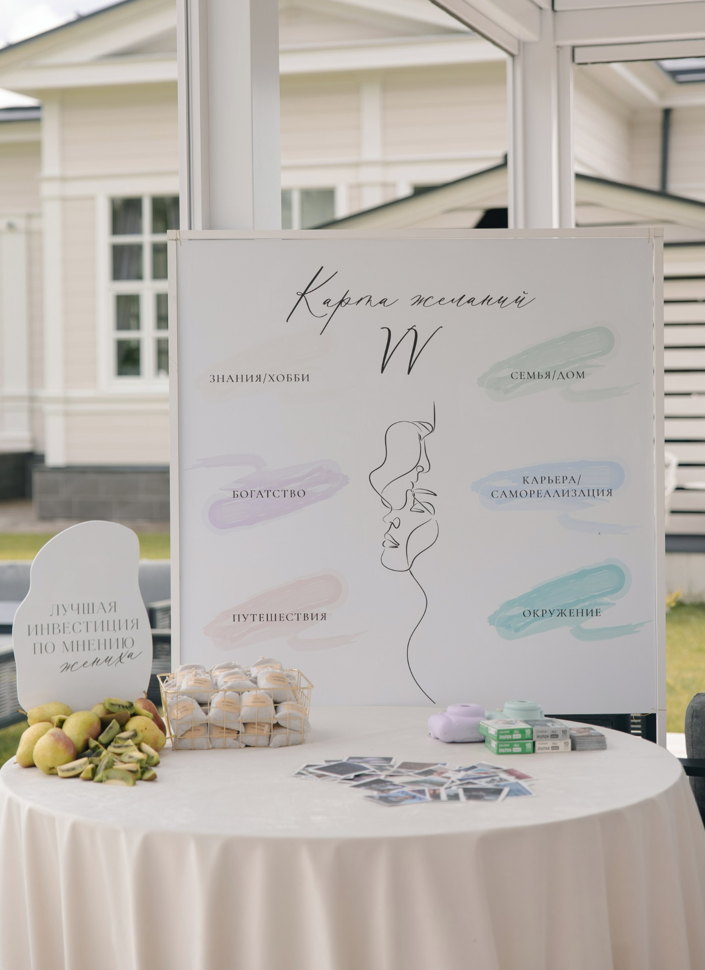 Интересной деталью на велкоме стала карта желаний. Мы подготовили огромное панно с различными сферами жизни и иллюстрациями, а гости сами составляли для нас карту желаний. Теперь это не только память, но и цели нашей семьи!