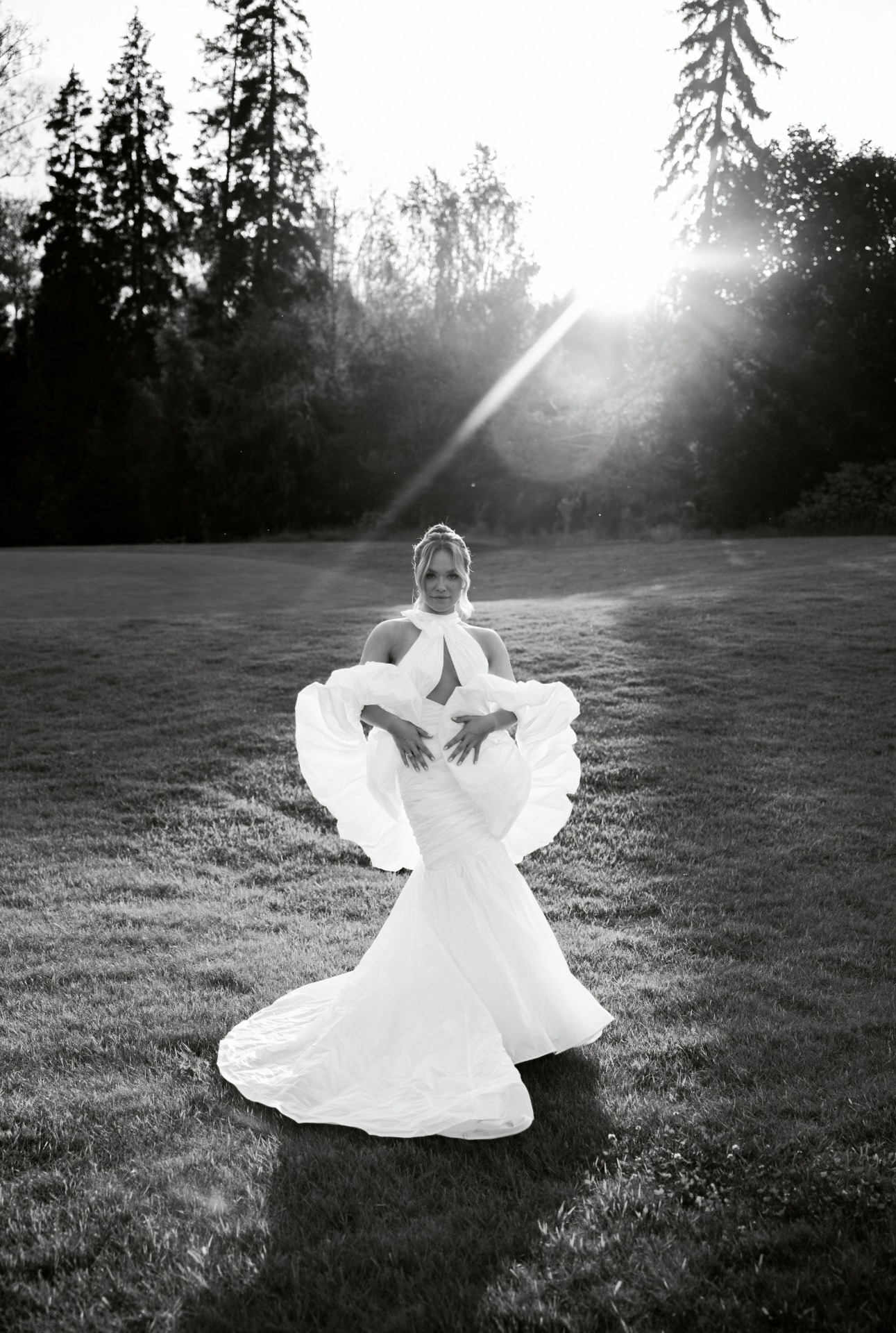 Третий образ был самым впечатляющим. Платье-рыбка с воротником-стойкой, открытой спиной и фатой отличалось необычной тканью и эффектным кейпом, который стал главным акцентом моего образа.