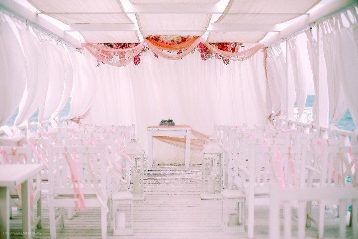 Так как я люблю пастельные цвета, мы решили выбрать оттенки бледно-розового и оливковых цветов. В конечном счете все было волшебно! Ребята-декораторы сделали все именно так, как я себе представляла. Я не могла налюбоваться на белый пирс, выходящий в море и оформленный нежными оттенками розового и цвета айвори, и наслаждалась каждой деталью: аркой из цветов, под которой и проходила наша церемония, развевающимися по ветру ленточками на белых стульчиках для гостей, залом, где на столах красовались канделябры со свечами, столом жениха и невесты в цветах, лампочками, висящими на потолке и создававшими еще больший уют, легким и ласкающим слух шумом волн. Именно в такой обстановке я хотела сказать “Да!” любимому.