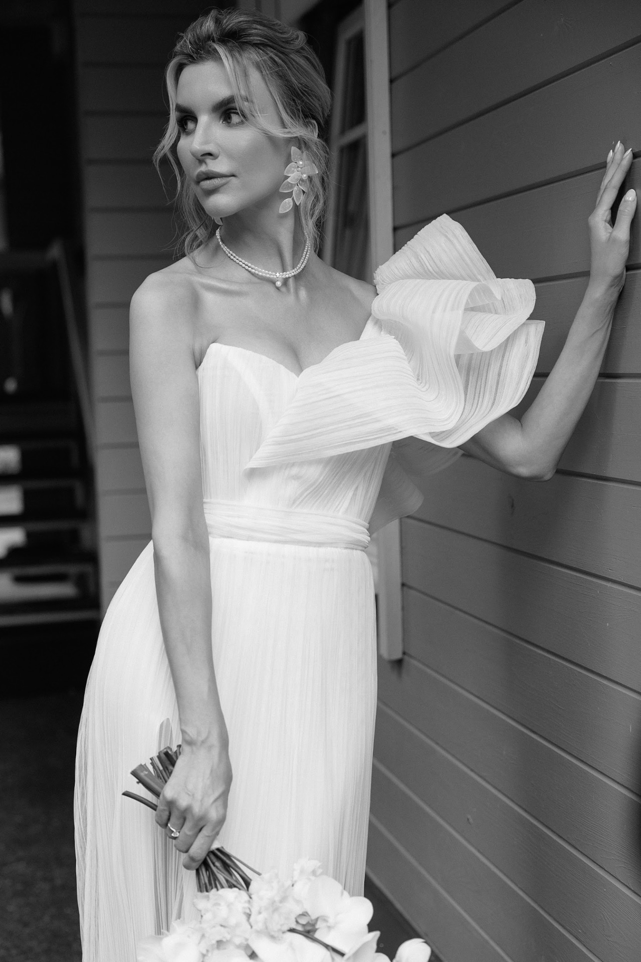 Мой образ невесты состоял из двух нарядов. Основное платье было от российского дизайнера — Lana Marinenko. Это было воздушное платье с воланом на плече. Мне хотелось необычное, нестандартное платье, и у меня получилось найти то, что я хотела именно у этого дизайнера.