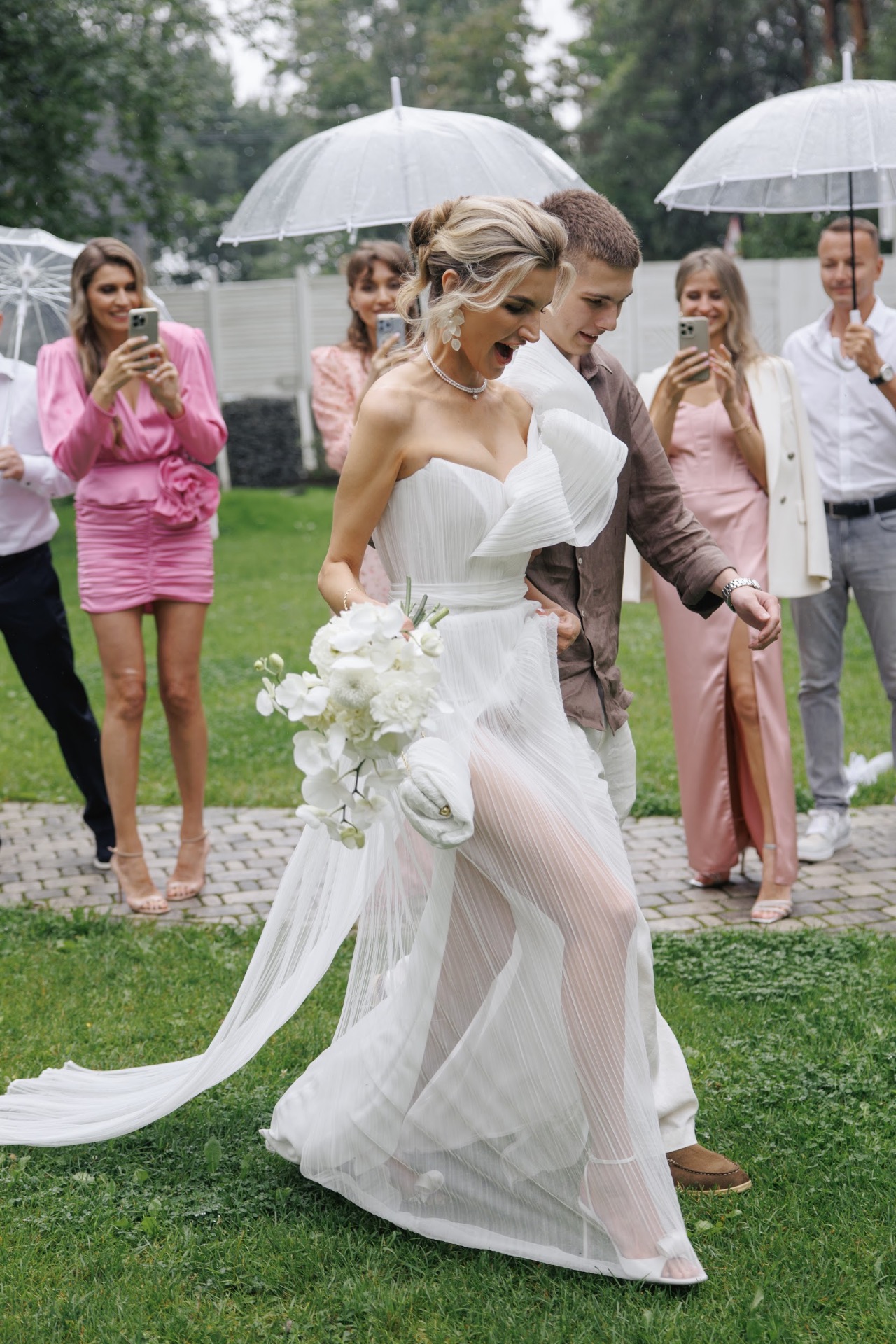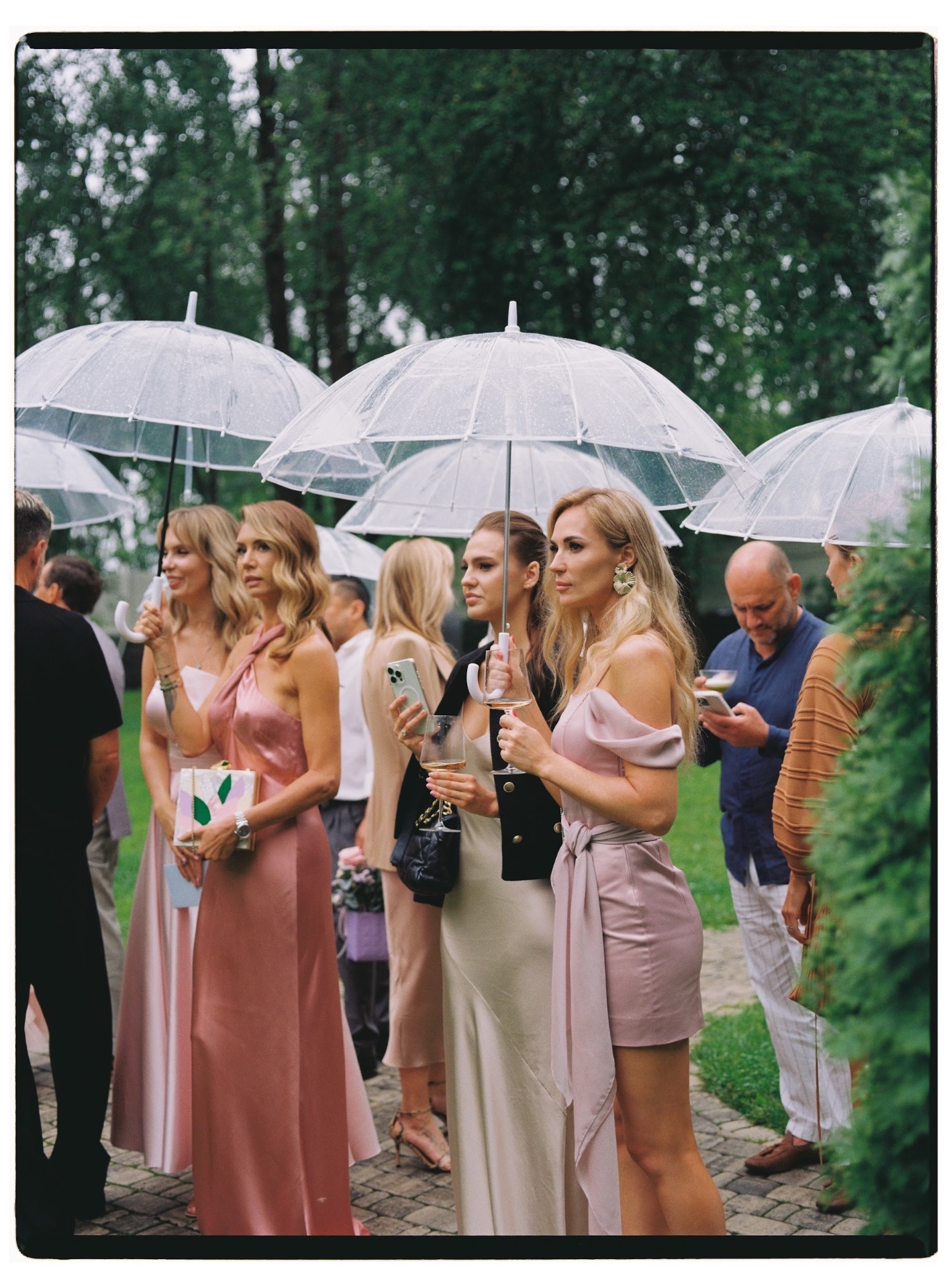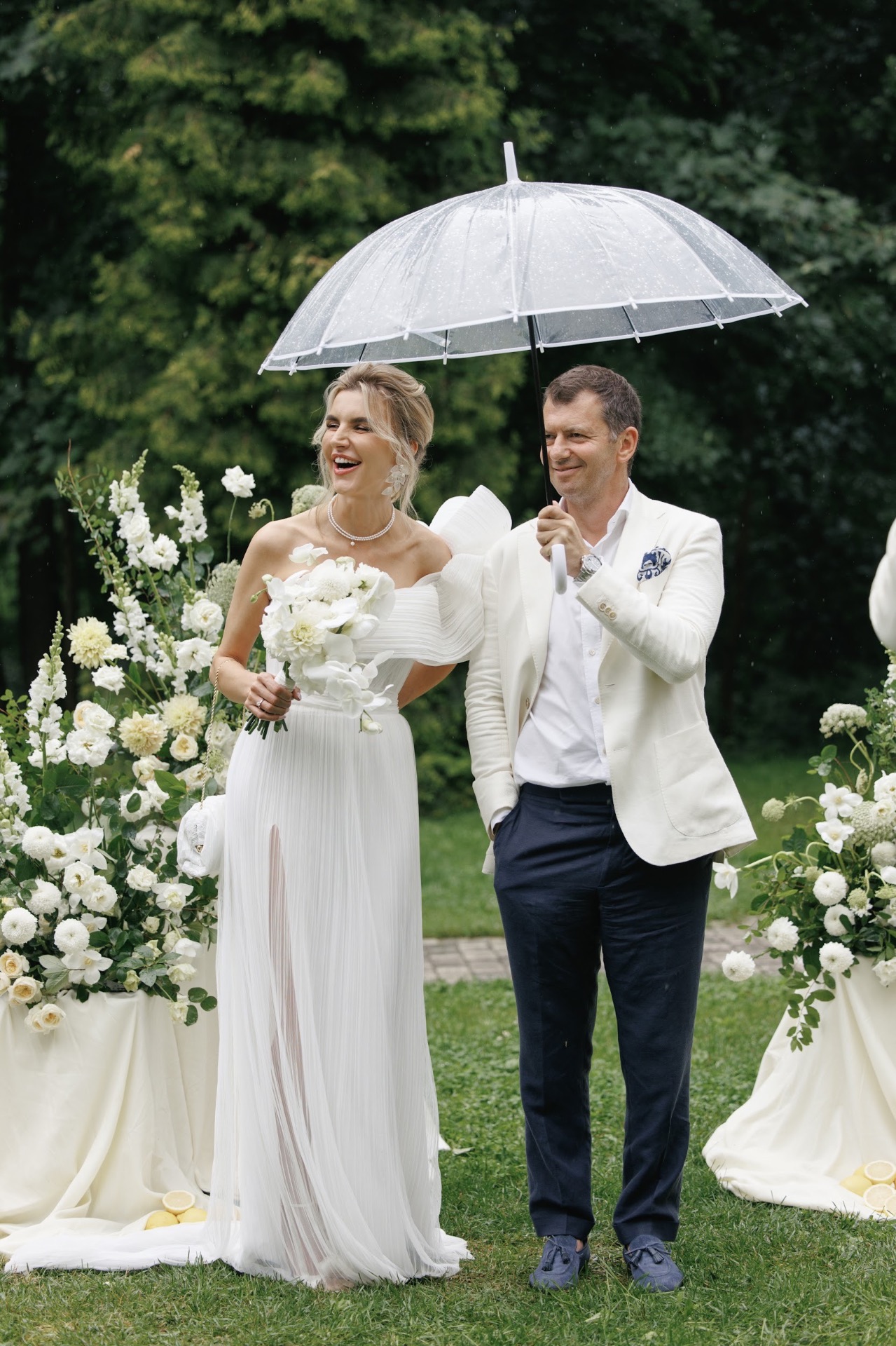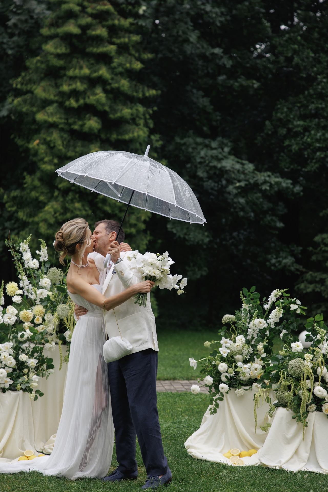В день свадьбы лил дождь, это было не запланировано. Но наша команда не растерялась, столы разместили внутри ресторана, а танцы и кавер-группа прошли на улице. Я очень хотела, чтобы все танцевали на траве, и, к счастью, к началу церемонии дождь почти закончился, и мы смогли воплотить эту идею!