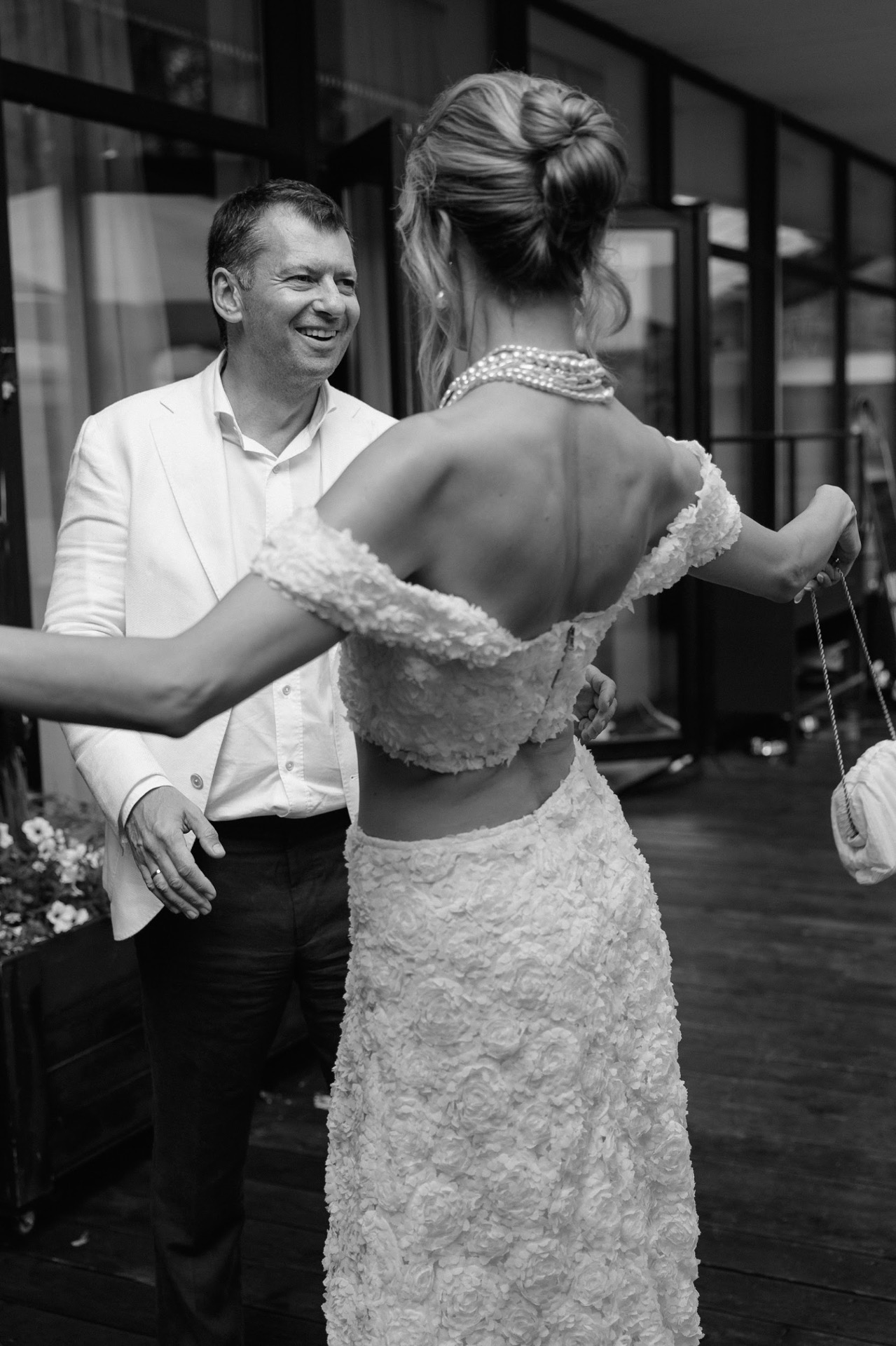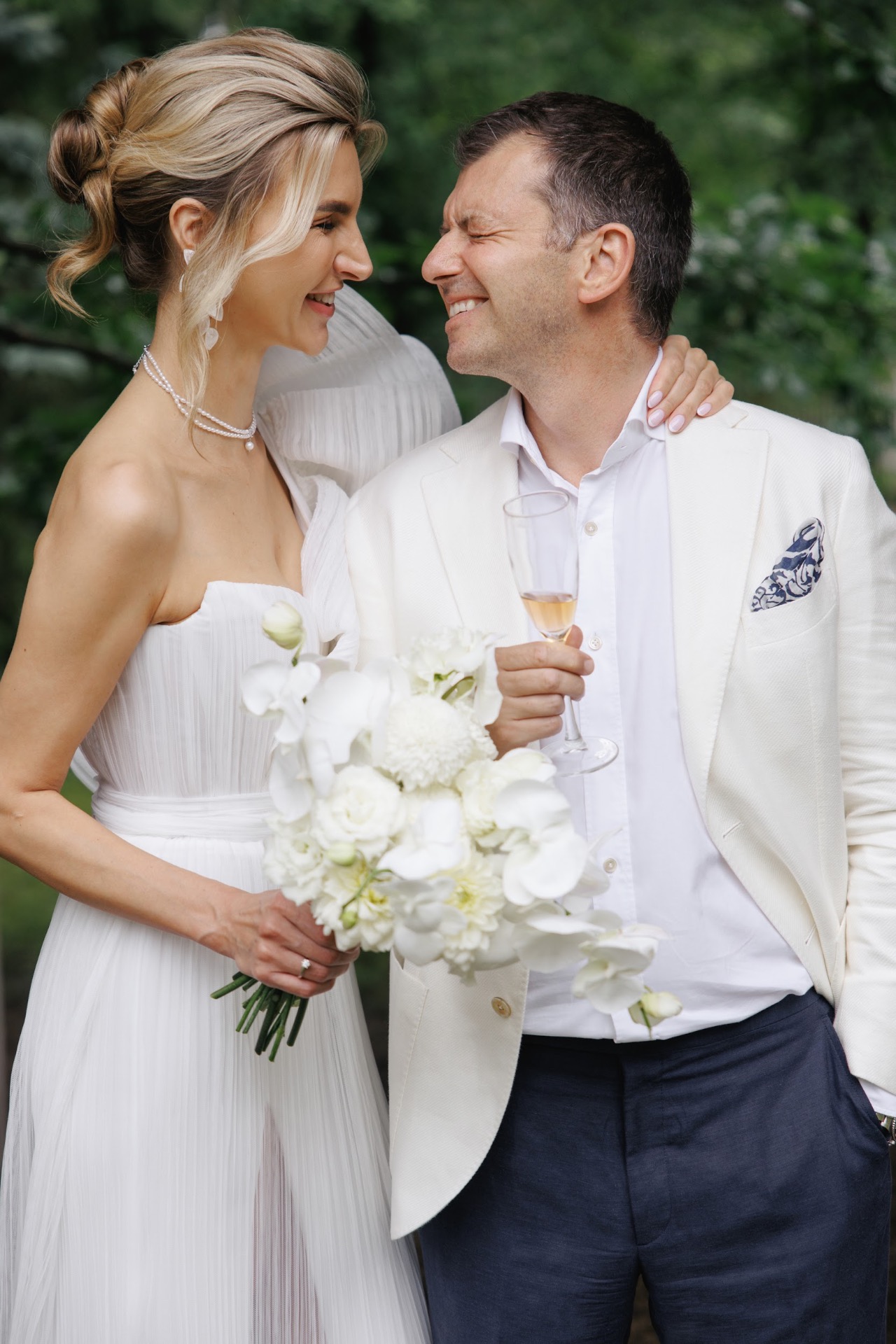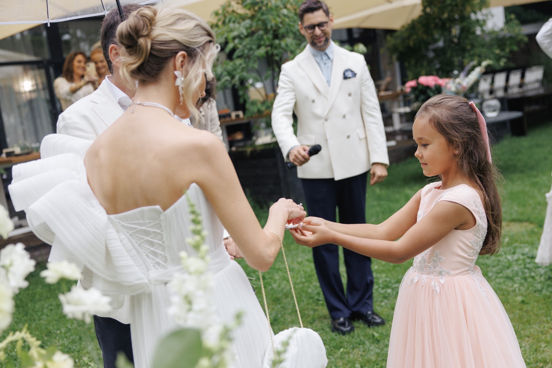 В день свадьбы лил дождь, это было не запланировано. Но наша команда не растерялась, столы разместили внутри ресторана, а танцы и кавер-группа прошли на улице. Я очень хотела, чтобы все танцевали на траве, и, к счастью, к началу церемонии дождь почти закончился, и мы смогли воплотить эту идею!