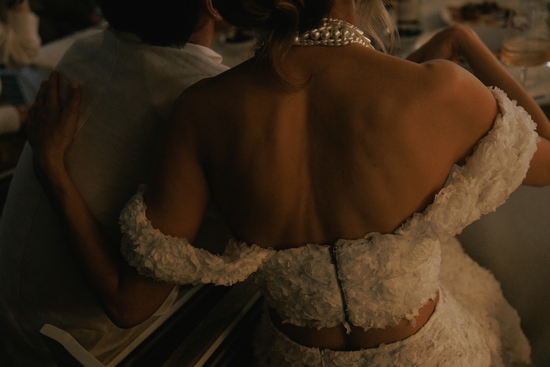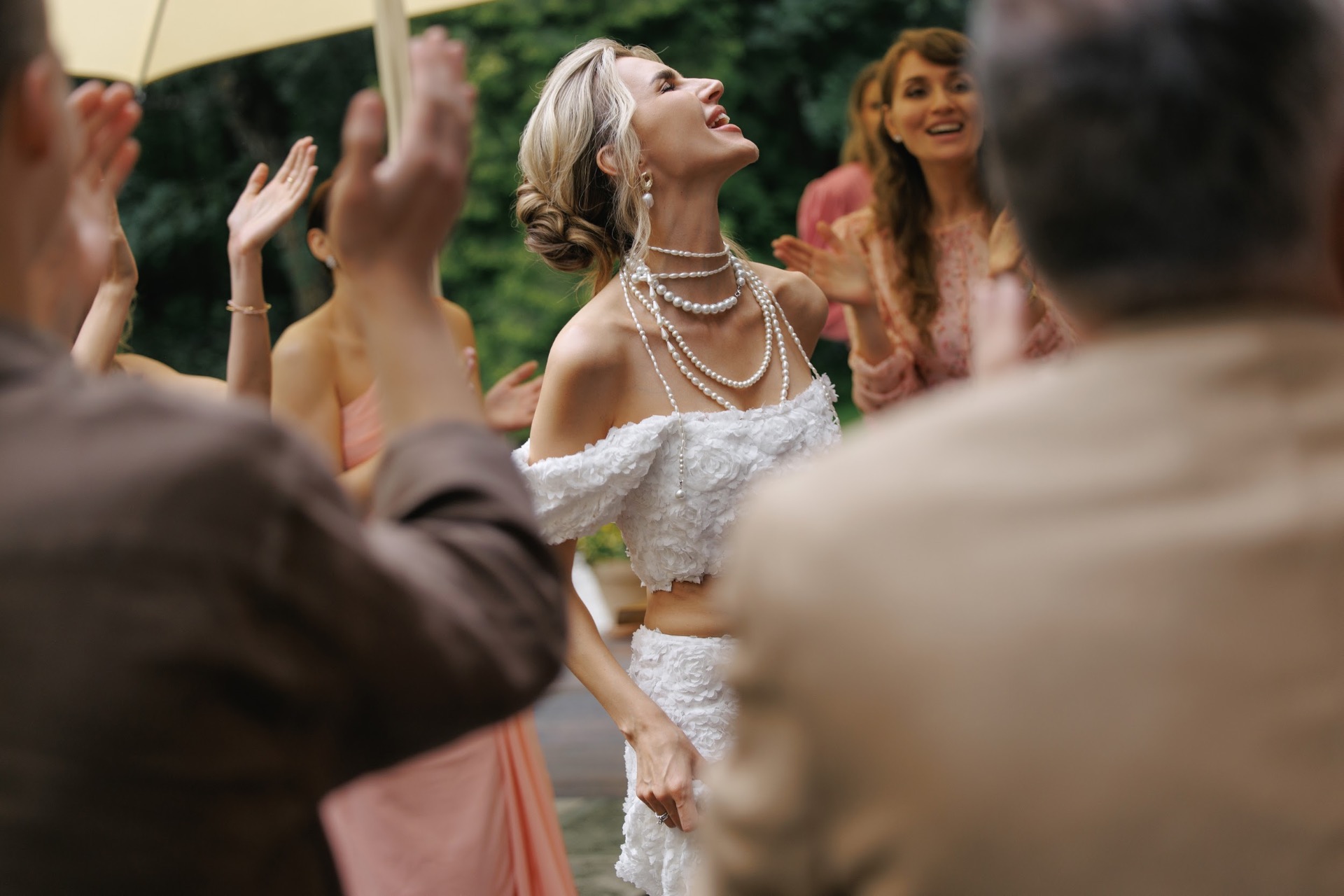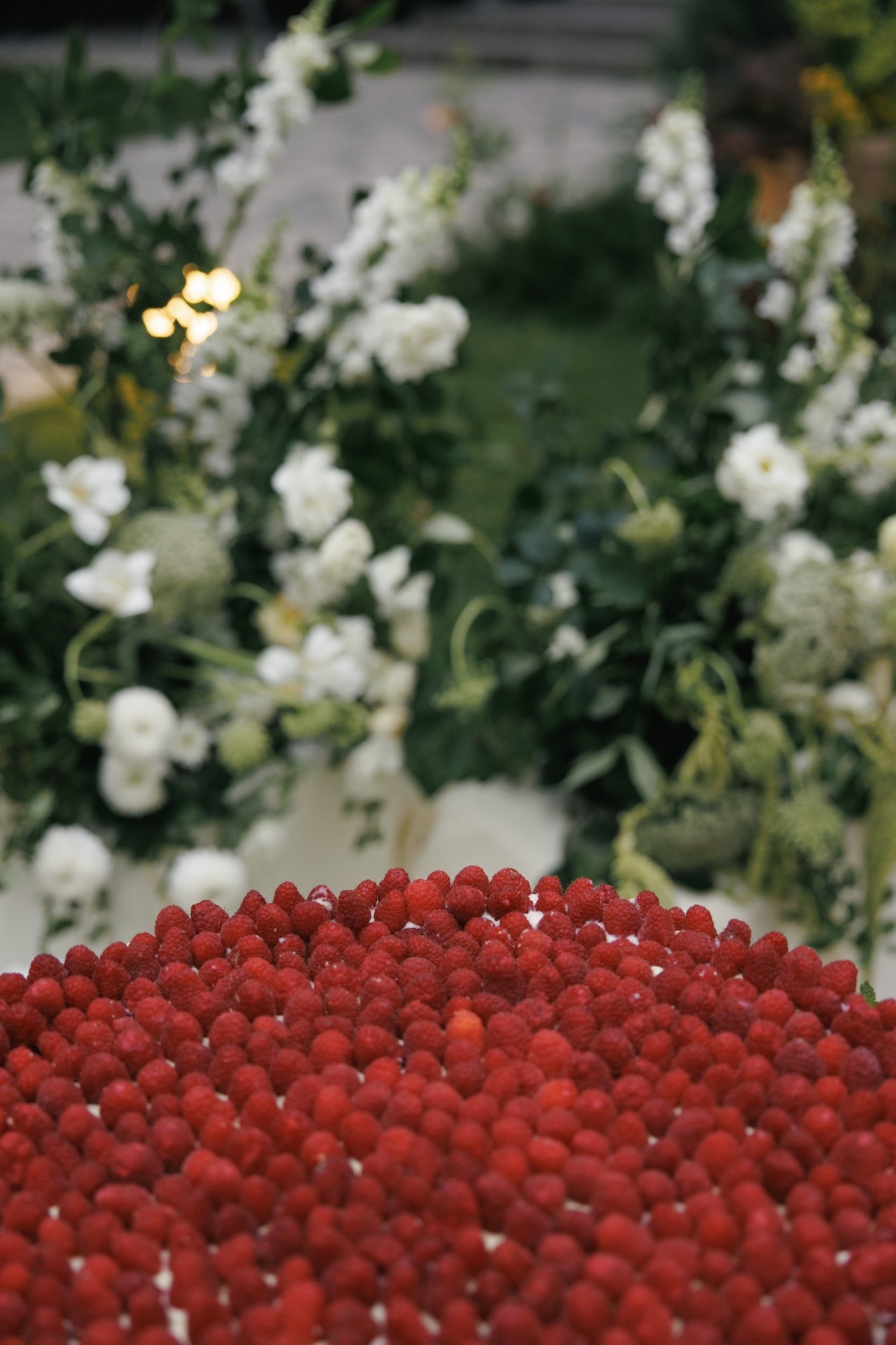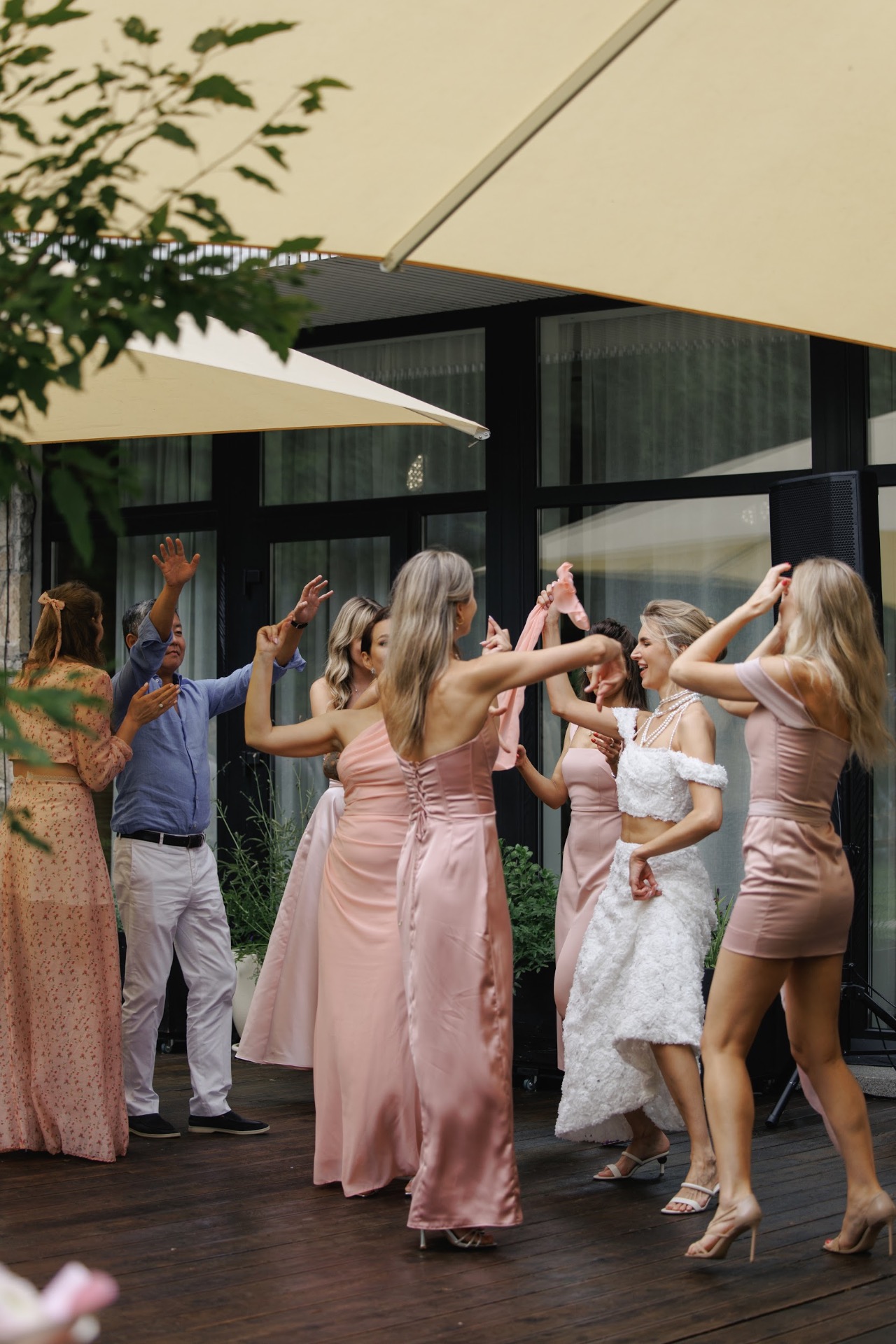 В день свадьбы лил дождь, это было не запланировано. Но наша команда не растерялась, столы разместили внутри ресторана, а танцы и кавер-группа прошли на улице. Я очень хотела, чтобы все танцевали на траве, и, к счастью, к началу церемонии дождь почти закончился, и мы смогли воплотить эту идею!