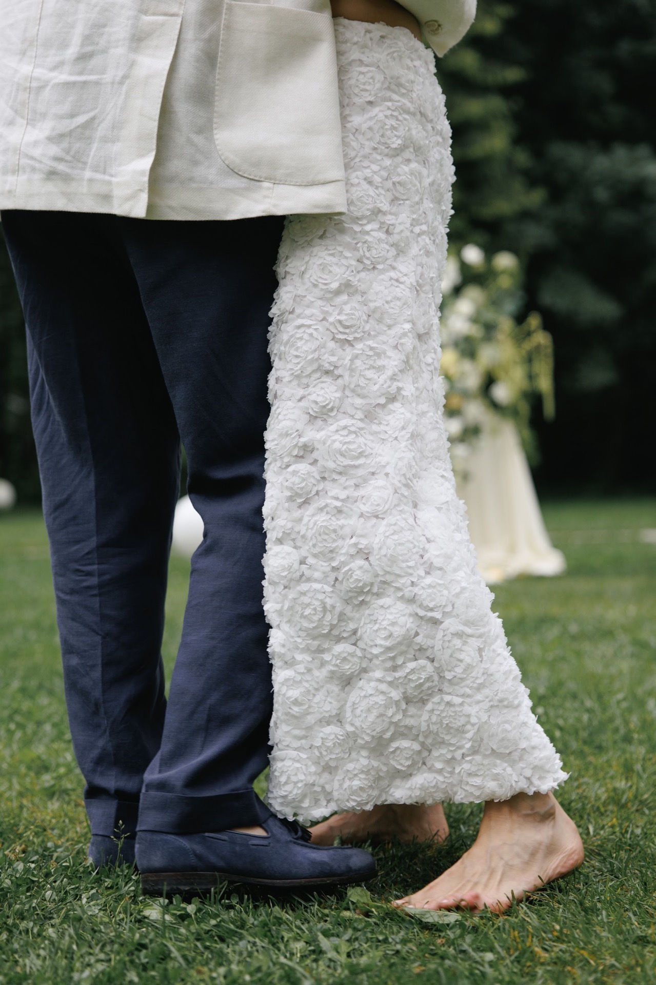 Образ жениха был не классическим, а в расслабленном, итальянском стиле. Образ состоял из белого льняного пиджака Eleventy, тёмно-синих брюк и лоферов.
