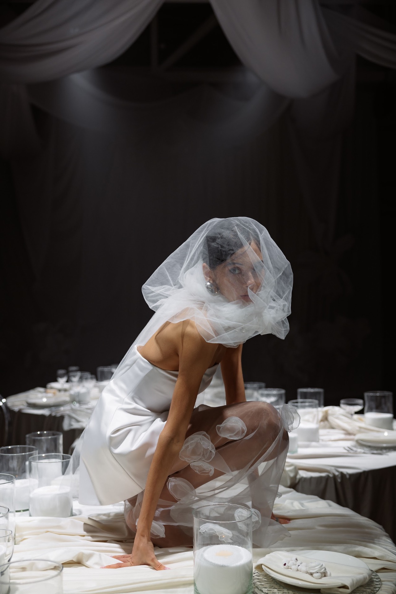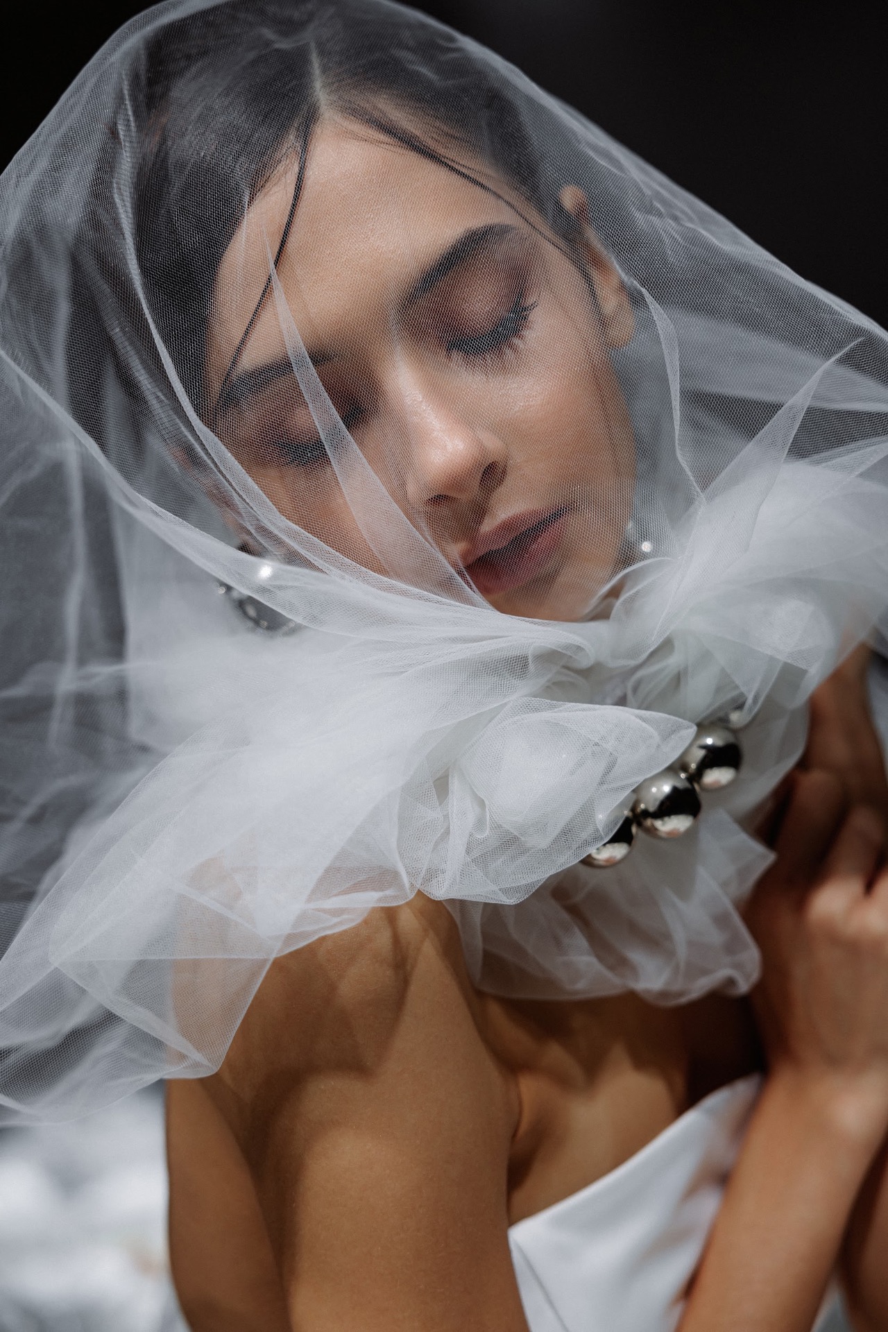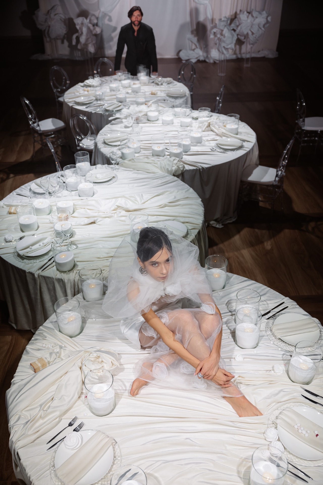 Идея контрастности была продолжена и в образах жениха и невесты. В качестве выразительных средств остались лишь текстура и форма — ничего лишнего, только суть. У него — строгий total black, где геометричная роза-брошь стала единственным, но ярким акцентом. У неё — мягкие, обволакивающие складки шёлка, словно дыхание, превращающее движение в поэзию.