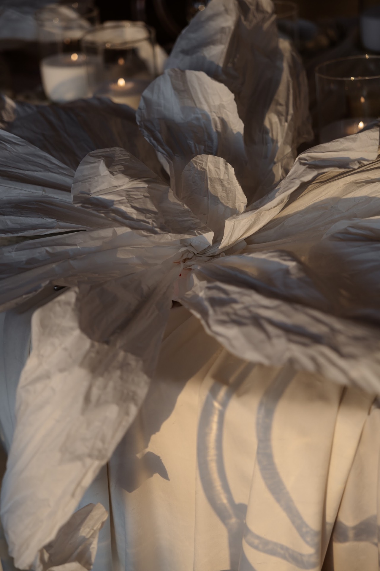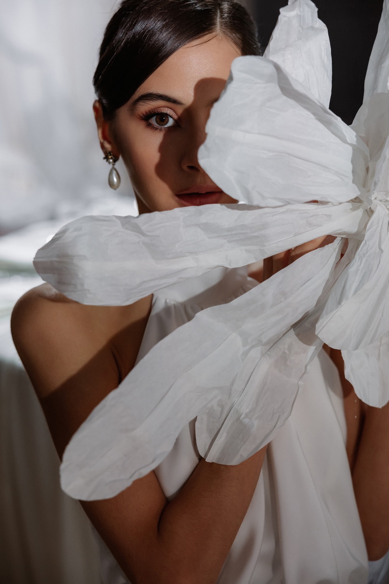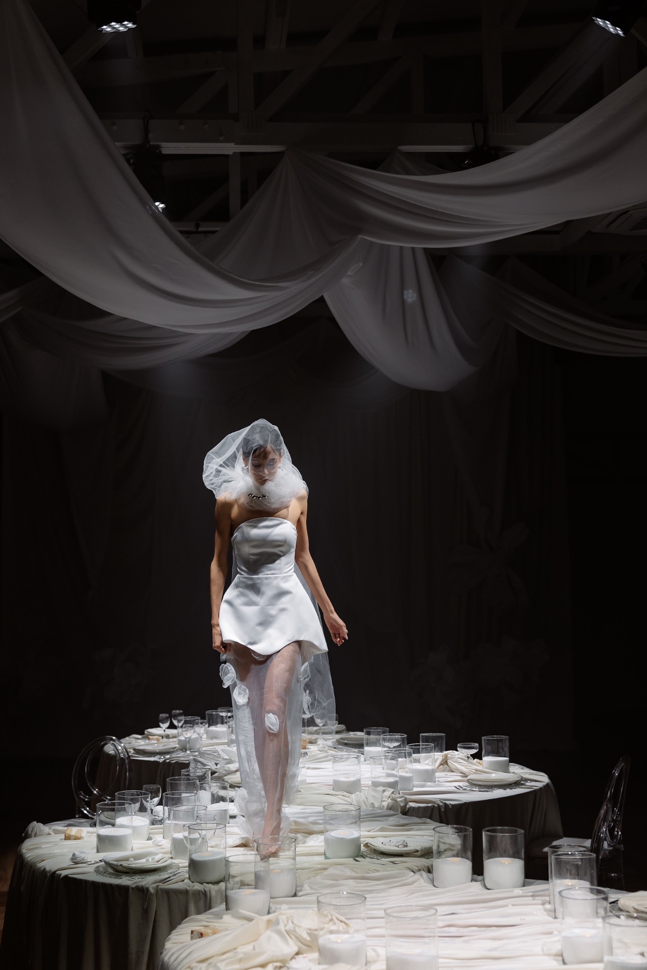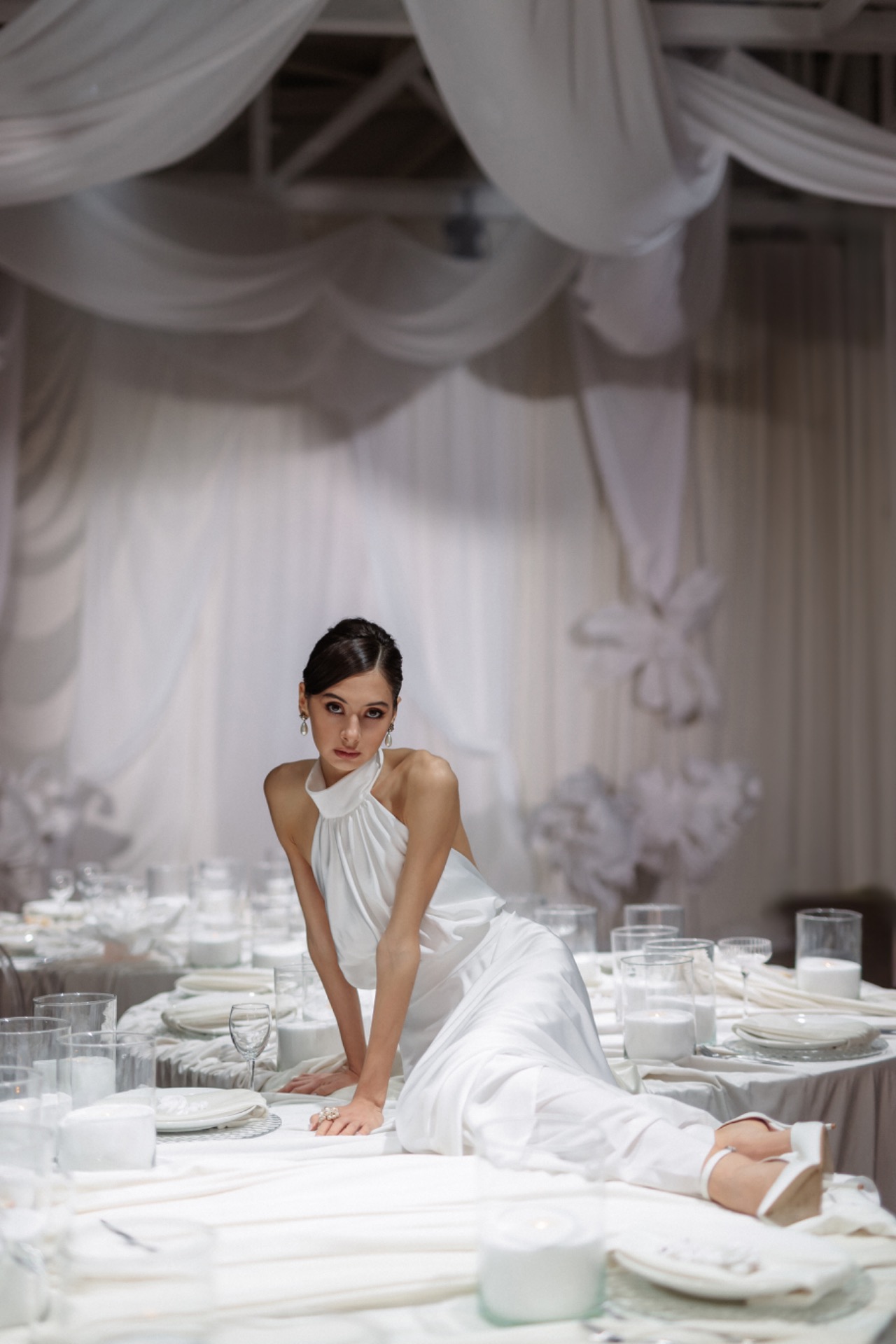 Идея контрастности была продолжена и в образах жениха и невесты. В качестве выразительных средств остались лишь текстура и форма — ничего лишнего, только суть. У него — строгий total black, где геометричная роза-брошь стала единственным, но ярким акцентом. У неё — мягкие, обволакивающие складки шёлка, словно дыхание, превращающее движение в поэзию.