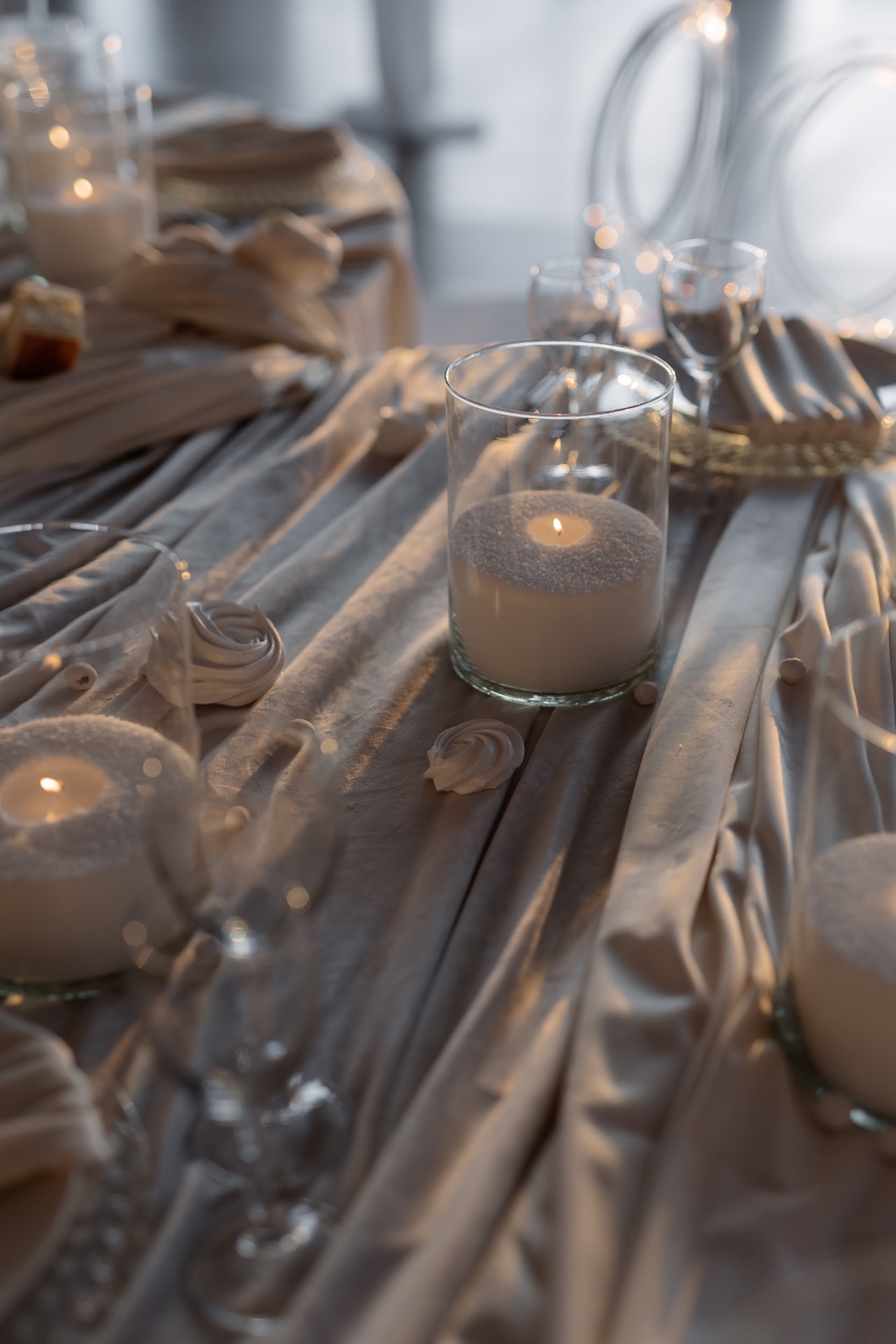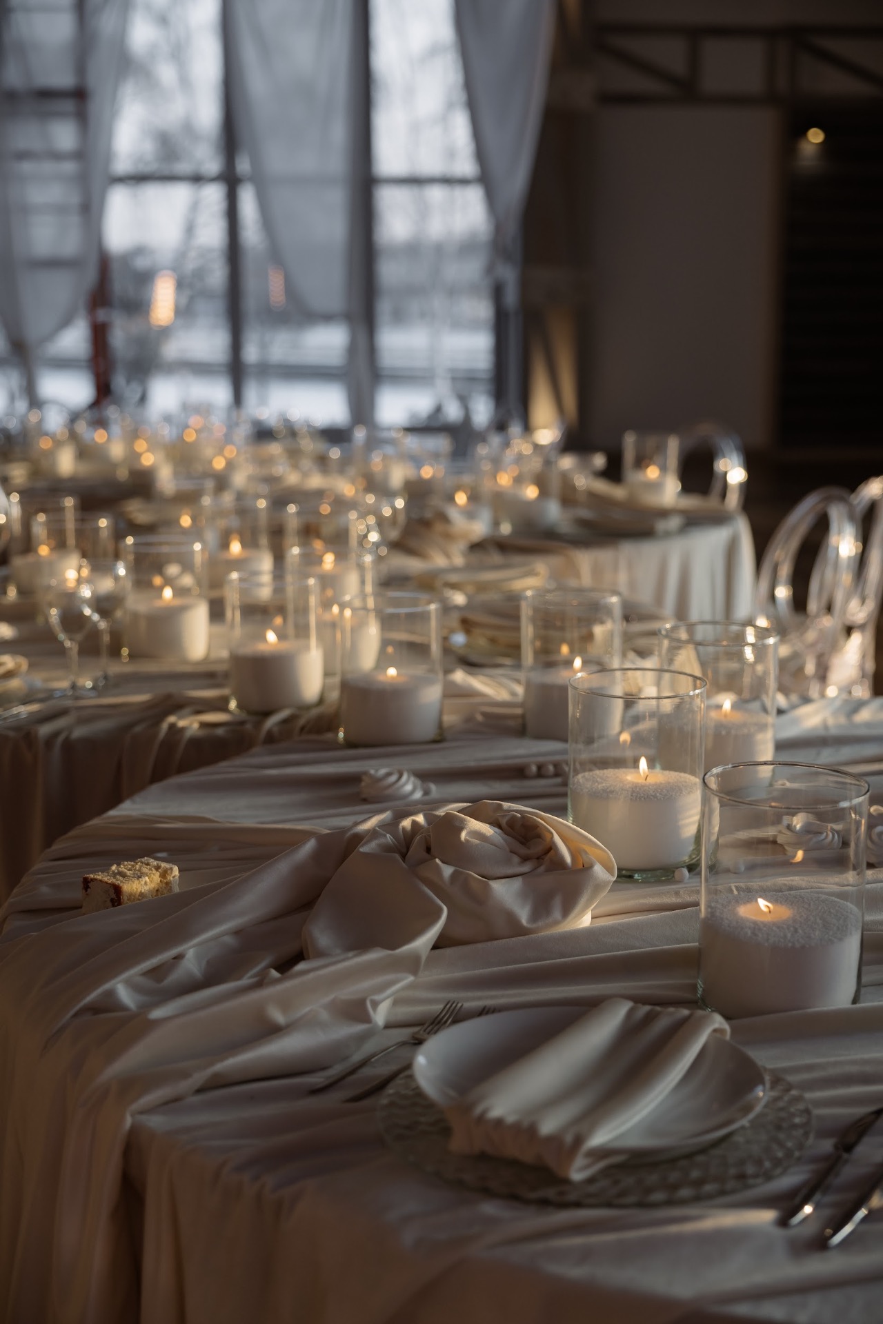 Много ткани: текучий шёлк, прозрачная органза и структурная хрустящая тафта, много свечей, много хрусталя. Это благородное сочетание стало основой оформления банкетной зоны и места церемонии, создав уникальное настроение торжественности и высокого стиля.