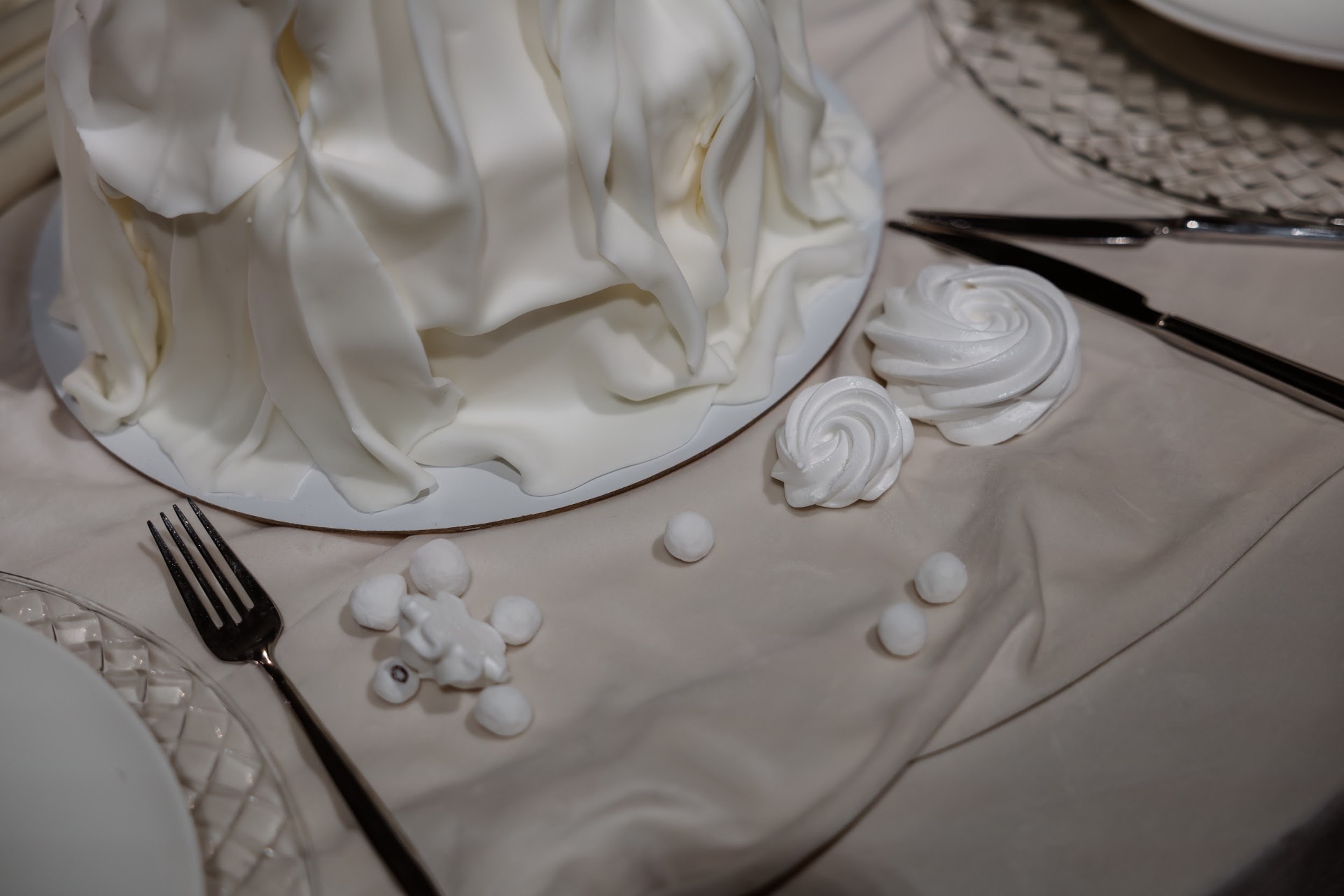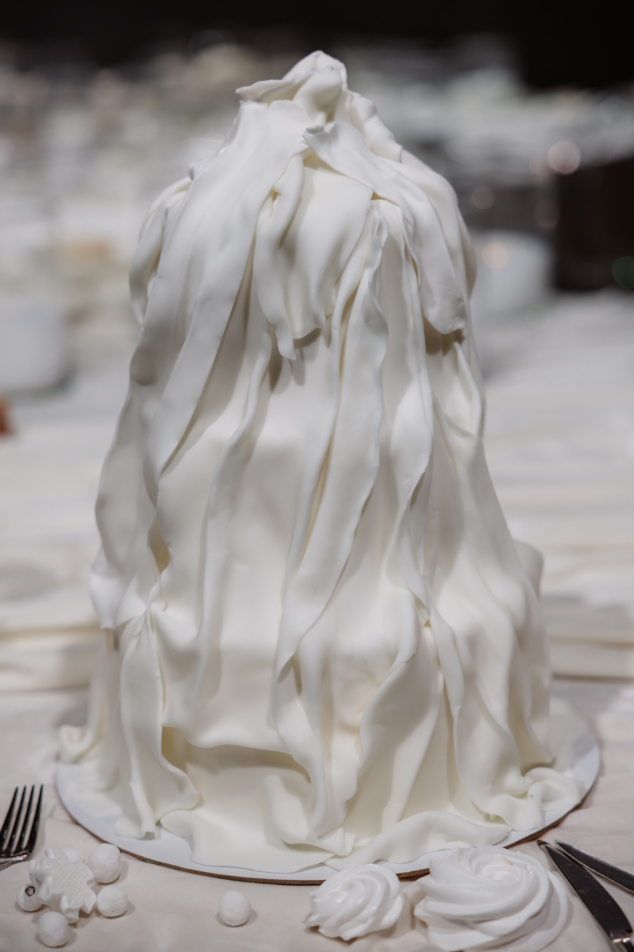 Торт одновременно напоминал и очертания платья невесты, и растаявшую свечу — символ хрупкости момента и тепла, которое остаётся навсегда.