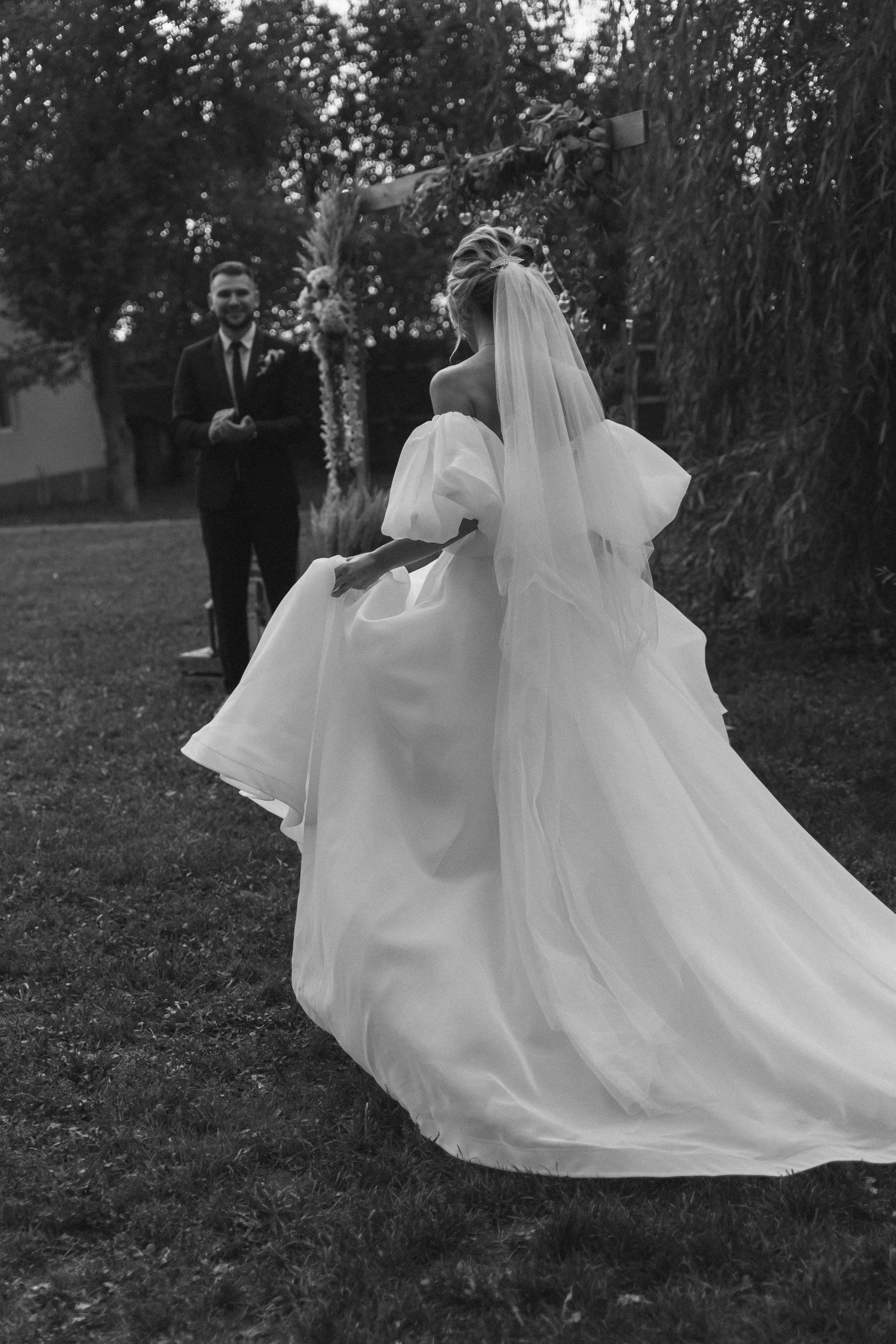 Это вариант для романтичных натур, которые хотят соблюсти традиции и добавить изюминки выездной церемонии. Действительно, видеть удивление и восхищение в глазах жениха, пока ты идёшь к свадебной арке – это ни с чем не сравнимые эмоции, которые навсегда останутся в твоём сердце.