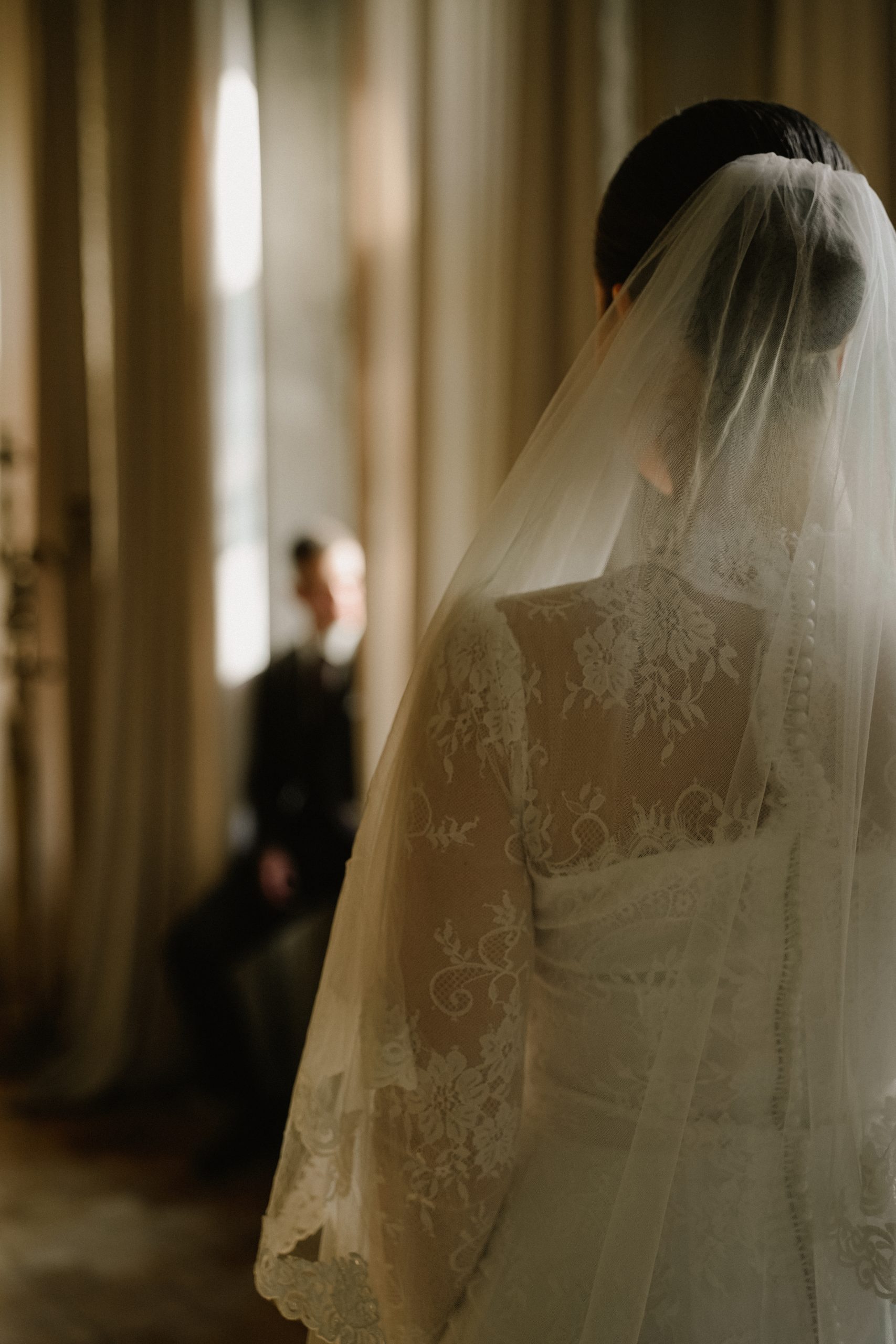 Такой формат подходит для съёмки в отеле. Невеста стоит перед окном или на балконе, спиной к двери, а жених заходит в номер с букетом в руках.