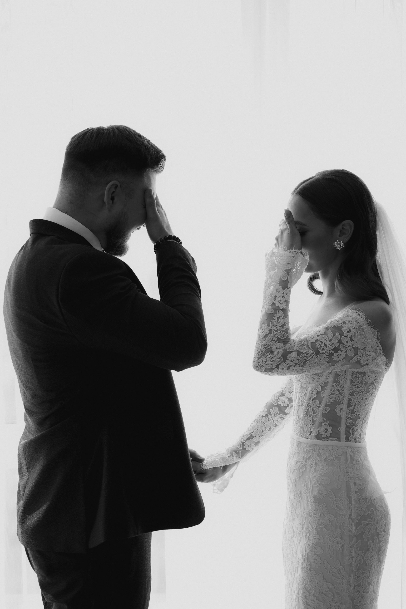 Во время этого момента эмоции захлёстывают, и рука так и тянется к лицу — прикрыть улыбку, смахнуть слезу, коснуться щеки. Делайте это максимально легко и аккуратно: без растирания, без давления на кожу. Макияж в такие секунды особенно уязвим, а нам важно сохранить его свежим для всей съёмки и церемонии.