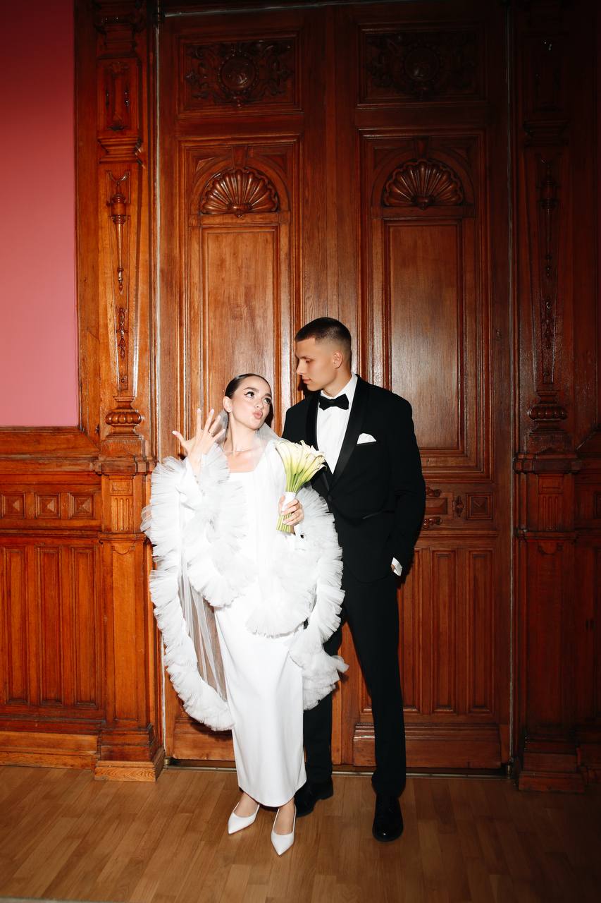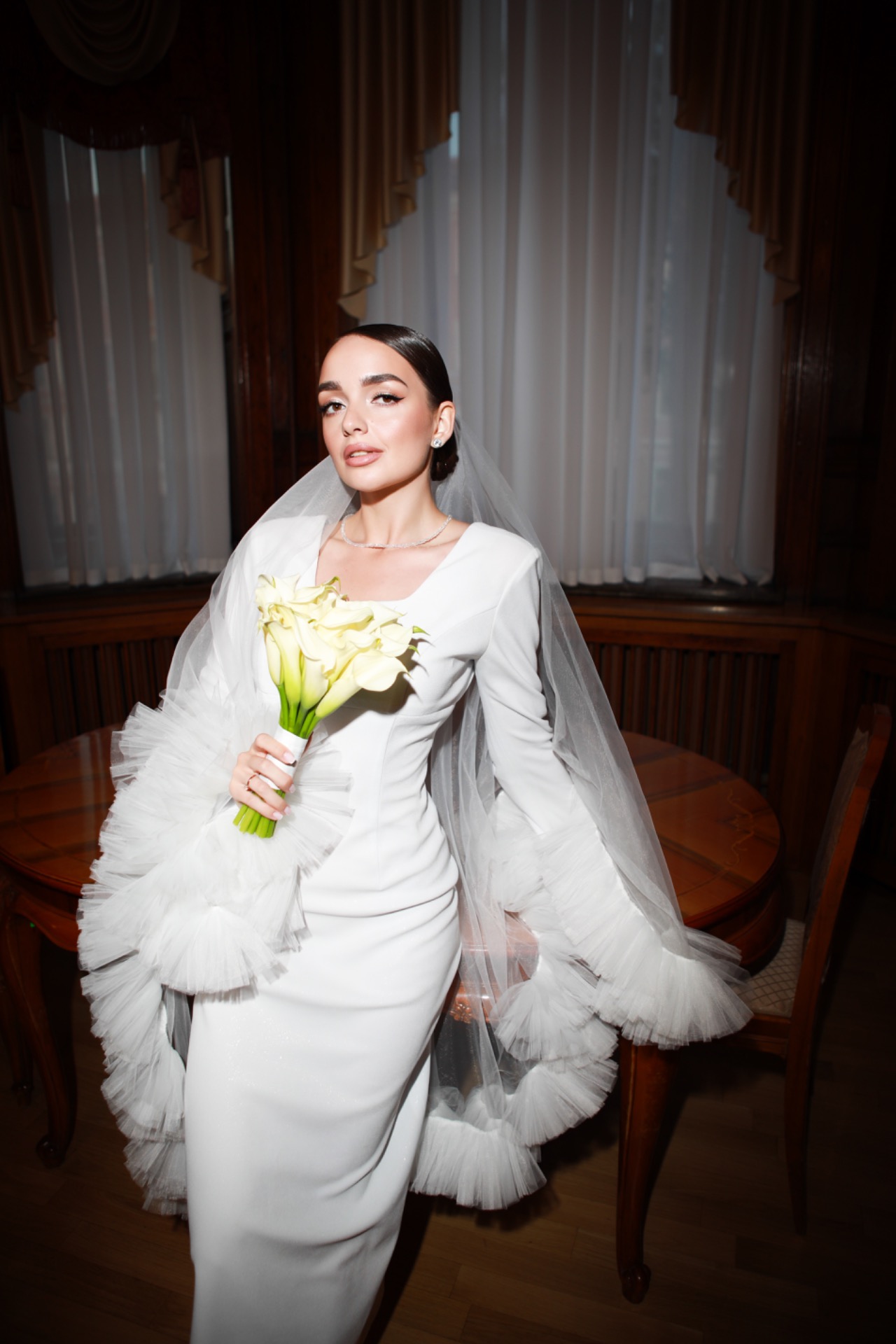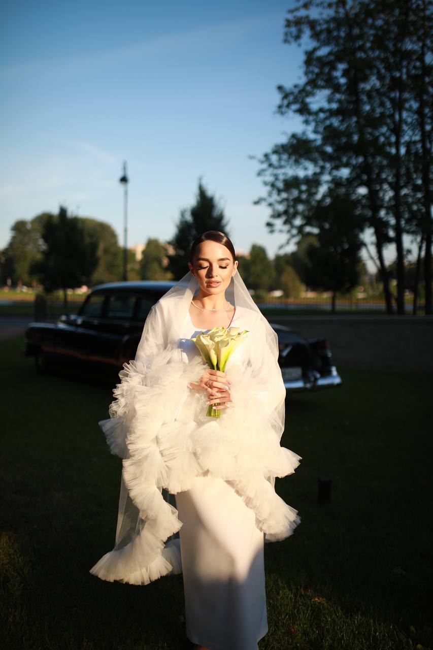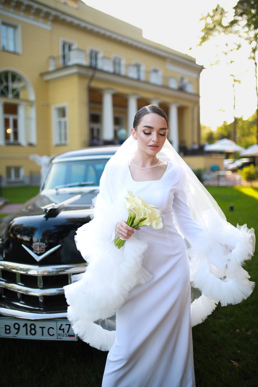 На саму свадьбу я надела платье-«рыбку» с длинным шлейфом и вышивкой. Оно идеально вписалось в интерьеры залов и в нашу концепцию.