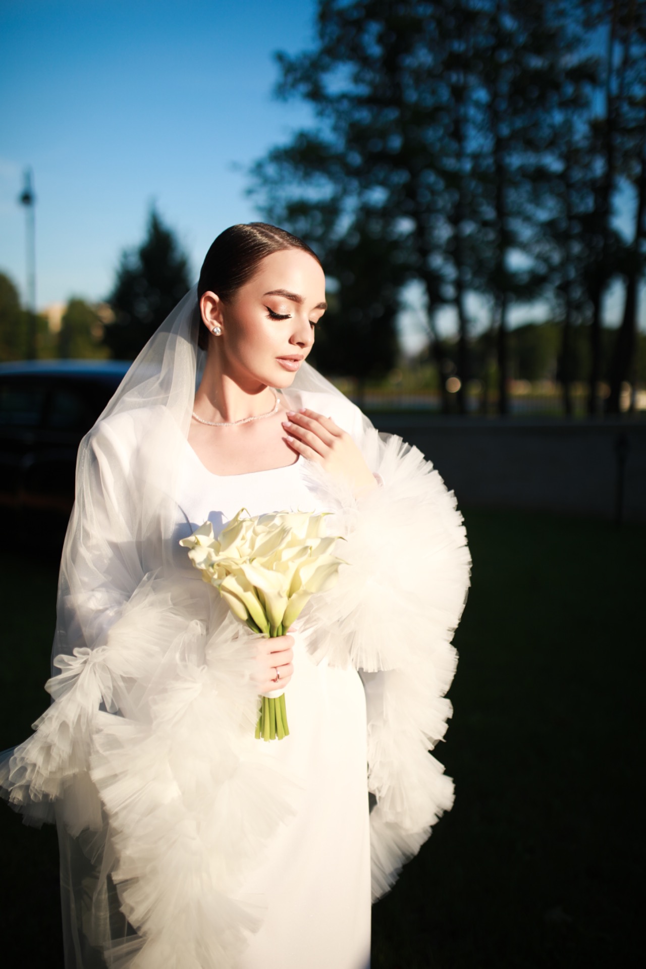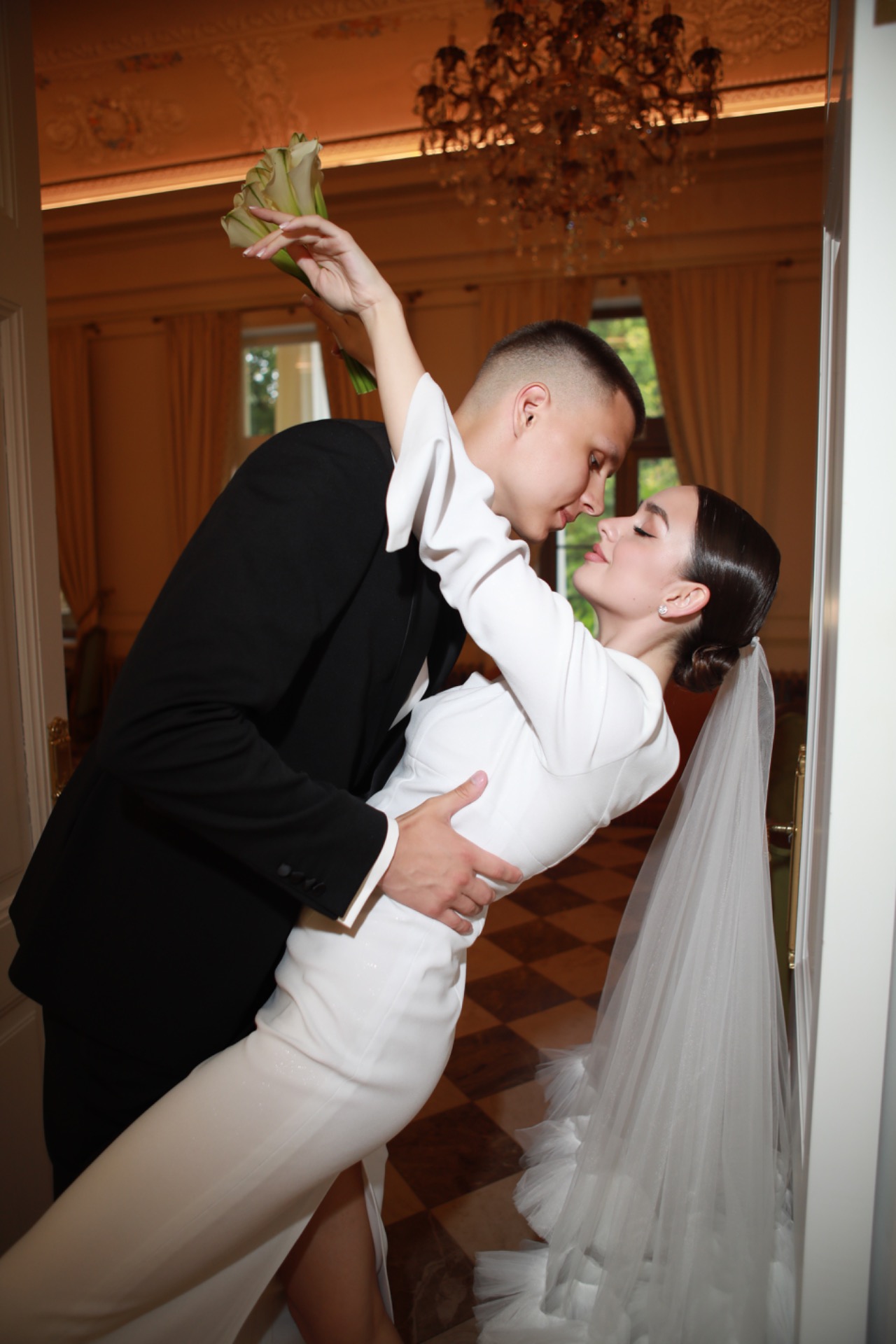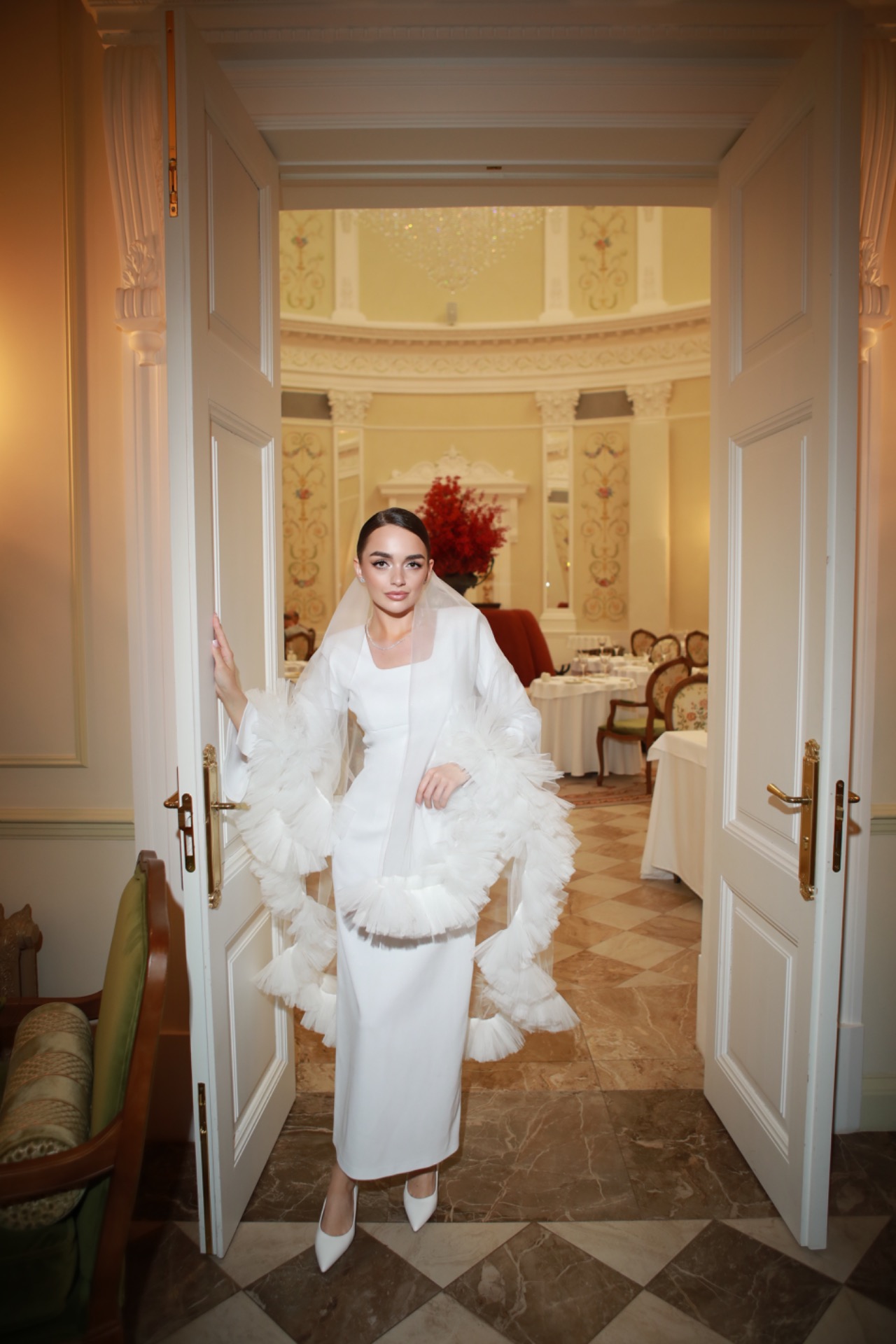 На саму свадьбу я надела платье-«рыбку» с длинным шлейфом и вышивкой. Оно идеально вписалось в интерьеры залов и в нашу концепцию.