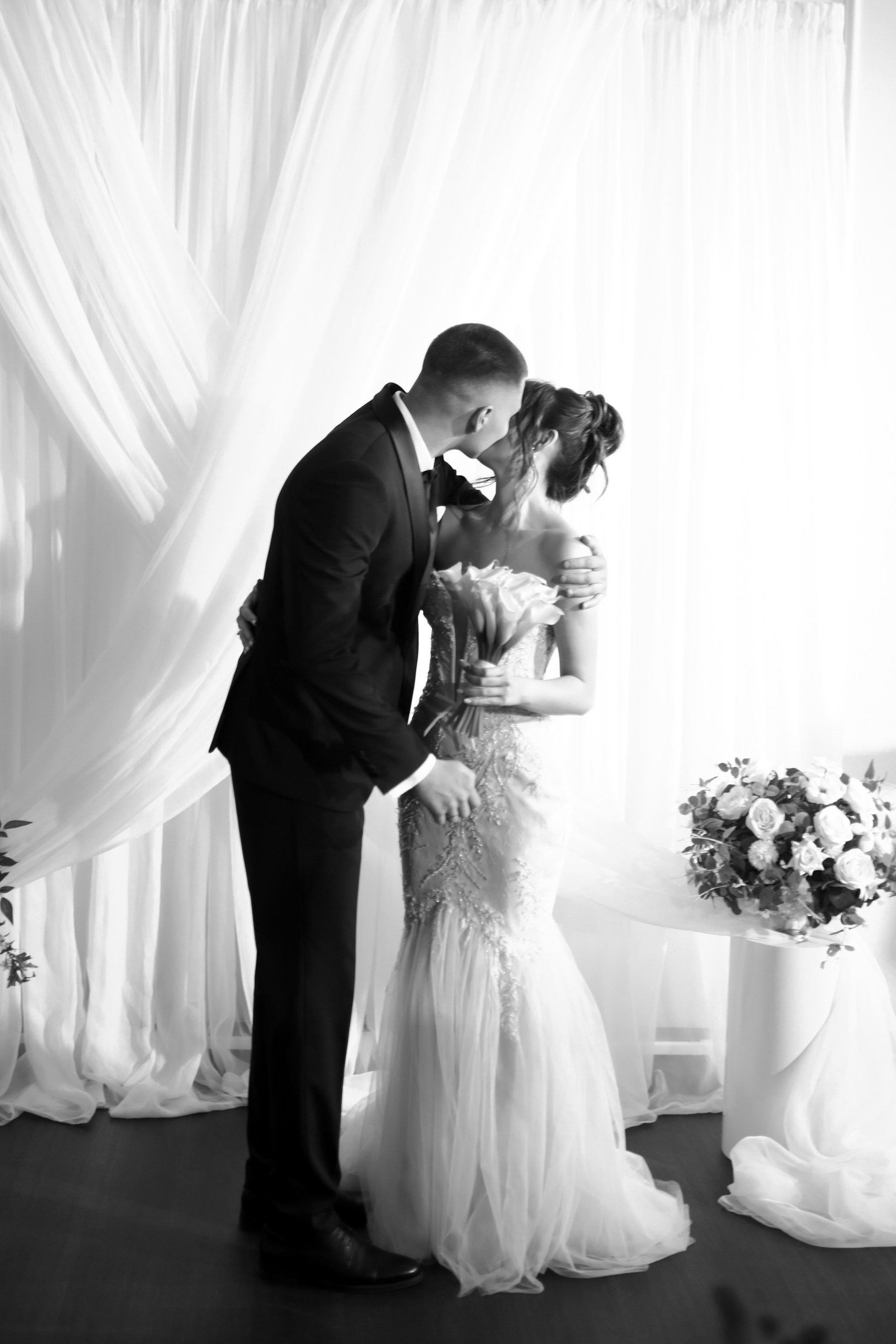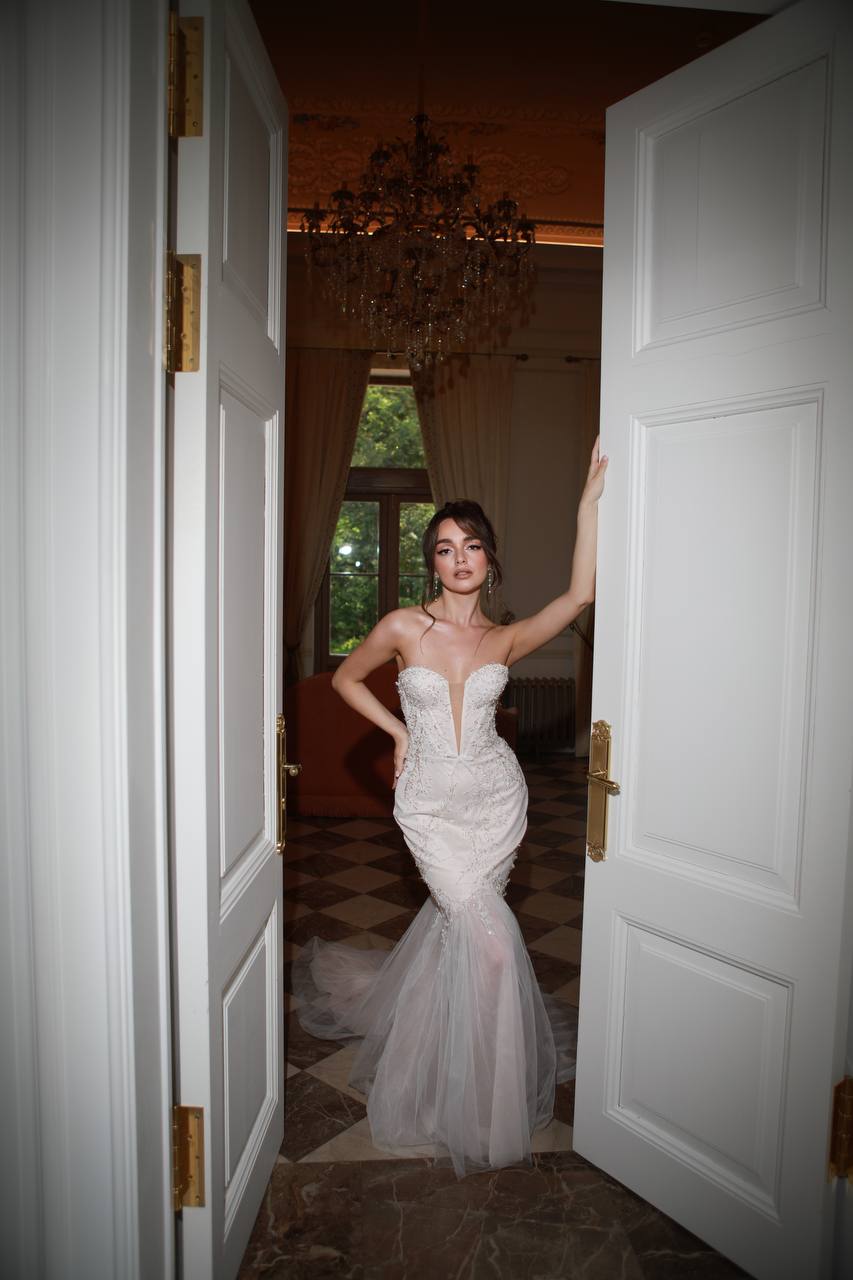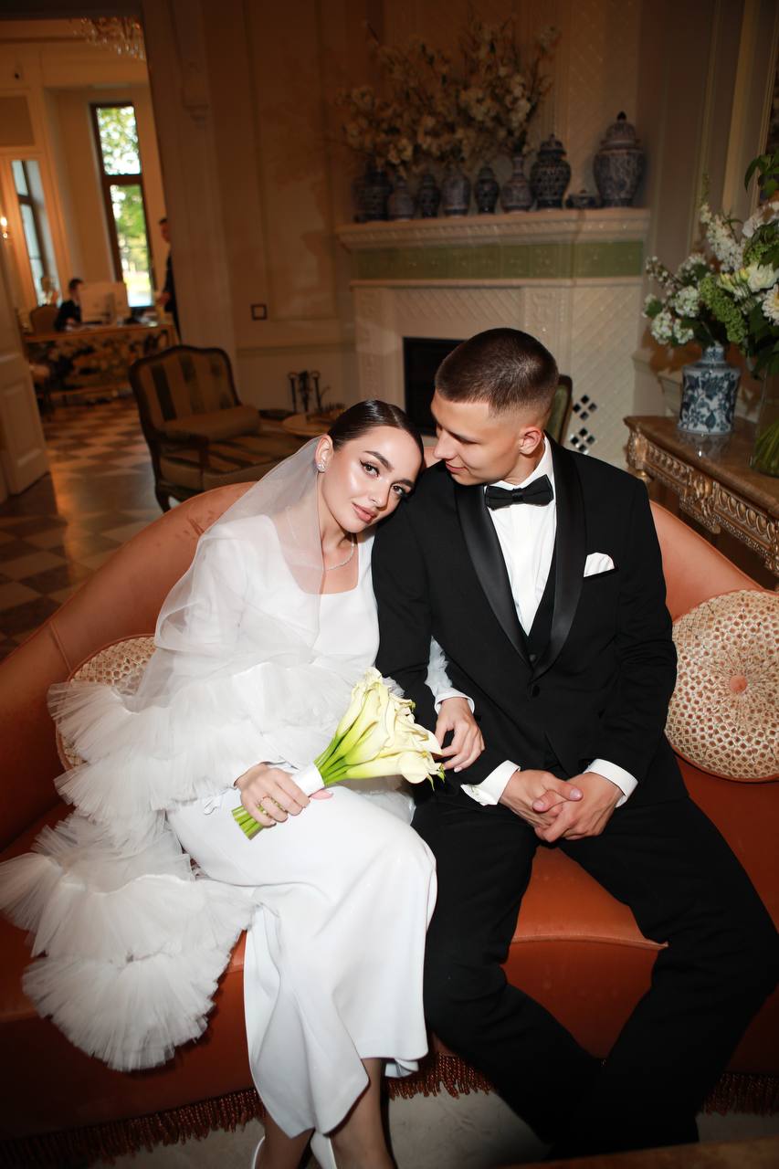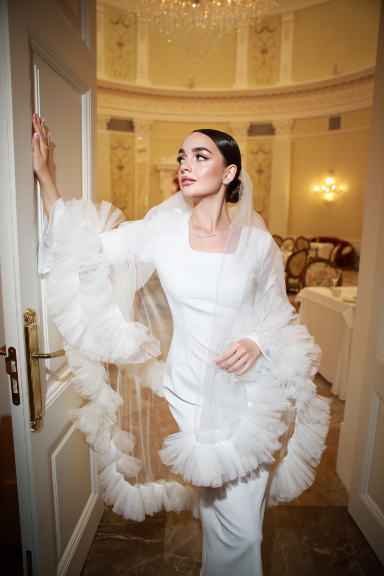 На саму свадьбу я надела платье-«рыбку» с длинным шлейфом и вышивкой. Оно идеально вписалось в интерьеры залов и в нашу концепцию.